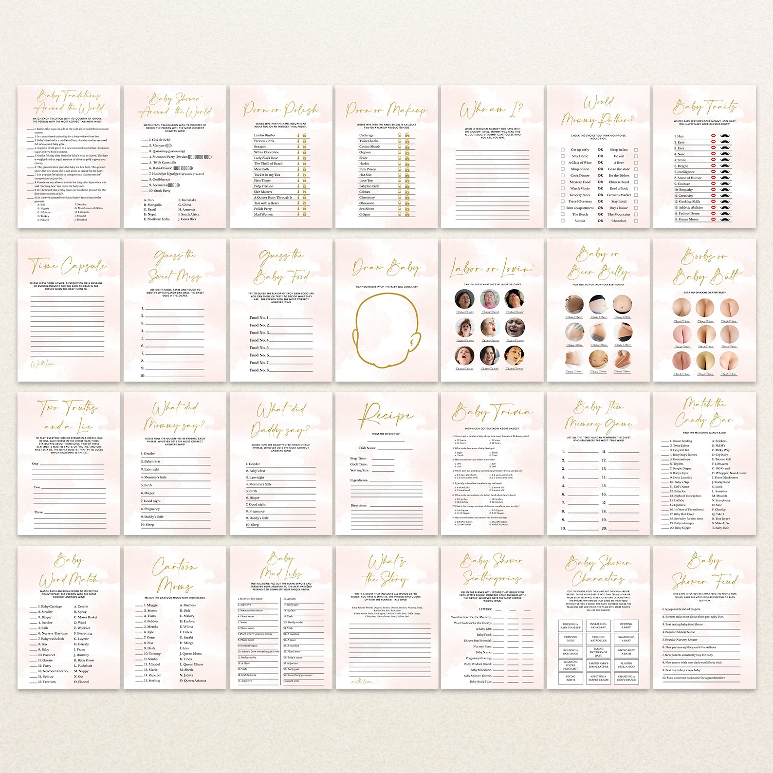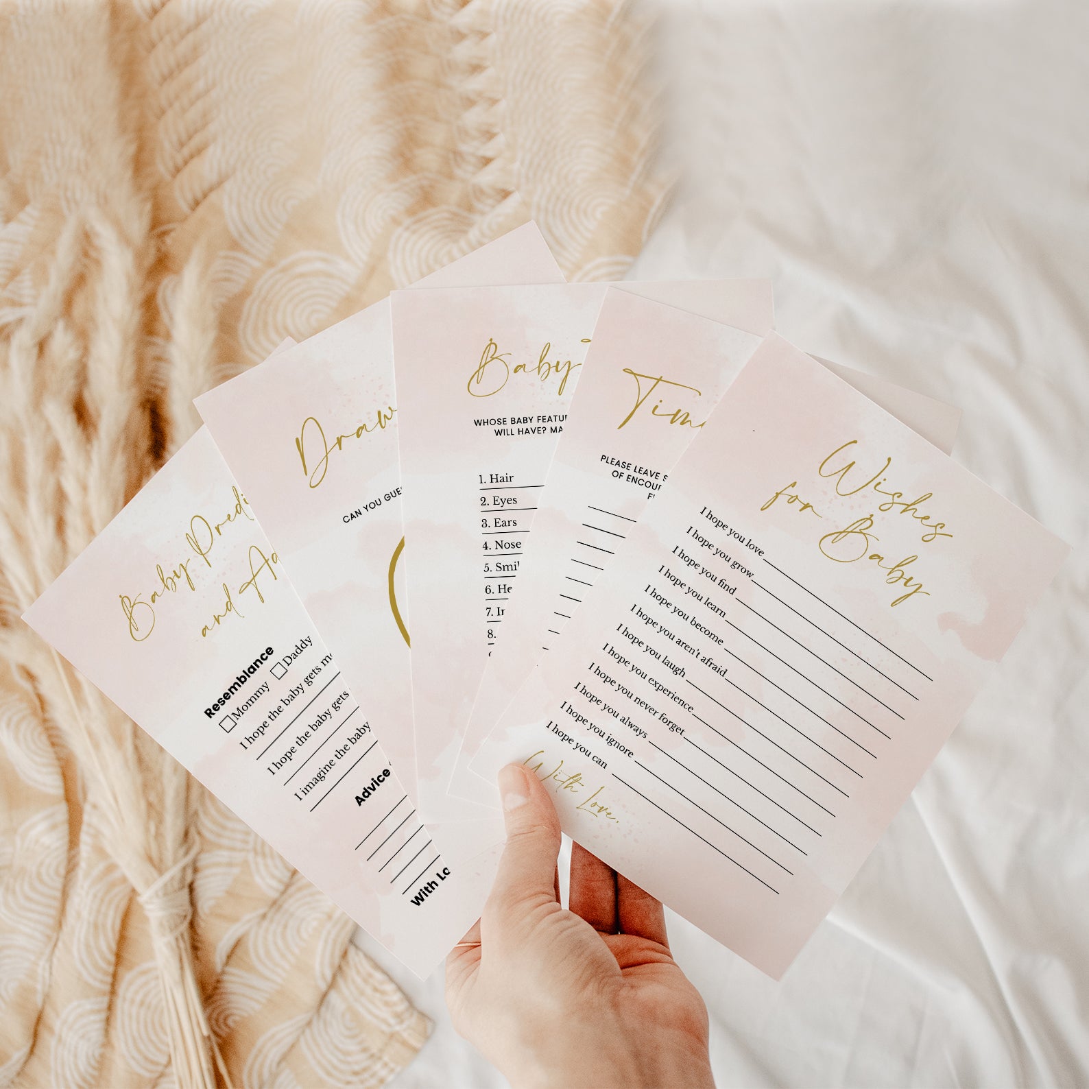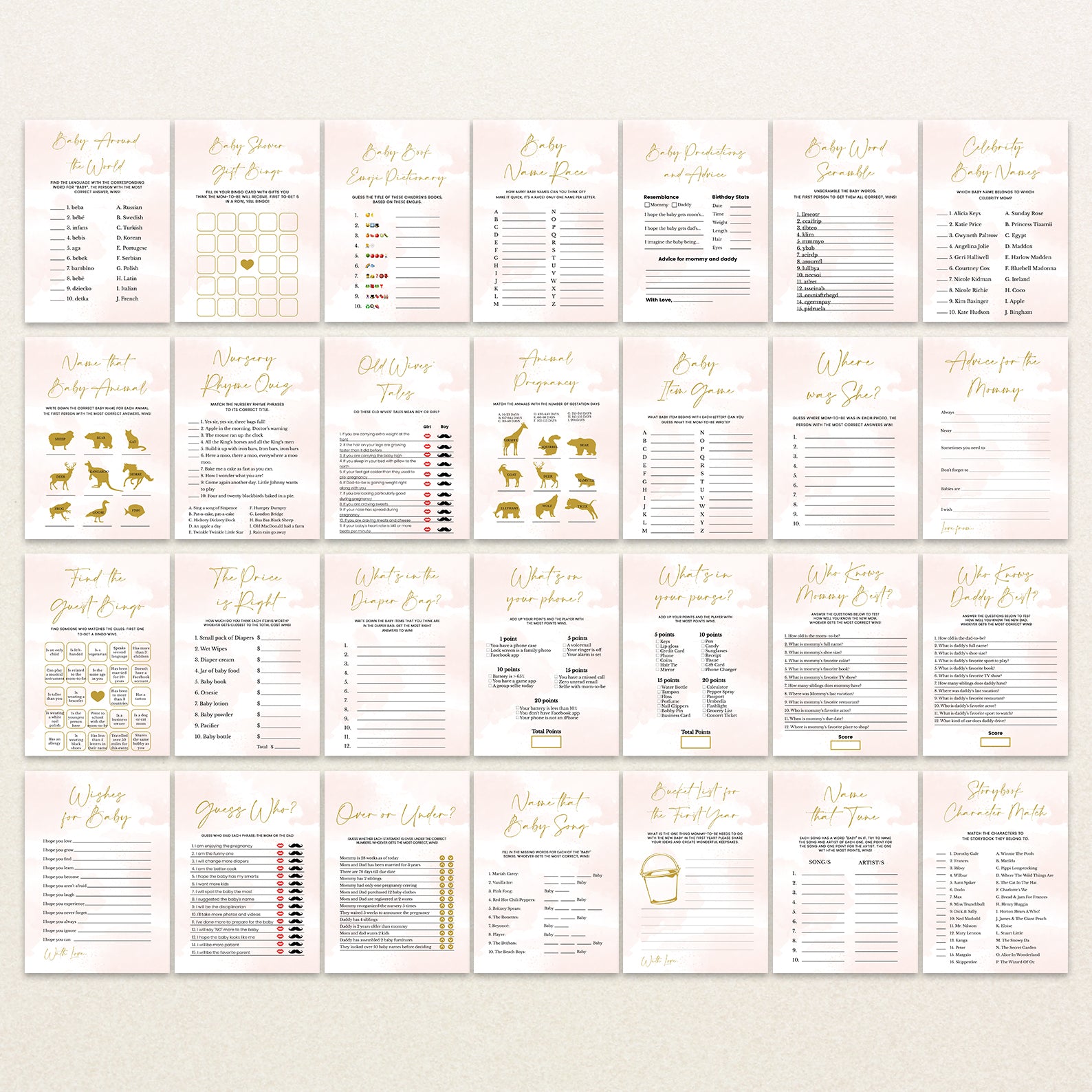 Stylish Pink Watercolor Baby Shower Game Bundle with Gold Accents