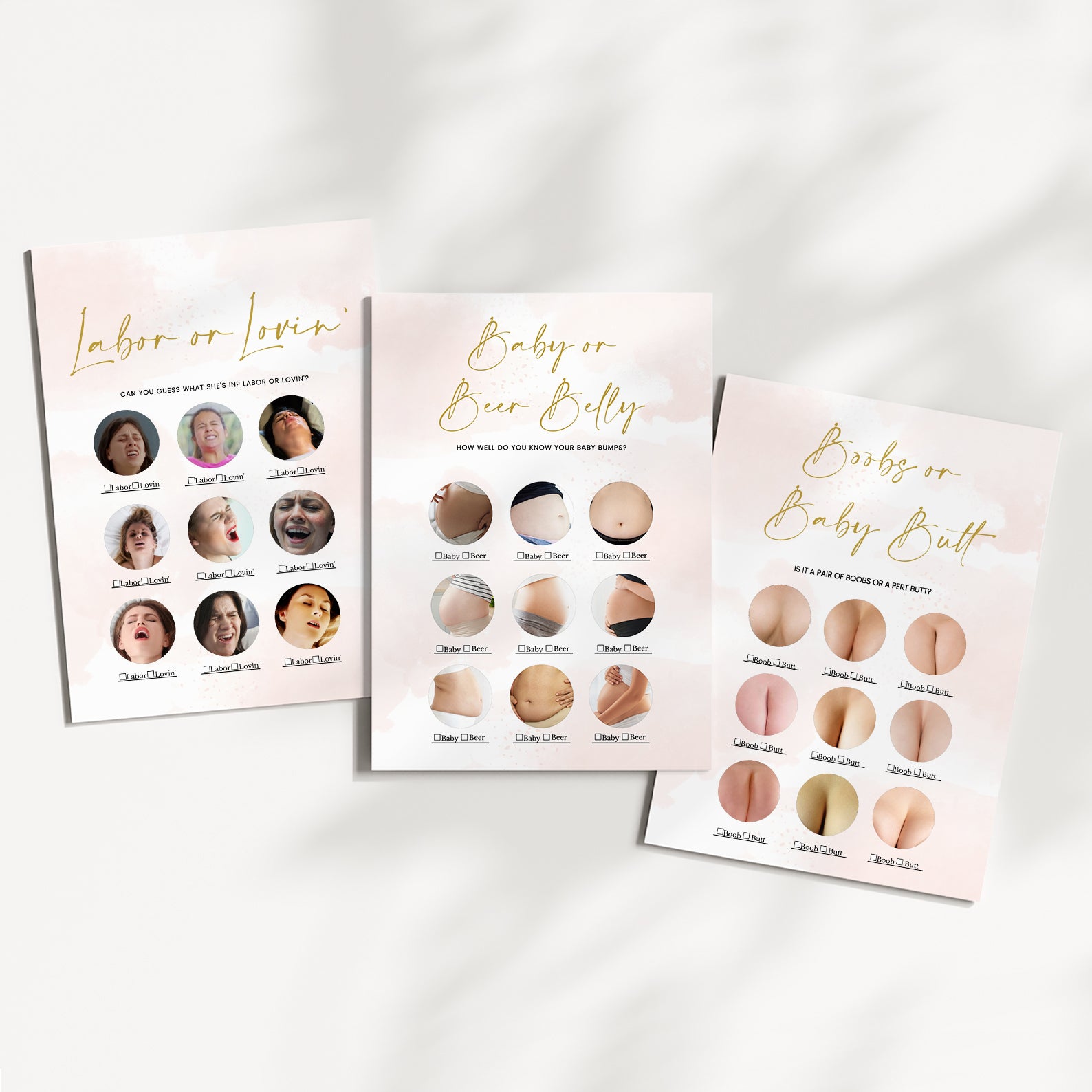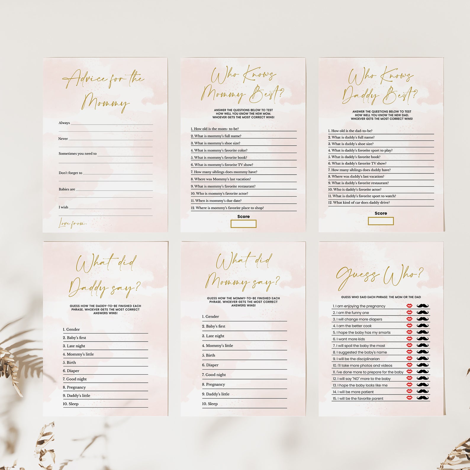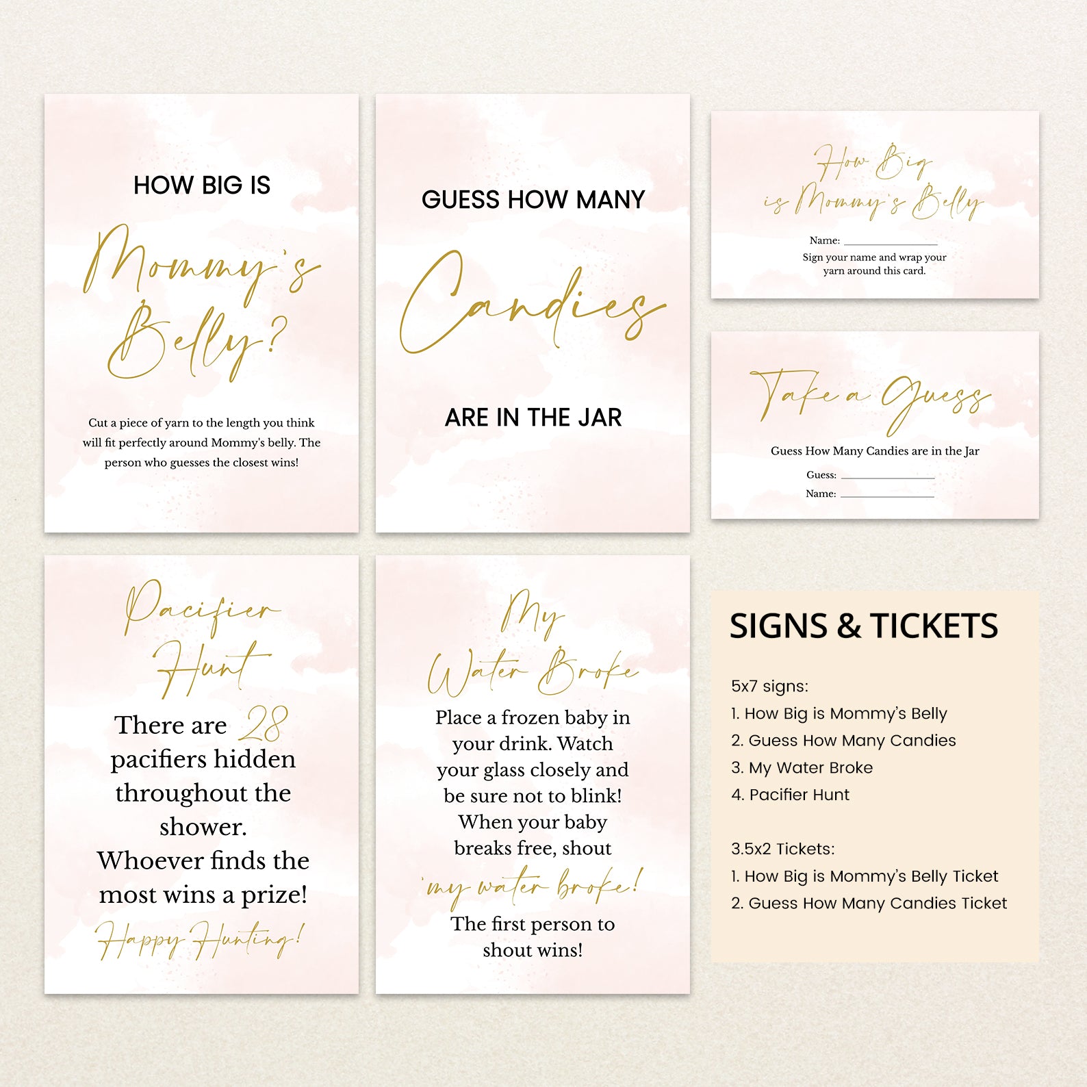 Stylish Pink Watercolor Baby Shower Game Bundle with Gold Accents