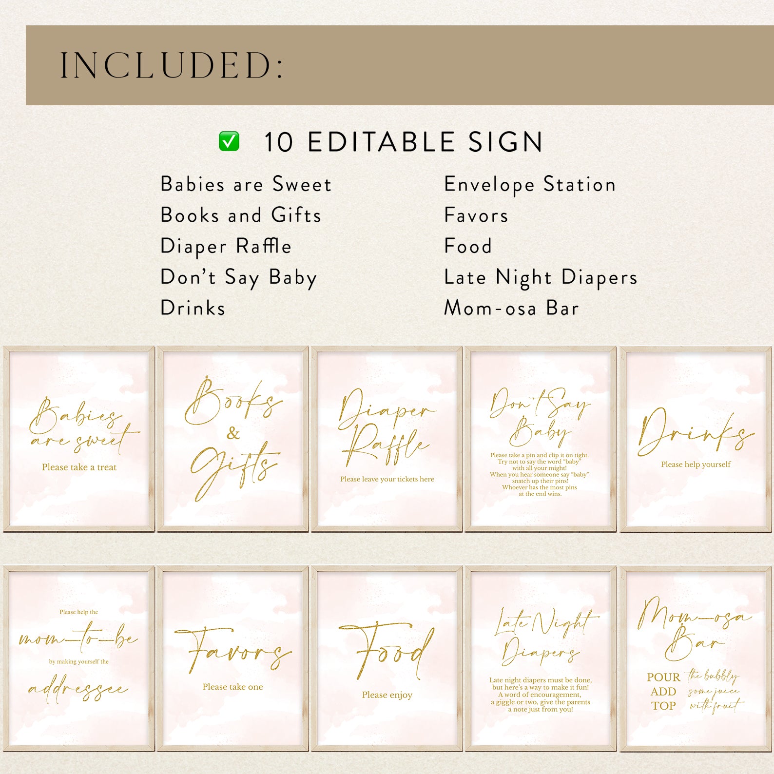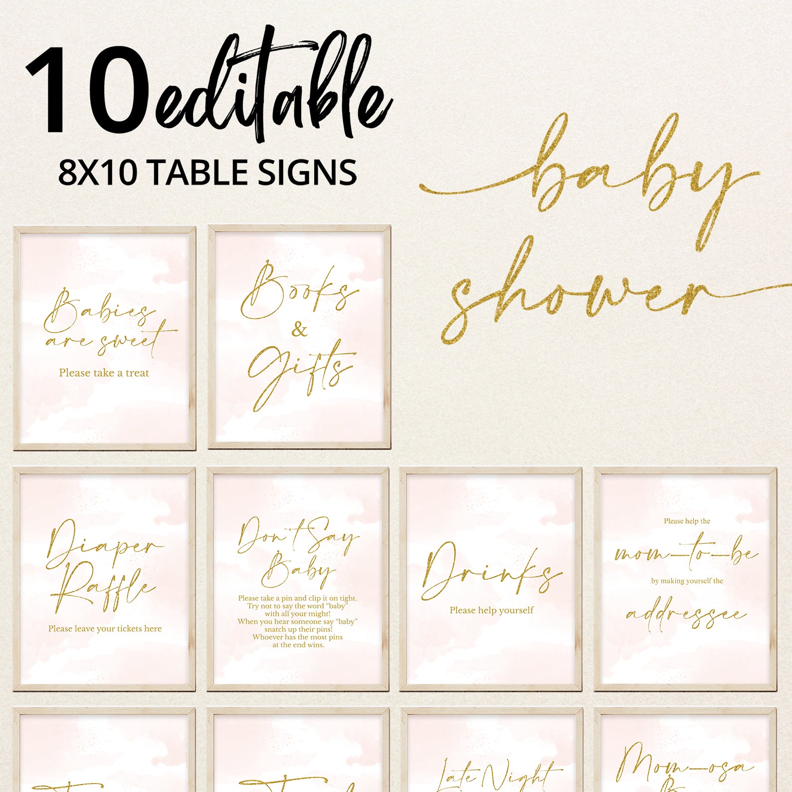 Elevate your baby shower décor with our pink and gold table sign bundle. This editable set of ten includes Babies Are Sweet, Books and Gifts, Diaper Raffle, Don’t Say Baby, Drinks, Envelope Station, Favors, Food, Late Night Diapers, and Mom-osa Bar. Designed with a pastel pink watercolor background and elegant gold accents, these signs add charm and function to your setup while guiding guests with style.