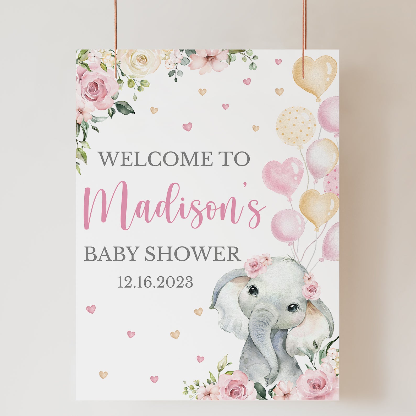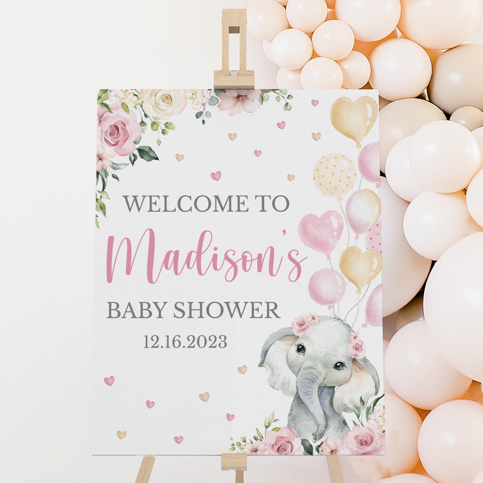 Set the tone for your baby shower with our adorable pink floral elephant welcome sign! Designed with soft pink and yellow accents, lush greenery, delicate hearts, and a sweet baby elephant carrying balloons, this sign creates a warm, festive entrance. Perfect for baby girl showers, it adds a charming touch to your décor while matching beautifully with invitations, games, and table signs for a coordinated celebration.