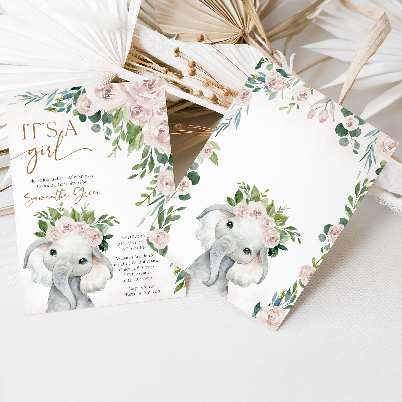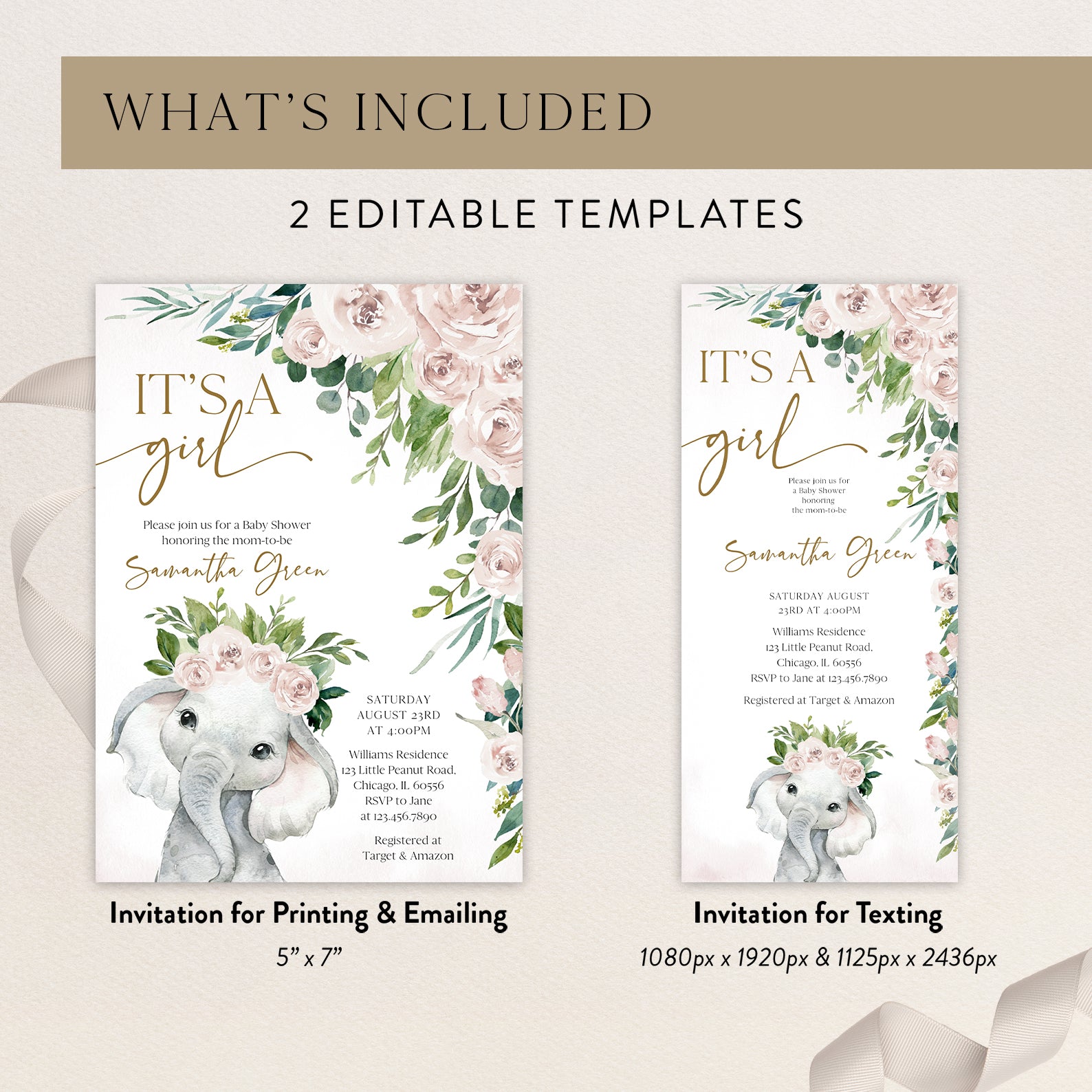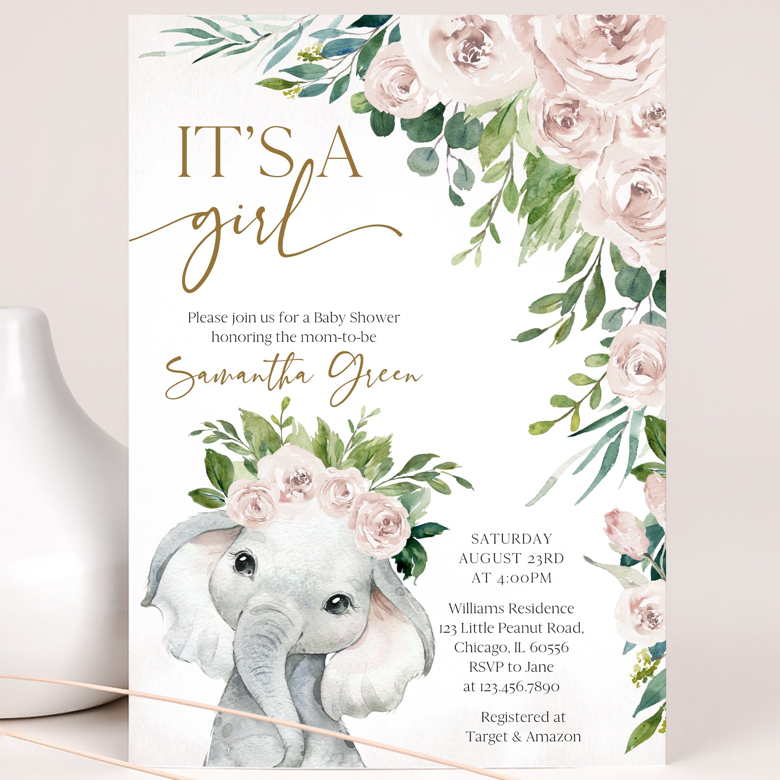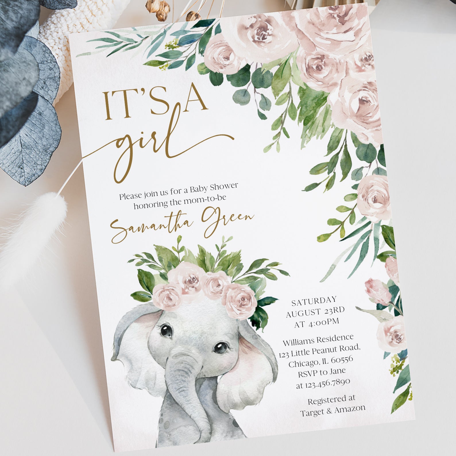 - Purchase this Baby Shower Invite with Pink Roses, Greenery & Elephant template