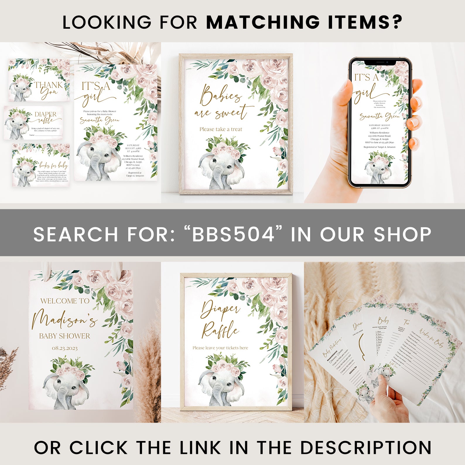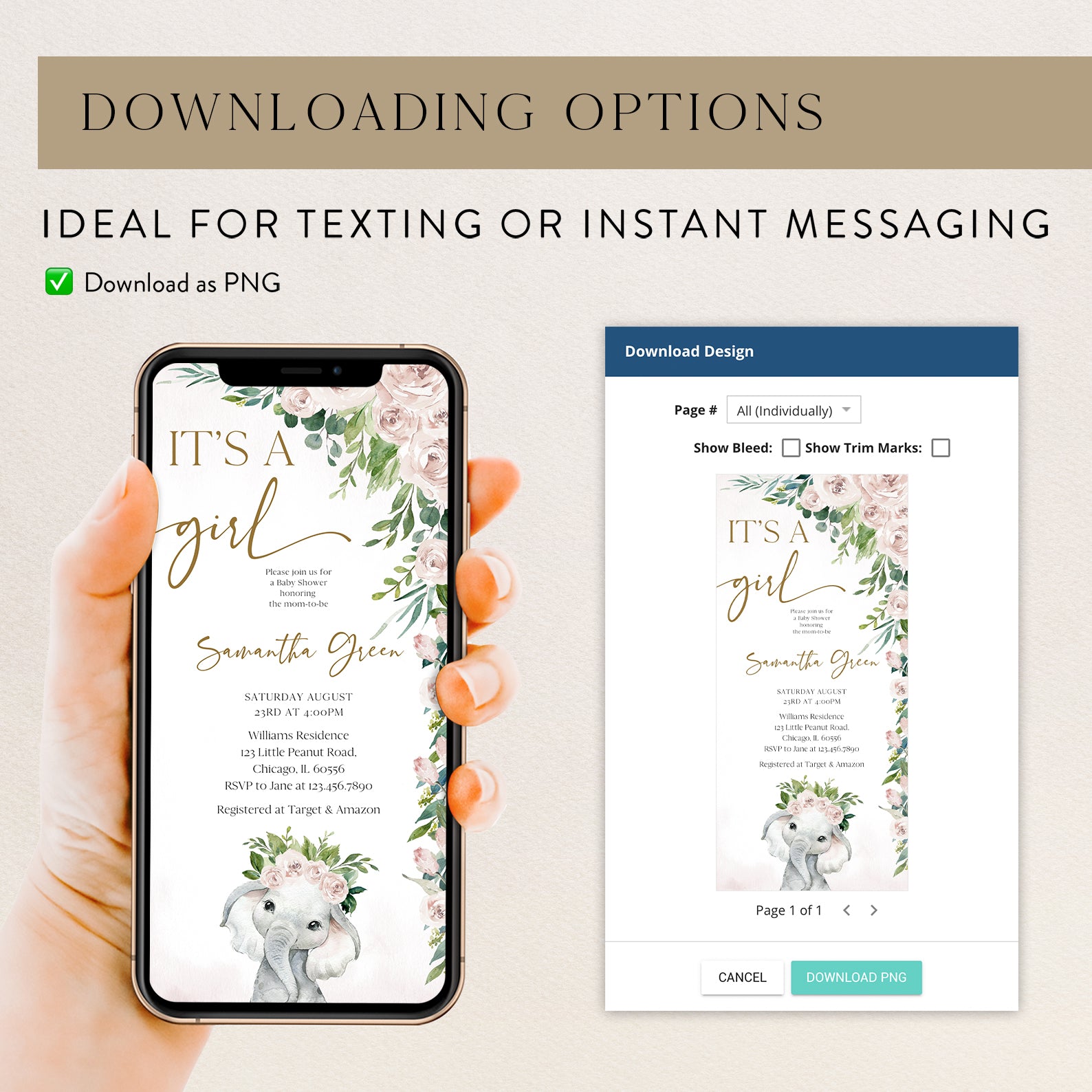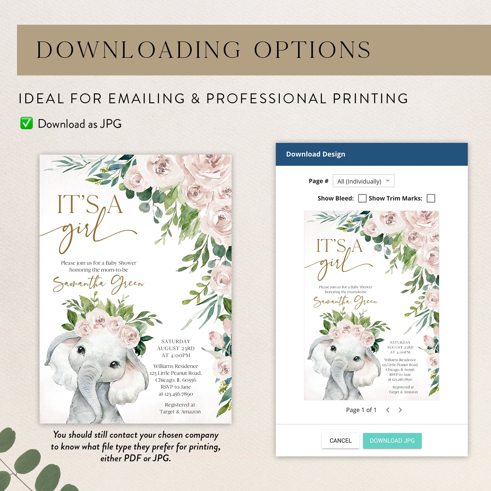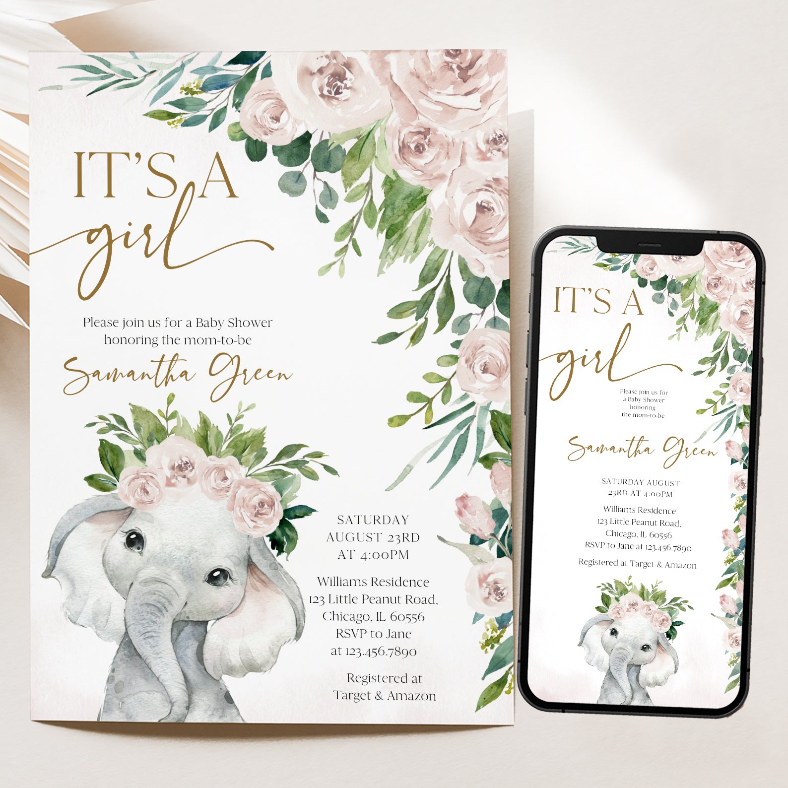 - Purchase this Baby Shower Invite with Pink Roses, Greenery & Elephant template