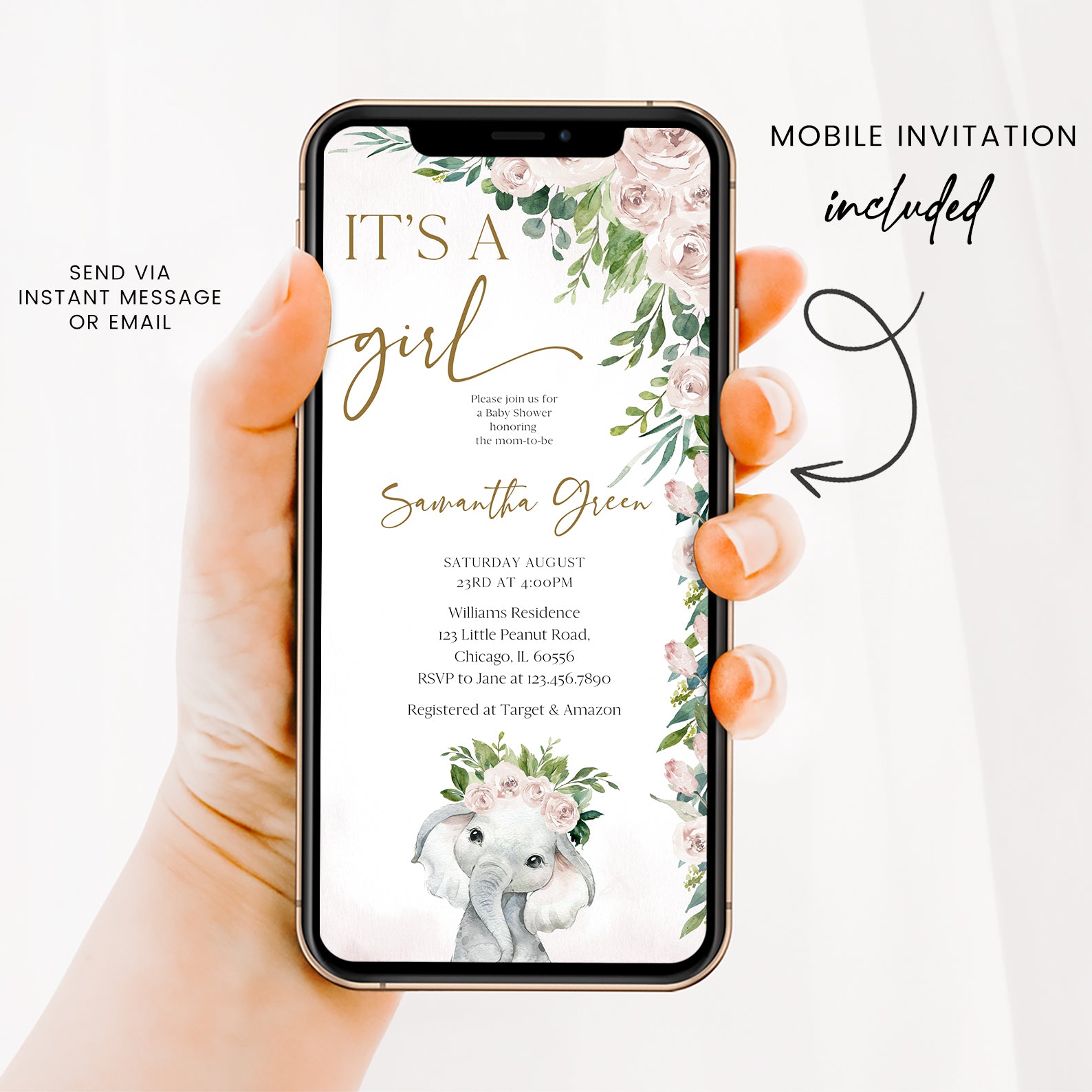Celebrate the arrival of your little one with our charming digital baby shower invitation, available in delightful blue for "It's a Boy" and soft pink for "It's a Girl." Adorned with elegant roses and framed by lush green leaves, this invitation sets the perfect tone for your joyous occasion. A whimsical baby elephant, decorated with roses and leaves, adds a playful touch to the design, making it a memorable keepsake for your guests. Easy to customize and send, this invitation is the ideal way to share your excitement and gather loved ones for a beautiful celebration.