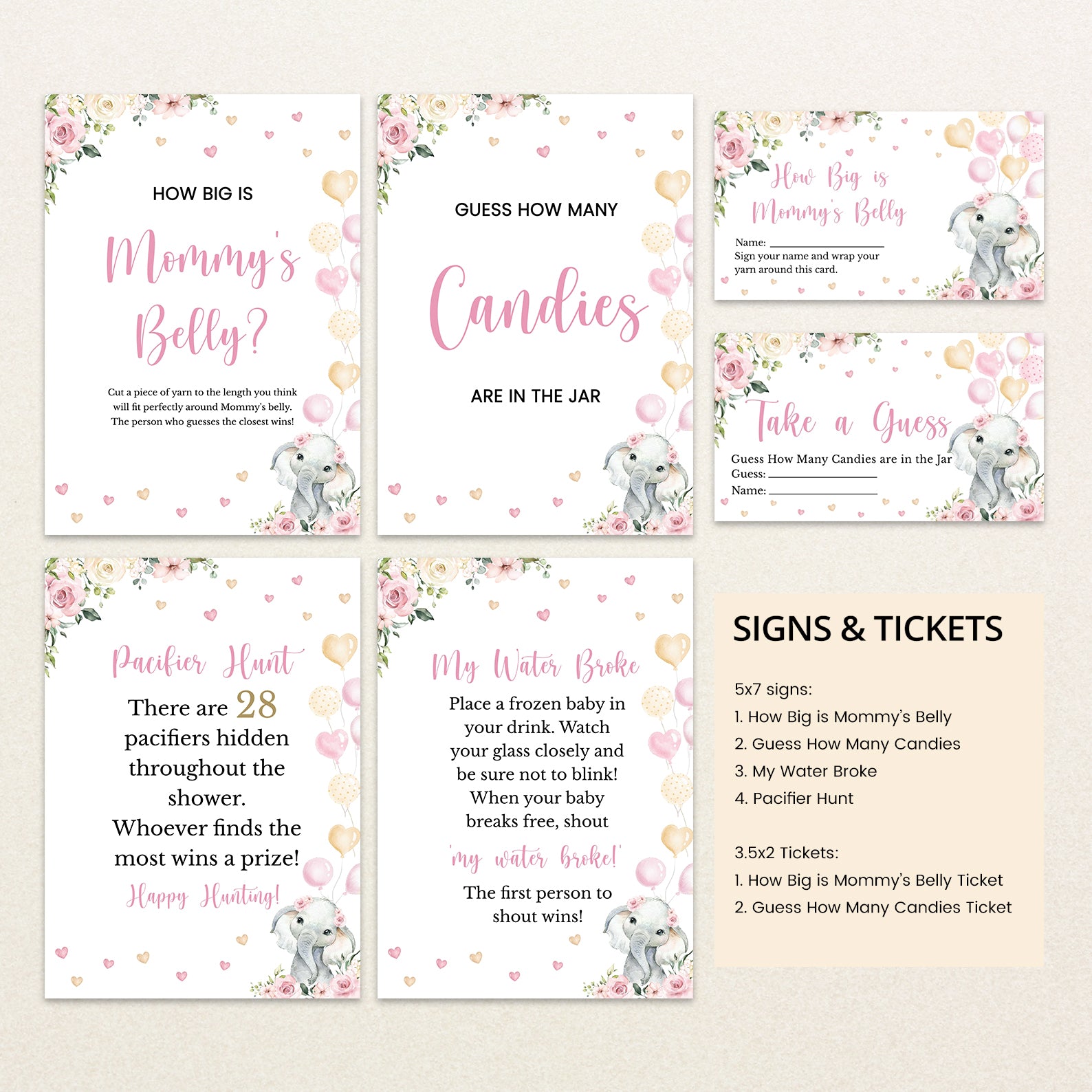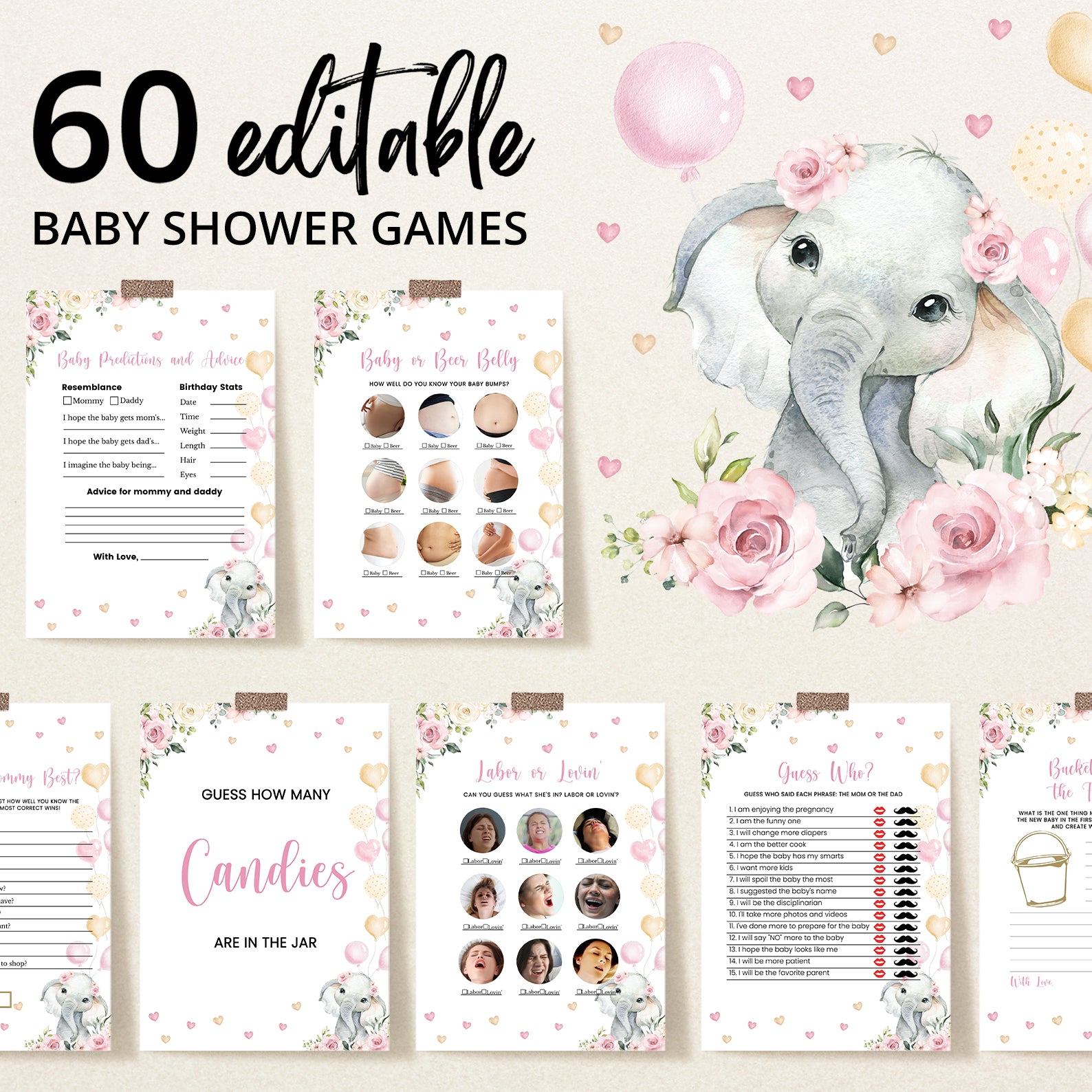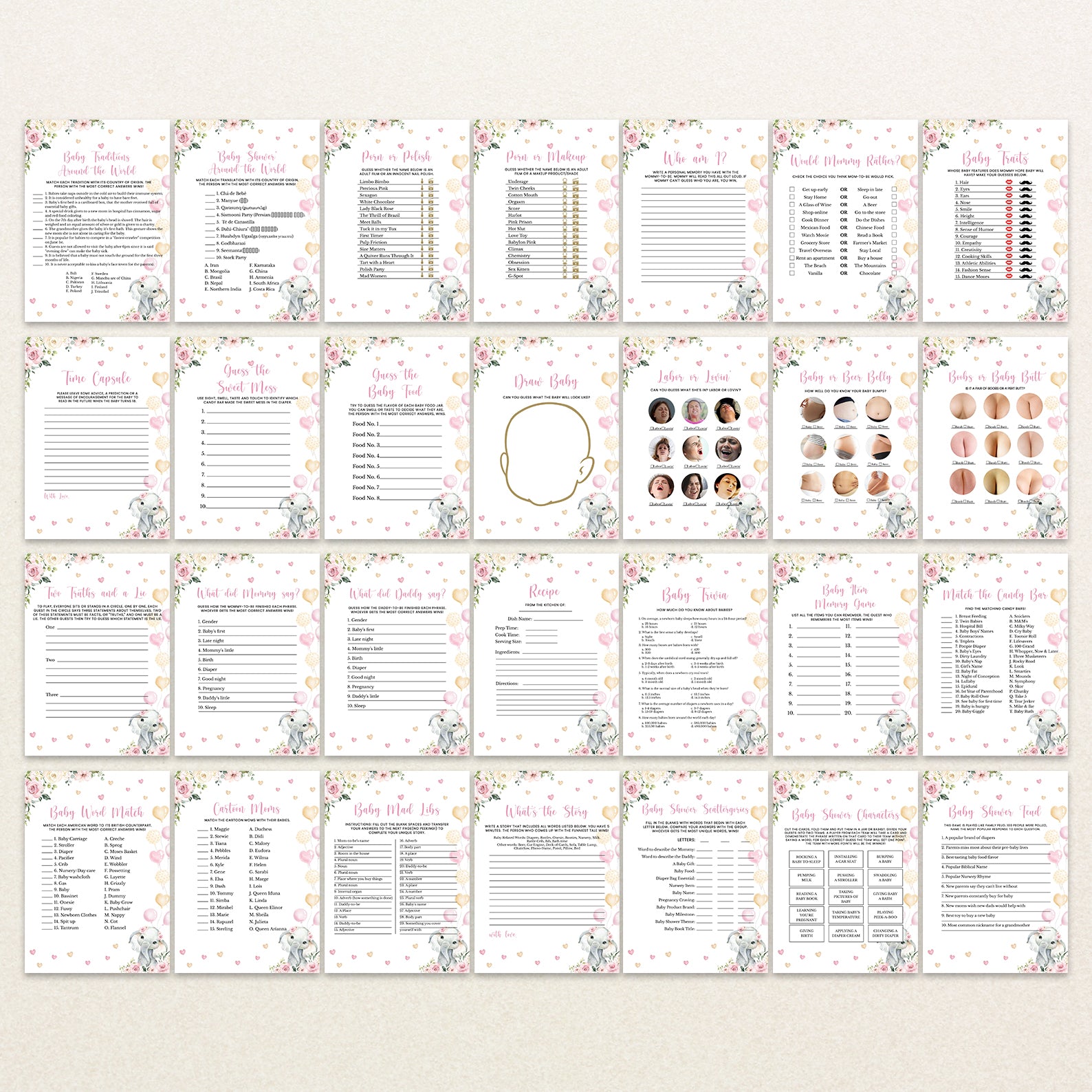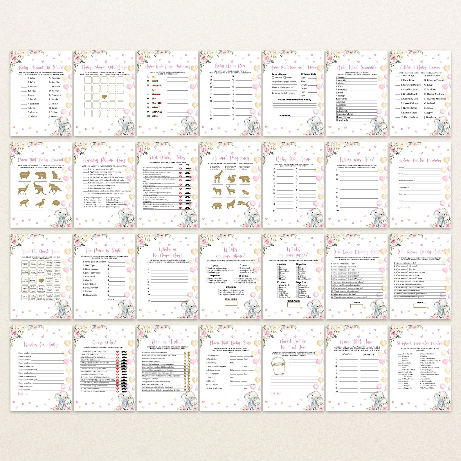 Bring the fun to your celebration with our pink floral elephant game bundle! This collection includes 60 editable baby shower games featuring a sweet baby elephant with balloons, pink florals, playful hearts, and lush greenery. Easy to customize and print, these games are perfect for keeping guests entertained while matching the charming design of your invitations and décor. A delightful way to create lasting memories at your shower!