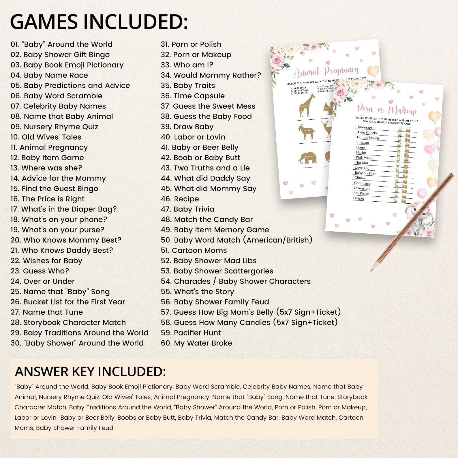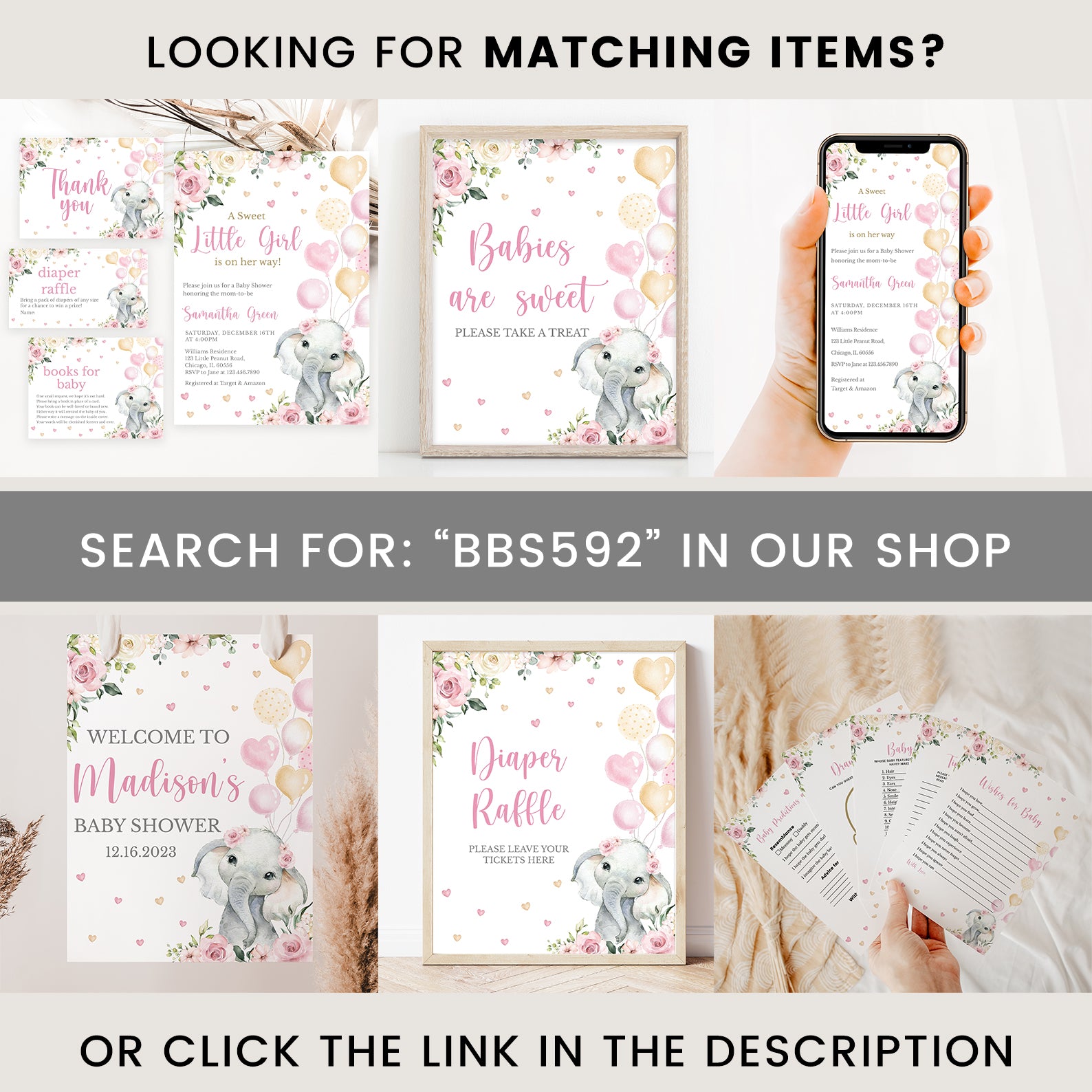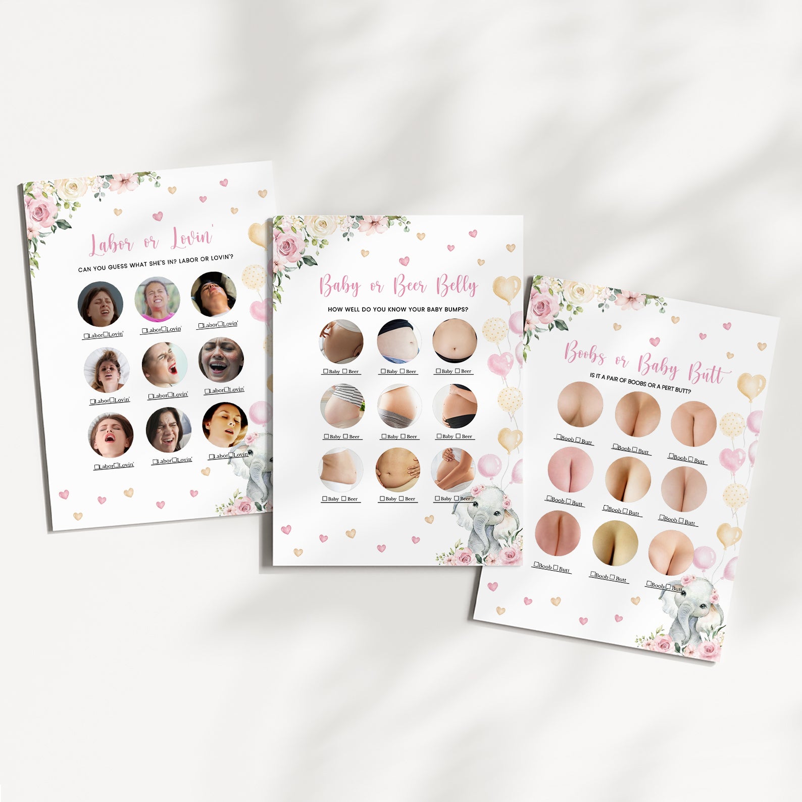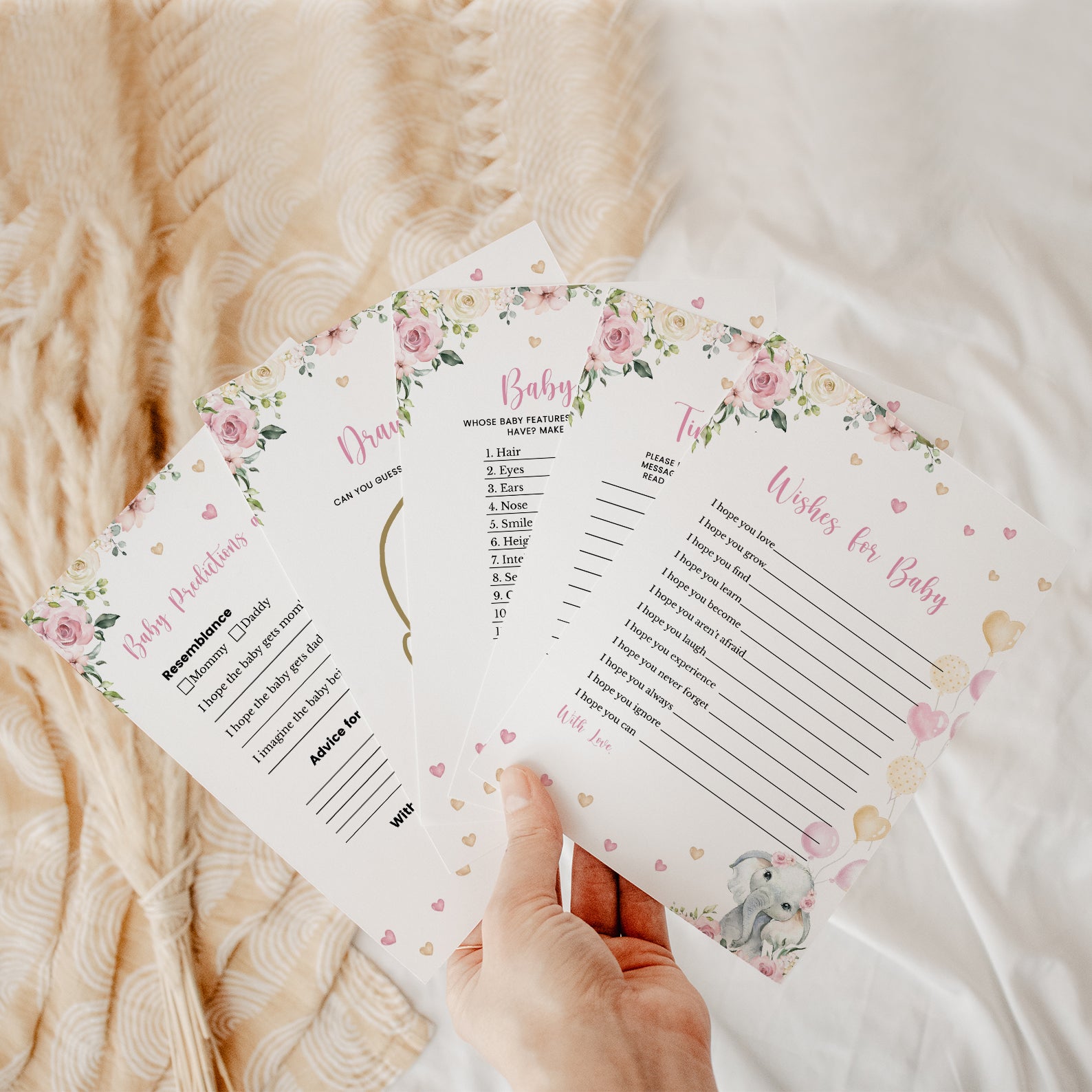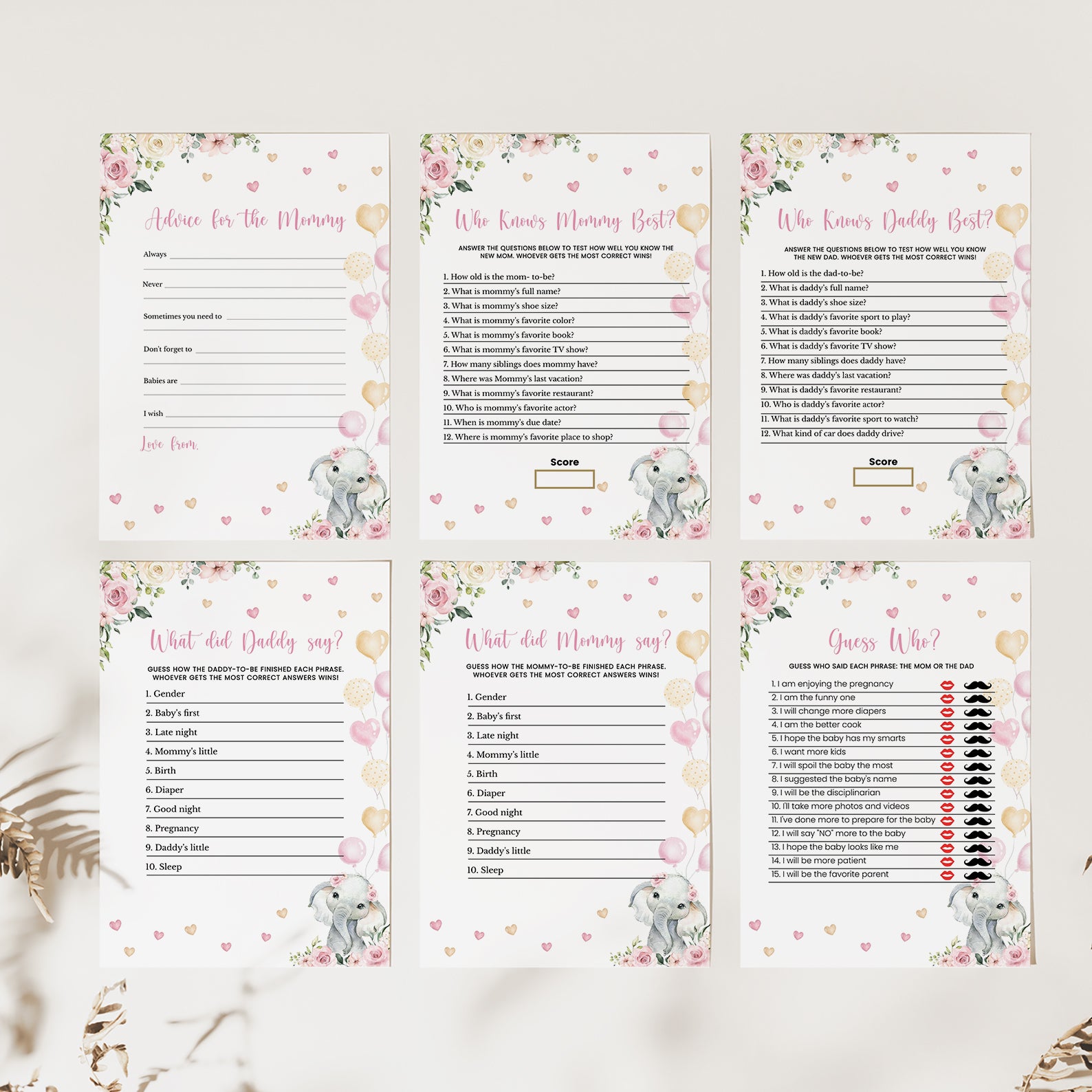 Bring the fun to your celebration with our pink floral elephant game bundle! This collection includes 60 editable baby shower games featuring a sweet baby elephant with balloons, pink florals, playful hearts, and lush greenery. Easy to customize and print, these games are perfect for keeping guests entertained while matching the charming design of your invitations and décor. A delightful way to create lasting memories at your shower!