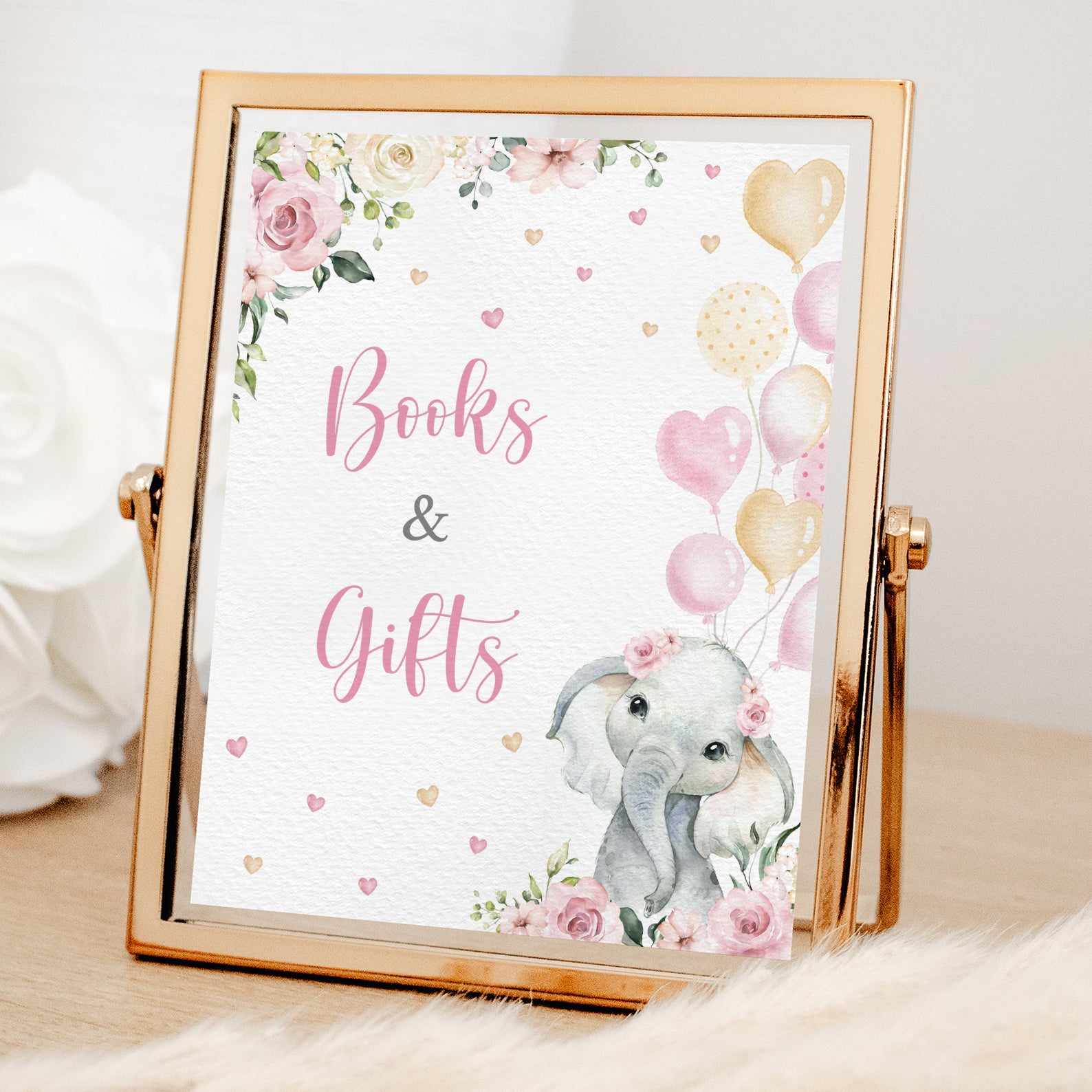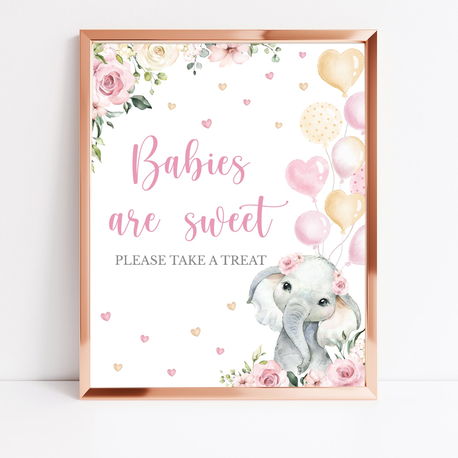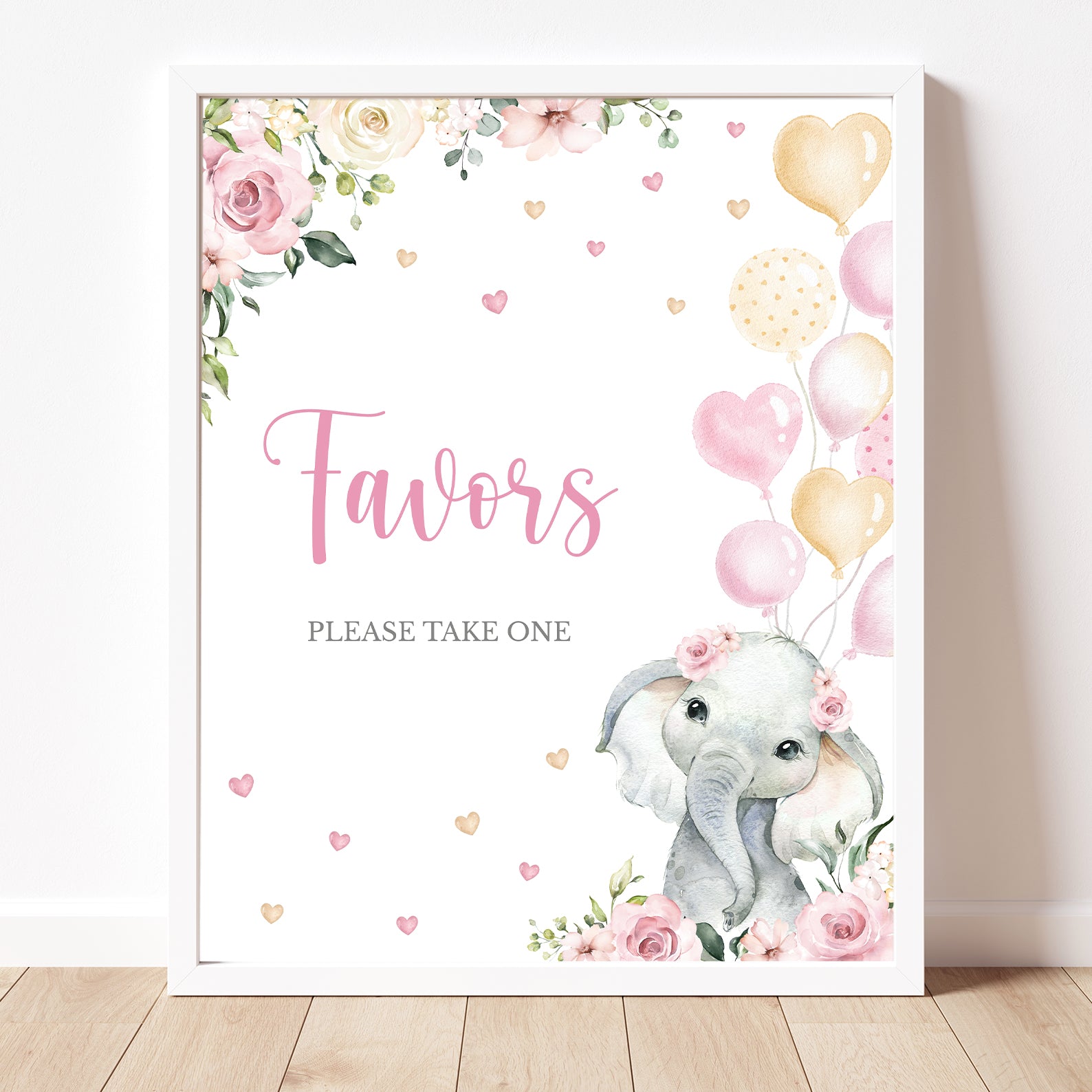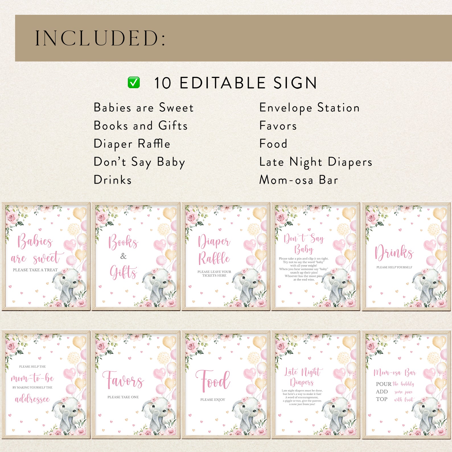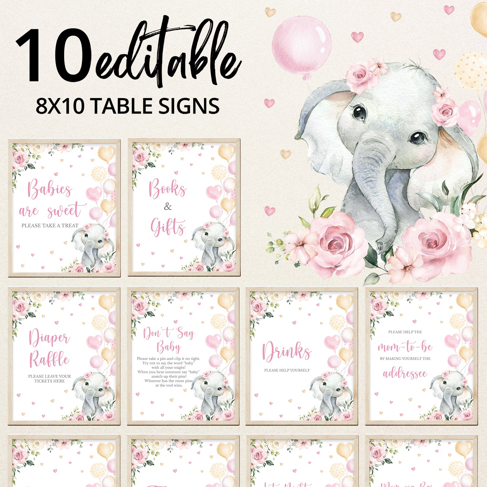 Add a cohesive touch to your décor with our pink floral elephant table sign set! Featuring 10 editable signs, including Babies Are Sweet, Books and Gifts, Diaper Raffle, Don’t Say Baby, Drinks, Envelope Station, Favors, Food, Late Night Diapers, and Mom-osa Bar. Adorned with florals, greenery, playful hearts, and a baby elephant, these signs perfectly match your shower theme while keeping your celebration stylish and organized.