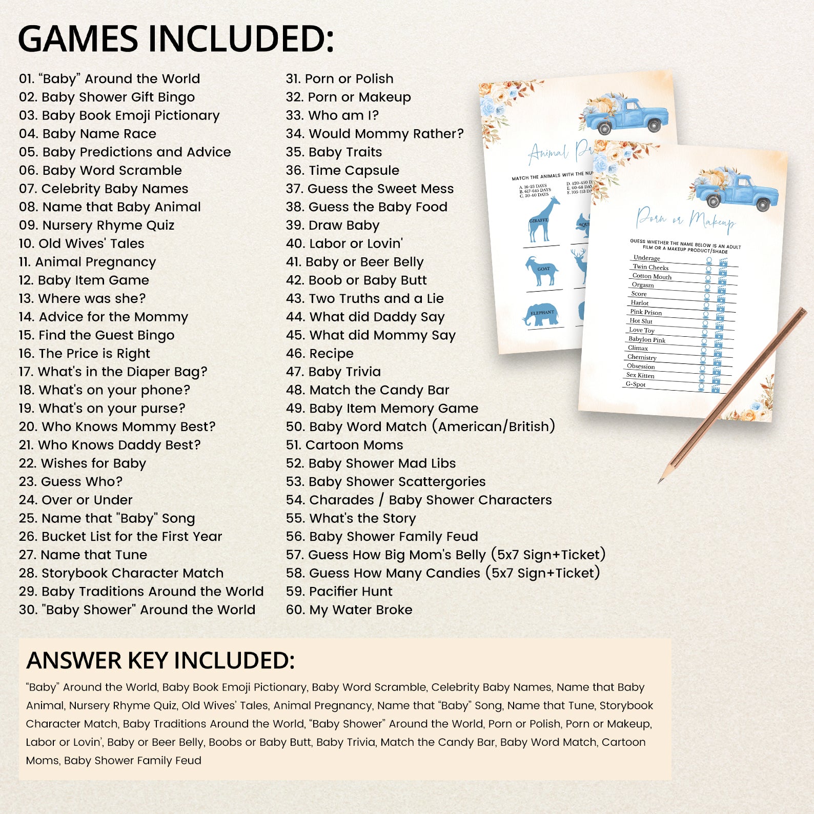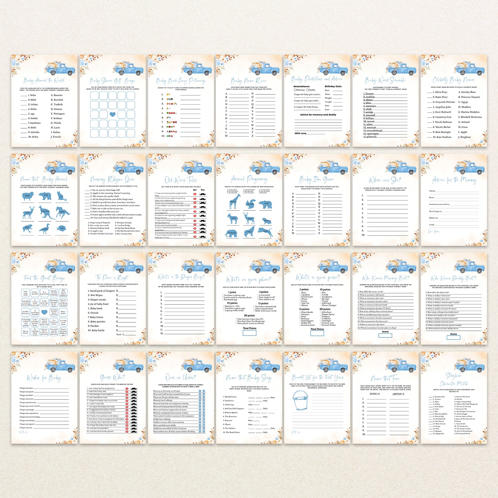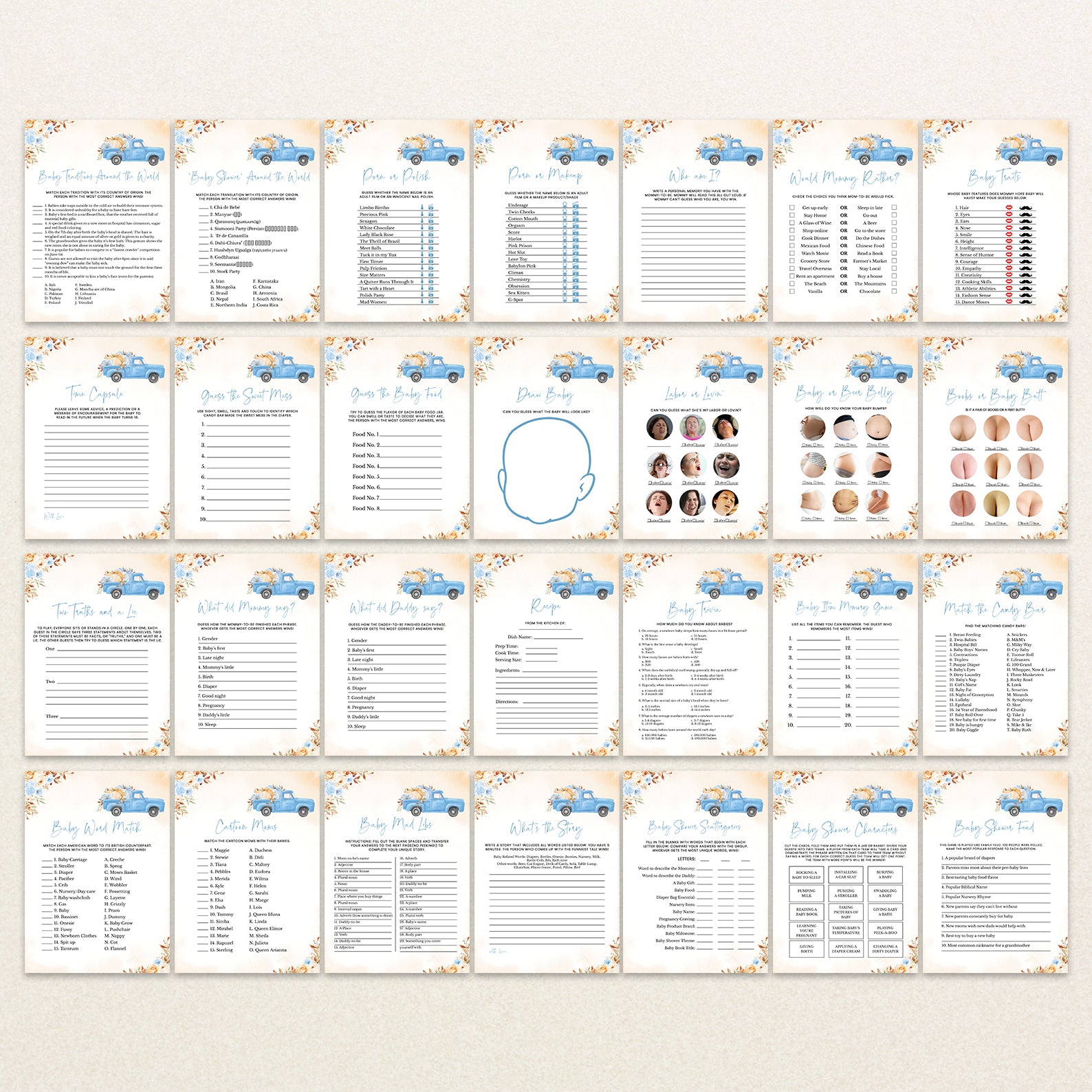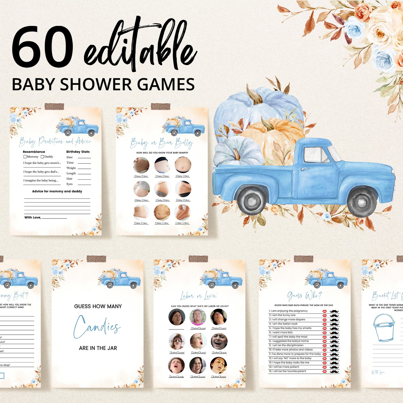 Make your baby shower unforgettable with this set of 60 editable fall-themed games. Each design features watercolor pumpkins, rose accents, and a cozy truck motif in pink or blue. From guessing games to fun trivia, this bundle offers hours of entertainment wrapped in warm autumn style ideal for celebrating the arrival of your little one with laughter and love.