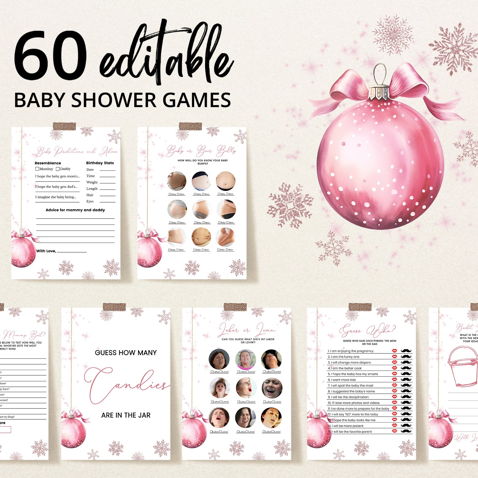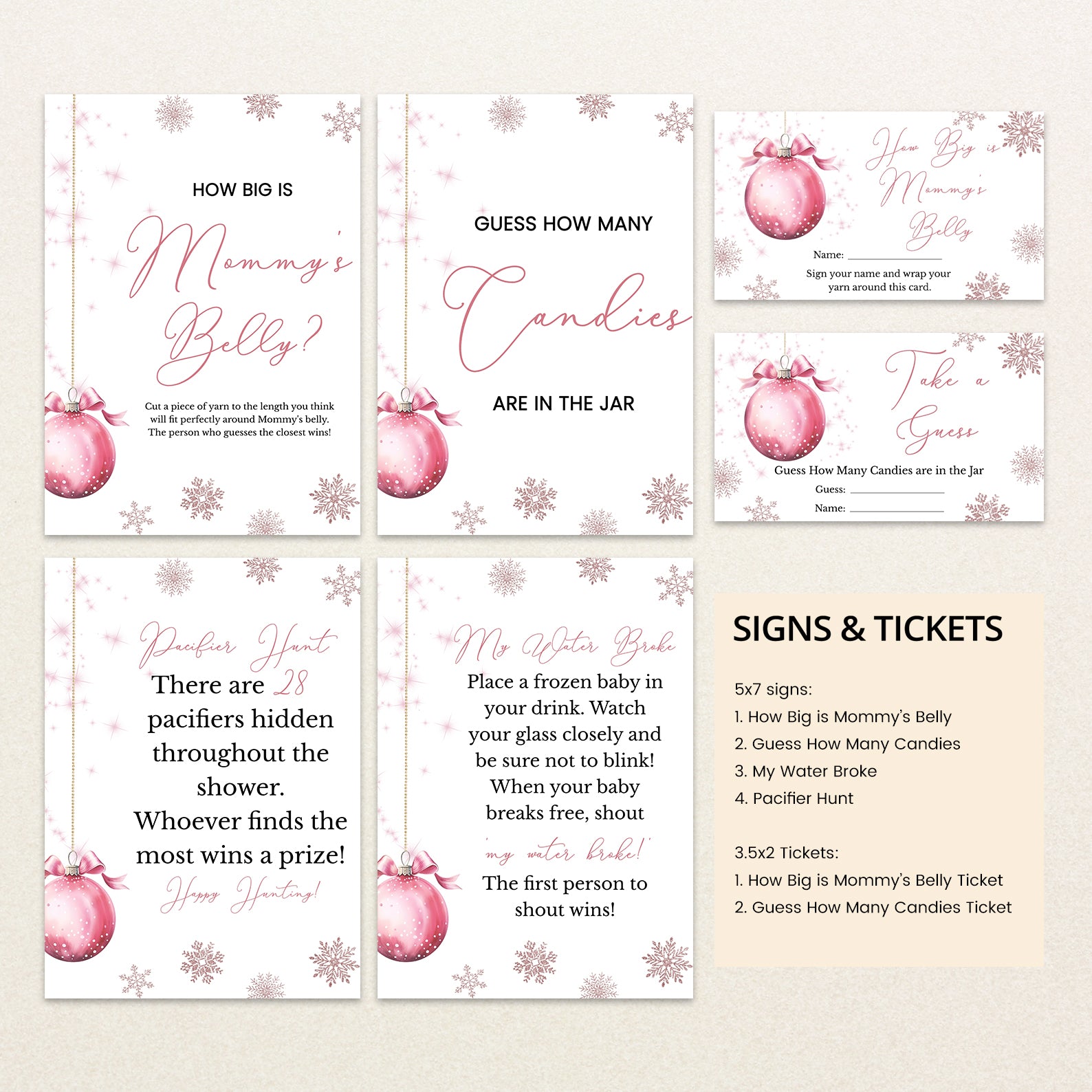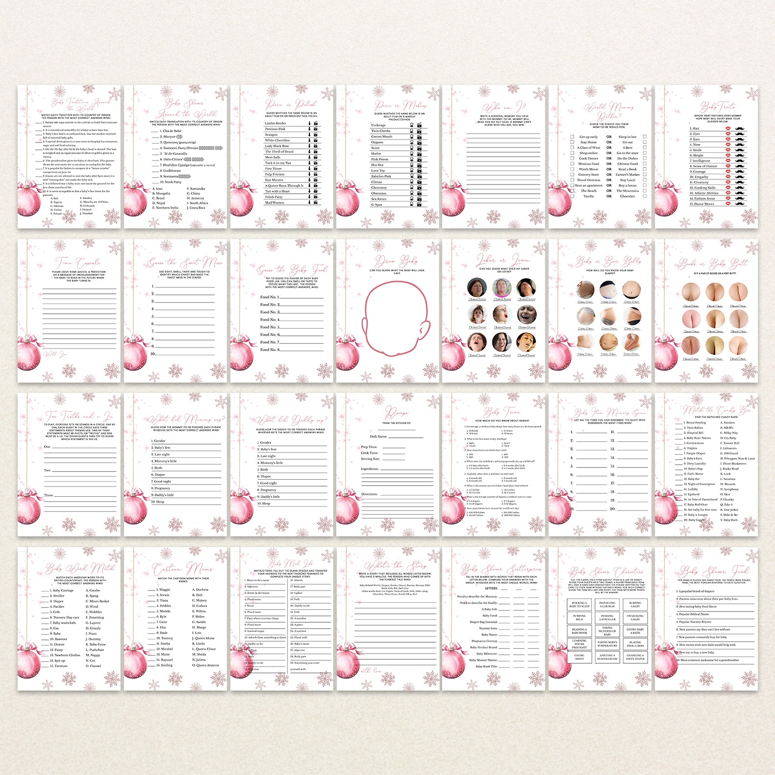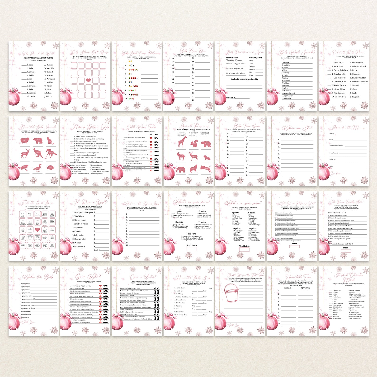 Keep guests engaged with this 60-game editable baby shower bundle, designed with a festive pink hanging Christmas ball and soft snowflake accents. Each game is easy to personalize and blends seamlessly with your winter décor, offering a mix of classic activities and creative challenges. Ideal for adding fun, laughter, and seasonal charm to your pink-themed holiday baby shower celebration.