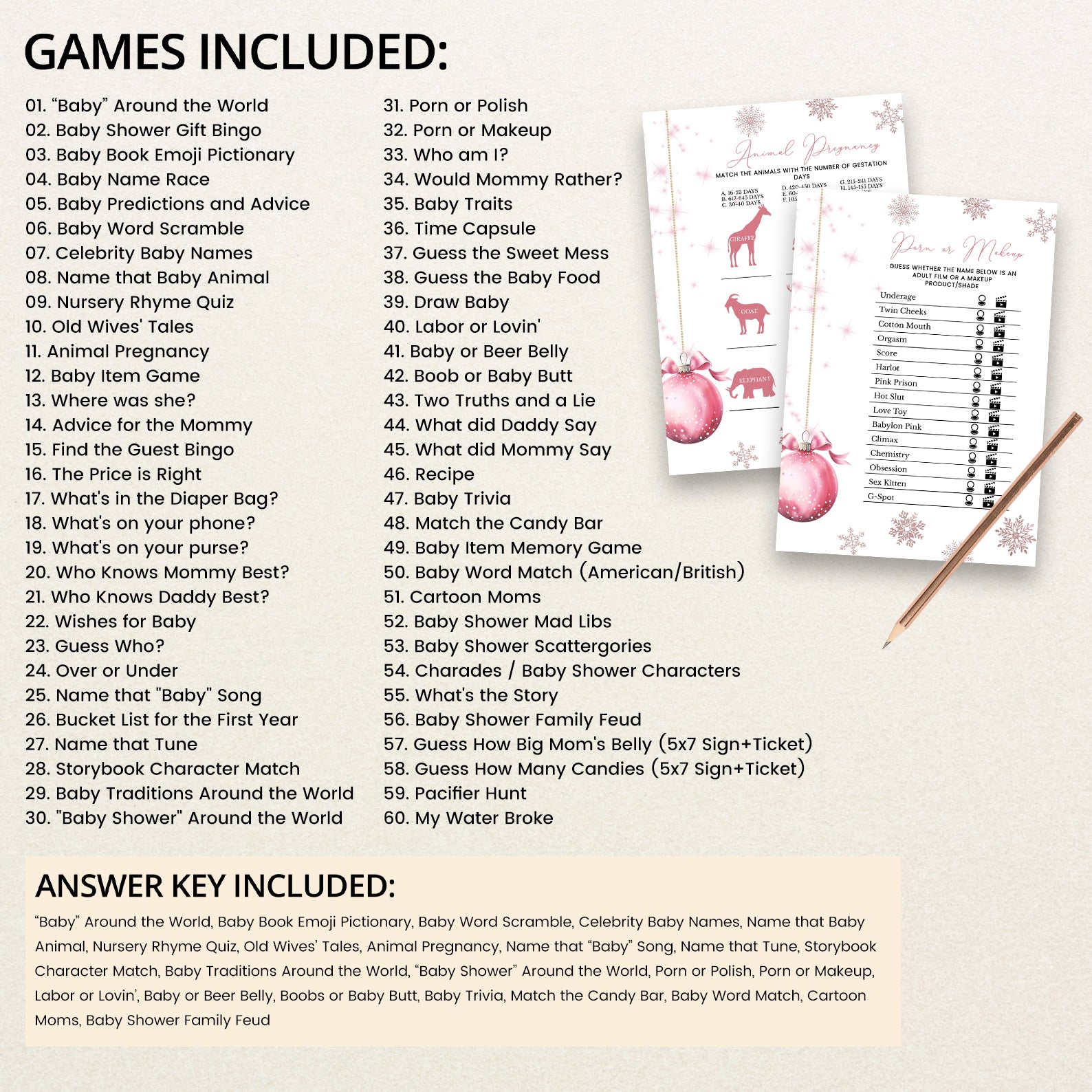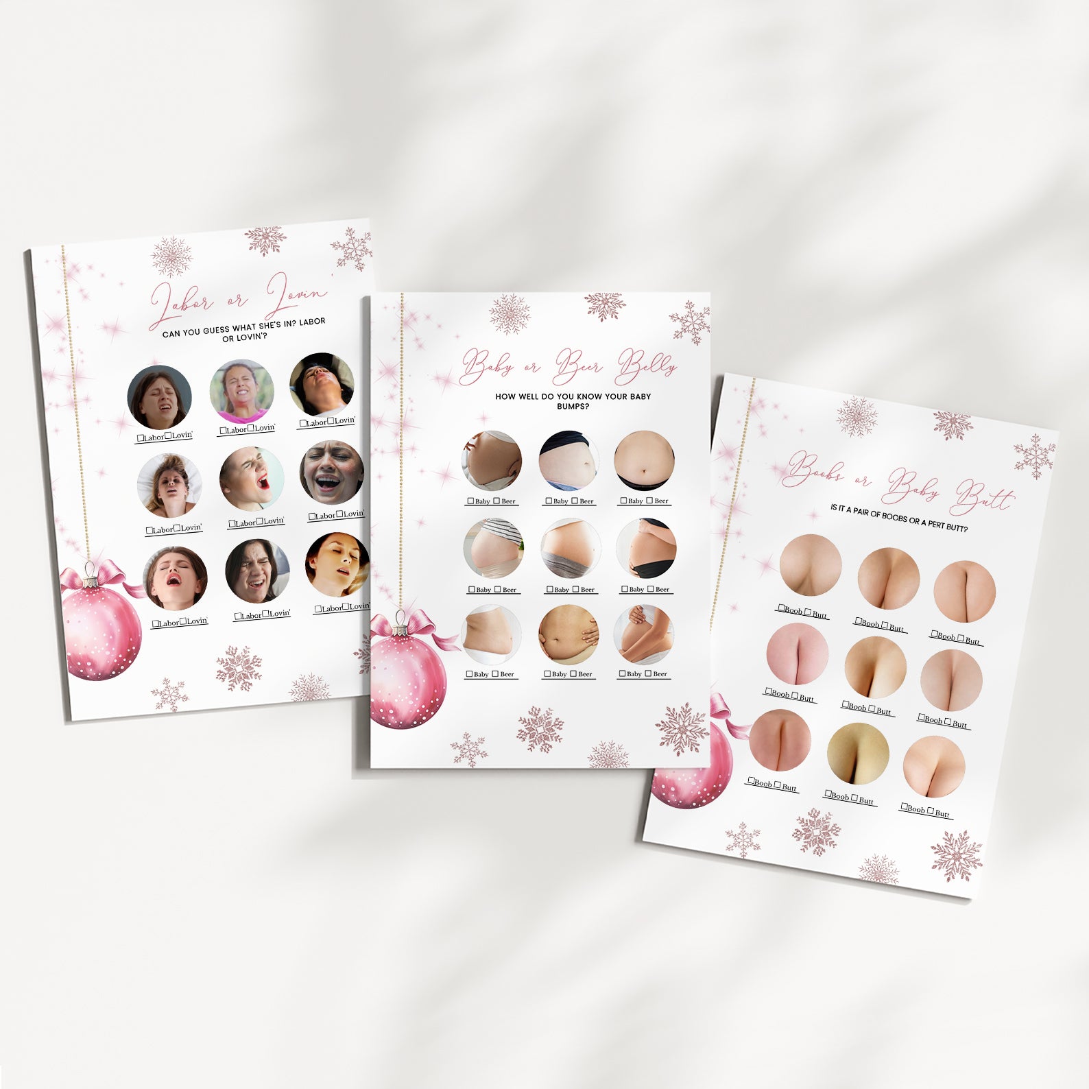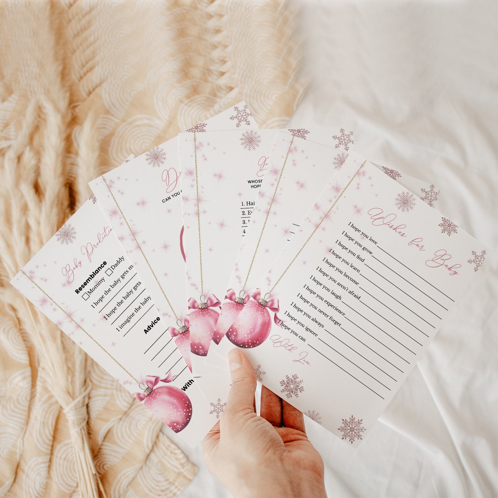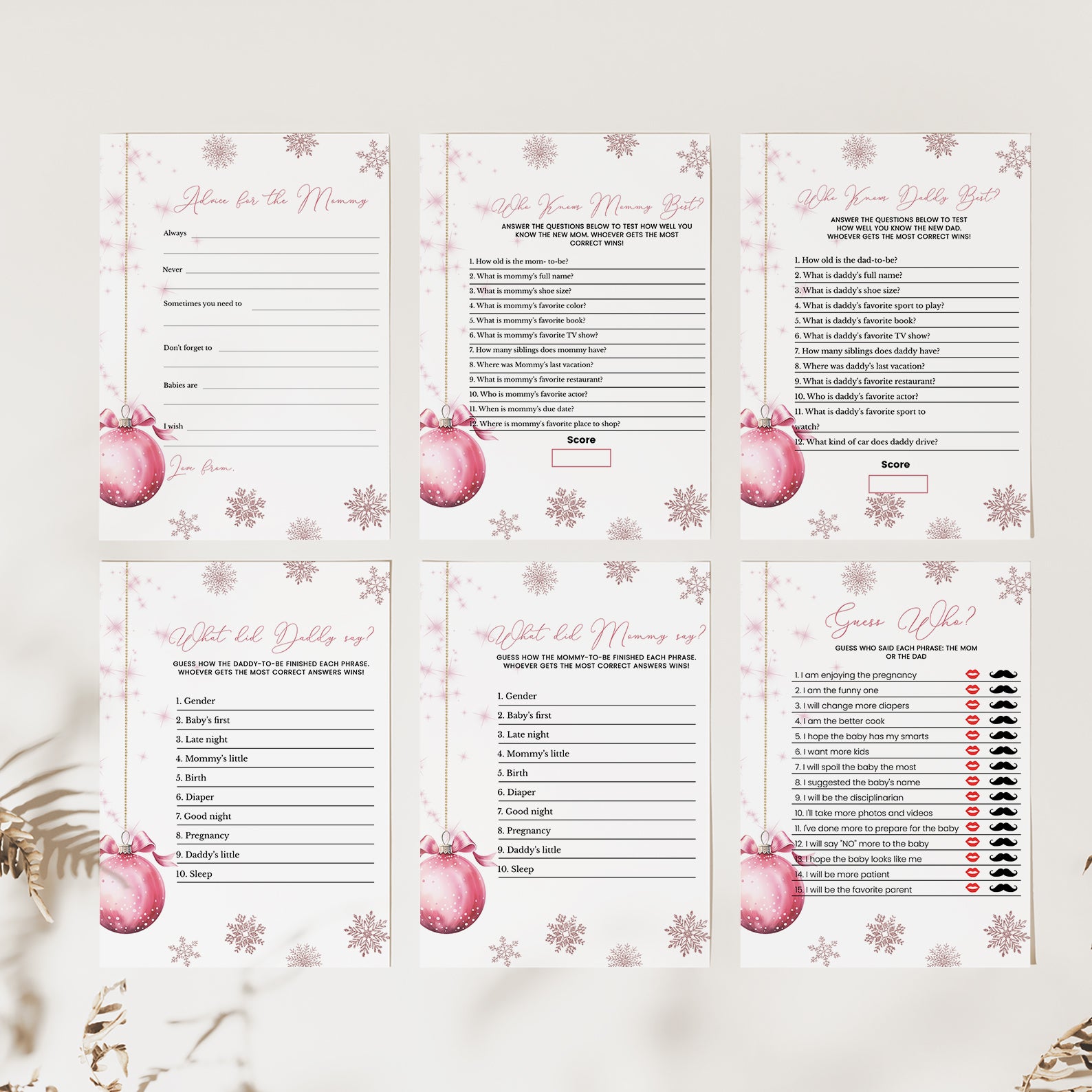 Keep guests engaged with this 60-game editable baby shower bundle, designed with a festive pink hanging Christmas ball and soft snowflake accents. Each game is easy to personalize and blends seamlessly with your winter décor, offering a mix of classic activities and creative challenges. Ideal for adding fun, laughter, and seasonal charm to your pink-themed holiday baby shower celebration.