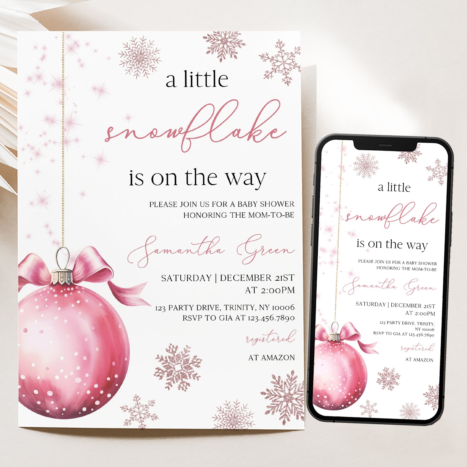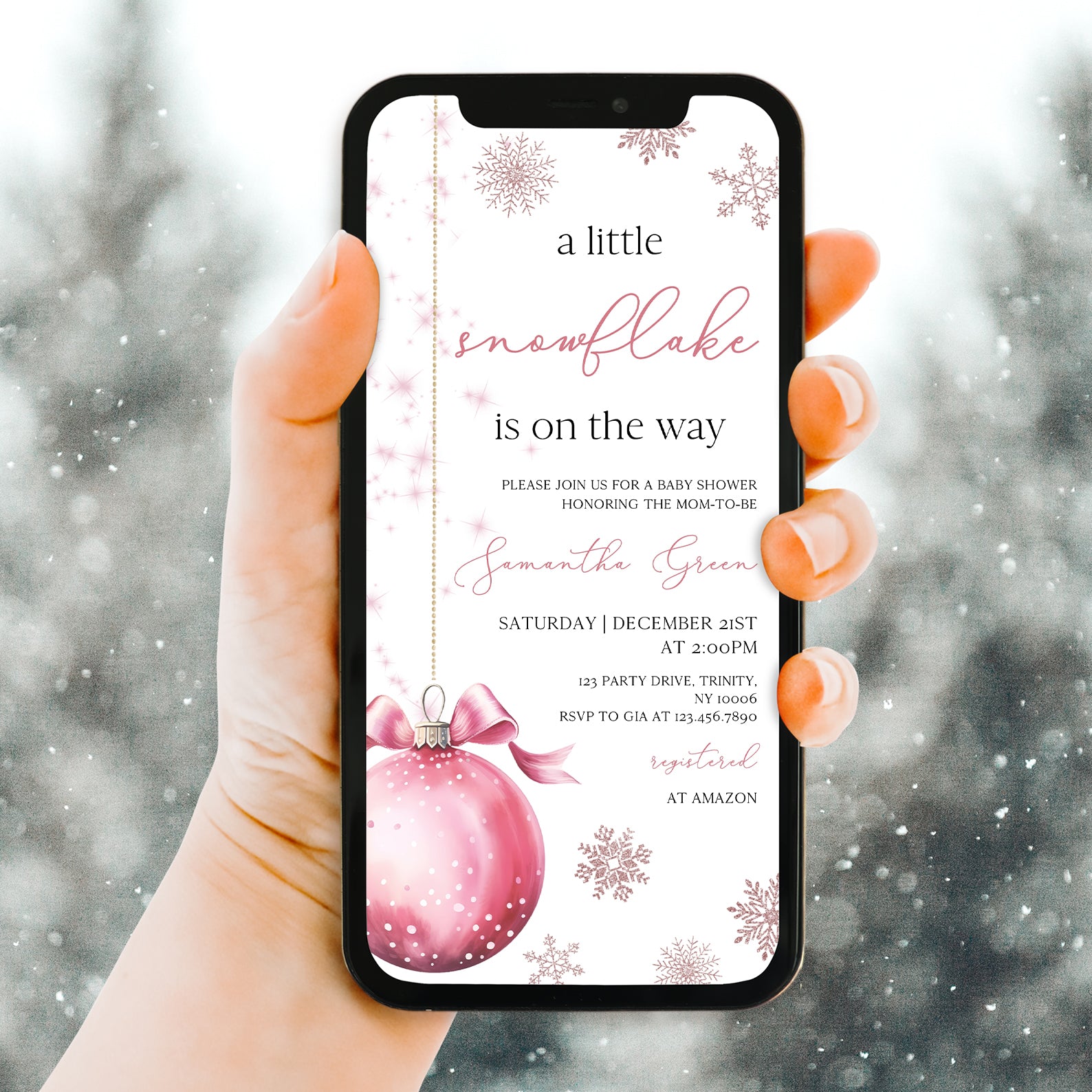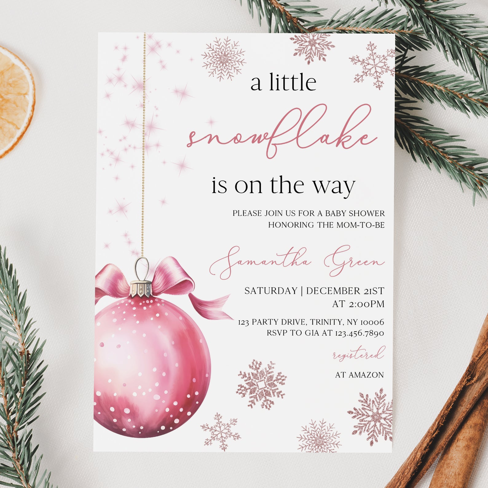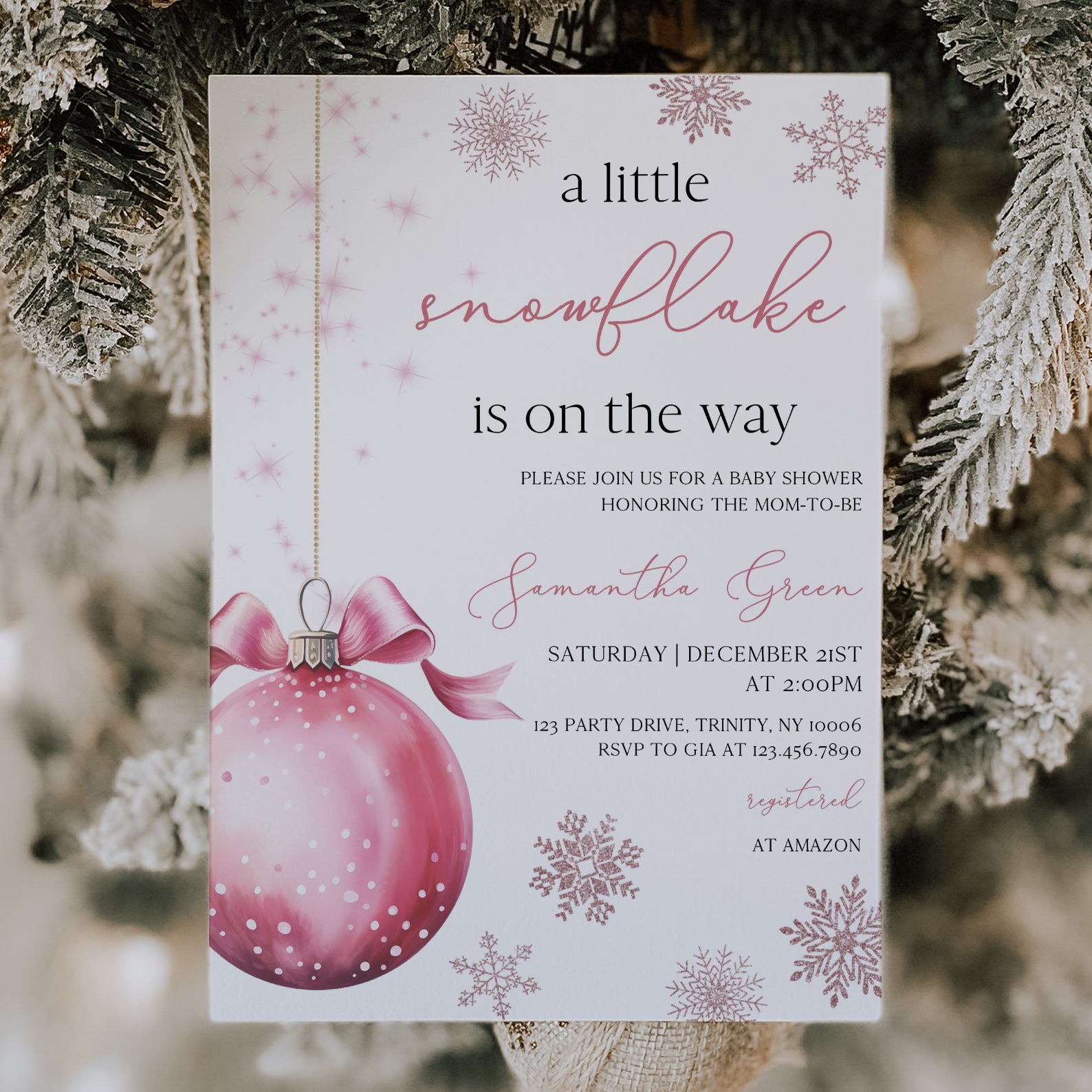 Celebrate the upcoming arrival of your little one with our charming winter baby shower digital invitation! Featuring a delightful pink theme, this invitation showcases a whimsical design of a pink hanging Christmas ball surrounded by delicate snowflakes, perfectly capturing the magic of the season. Easy to customize and share, it's the ideal way to invite friends and family to join in the festivities as you await your precious snowflake's arrival.