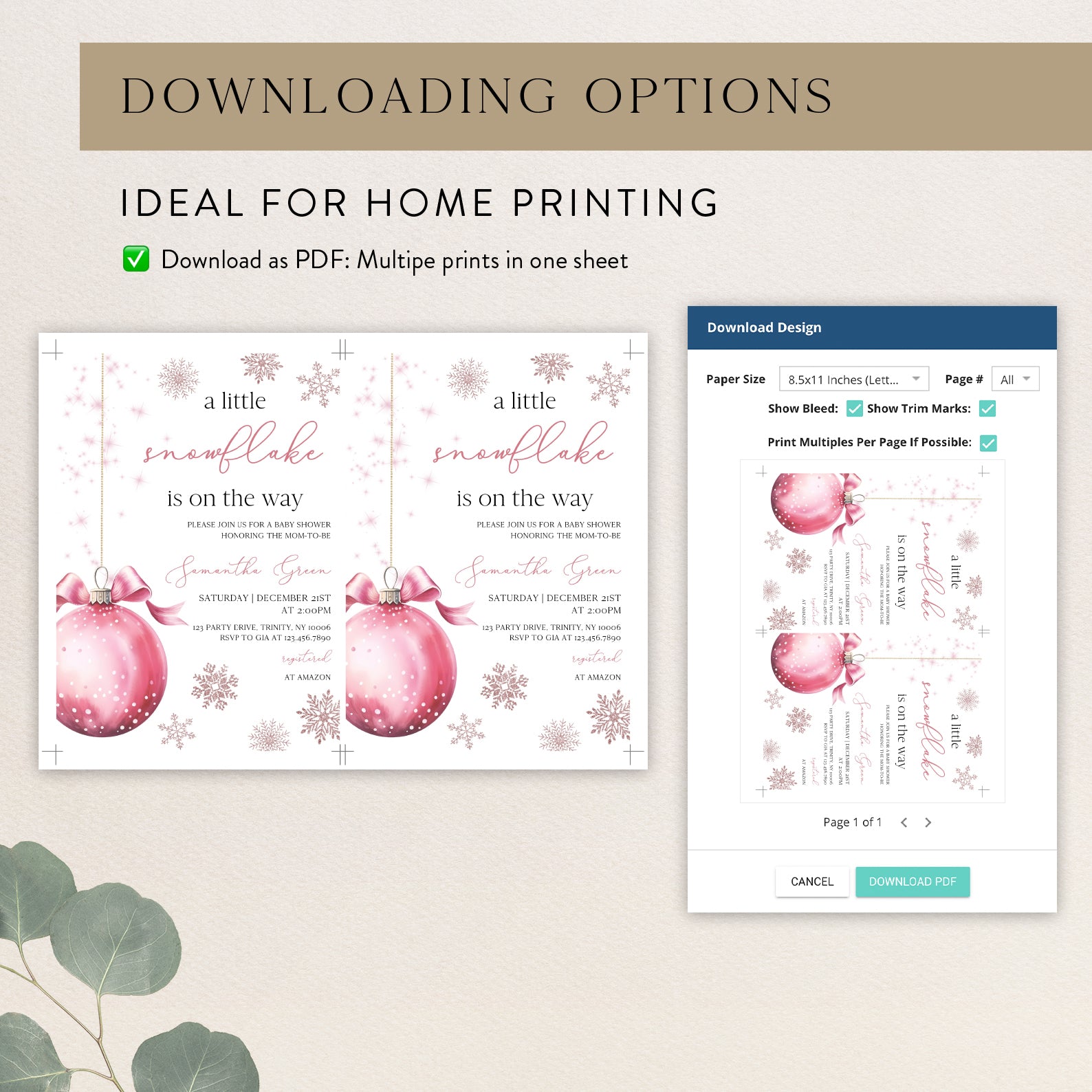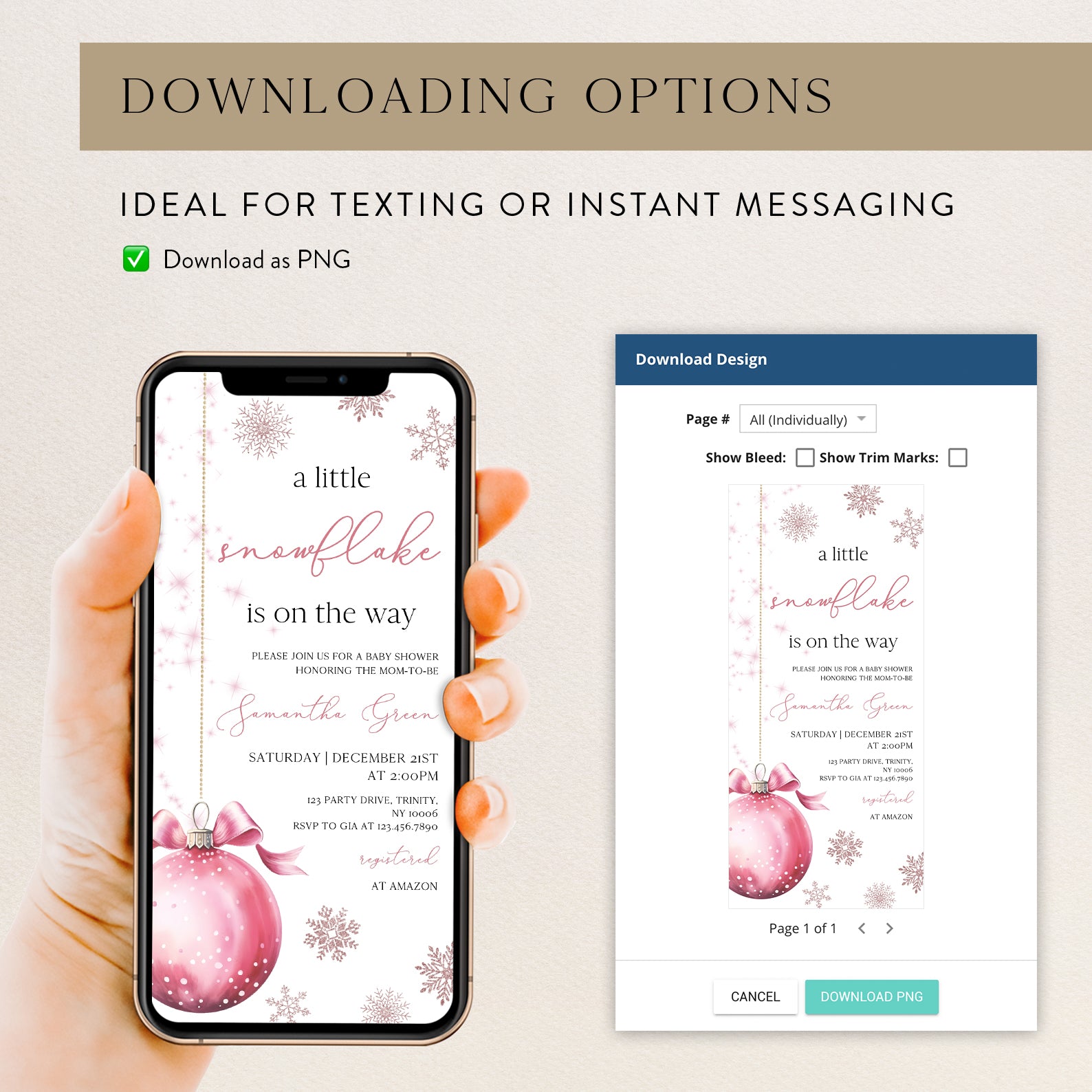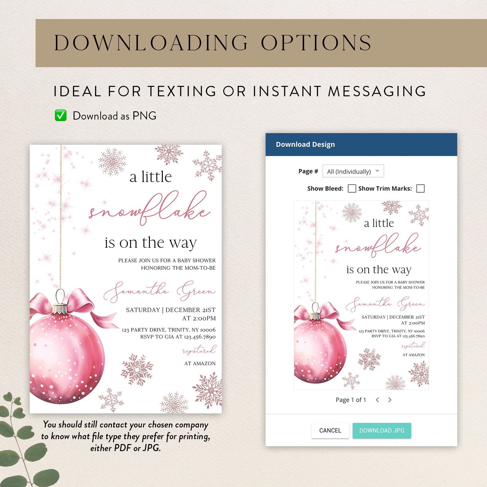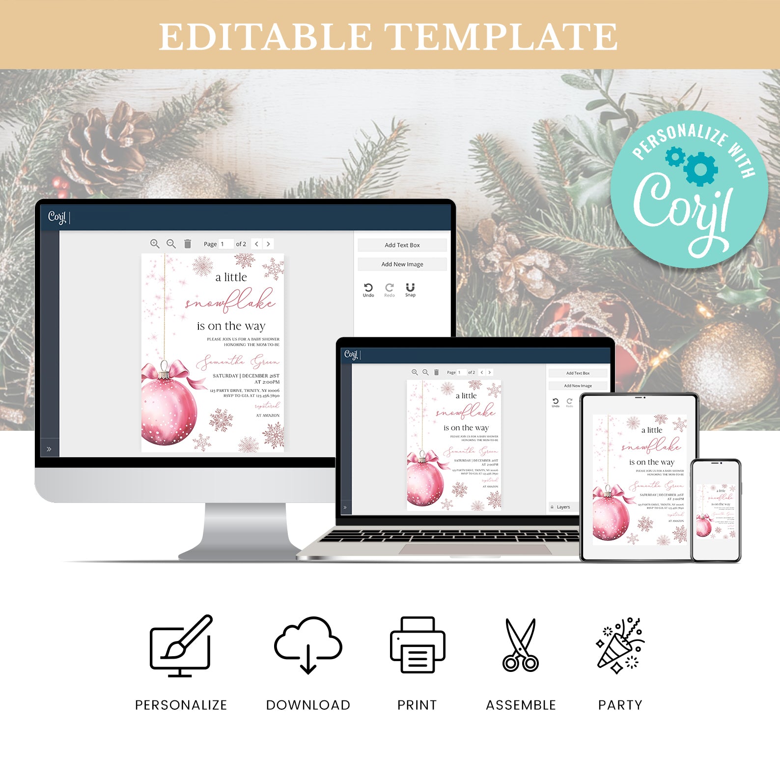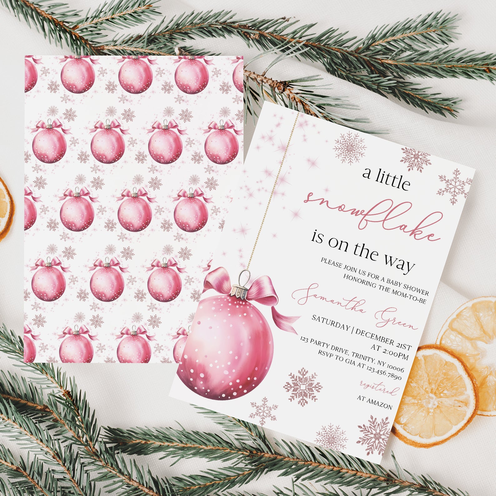 Celebrate the upcoming arrival of your little one with our charming winter baby shower digital invitation! Featuring a delightful pink theme, this invitation showcases a whimsical design of a pink hanging Christmas ball surrounded by delicate snowflakes, perfectly capturing the magic of the season. Easy to customize and share, it's the ideal way to invite friends and family to join in the festivities as you await your precious snowflake's arrival.