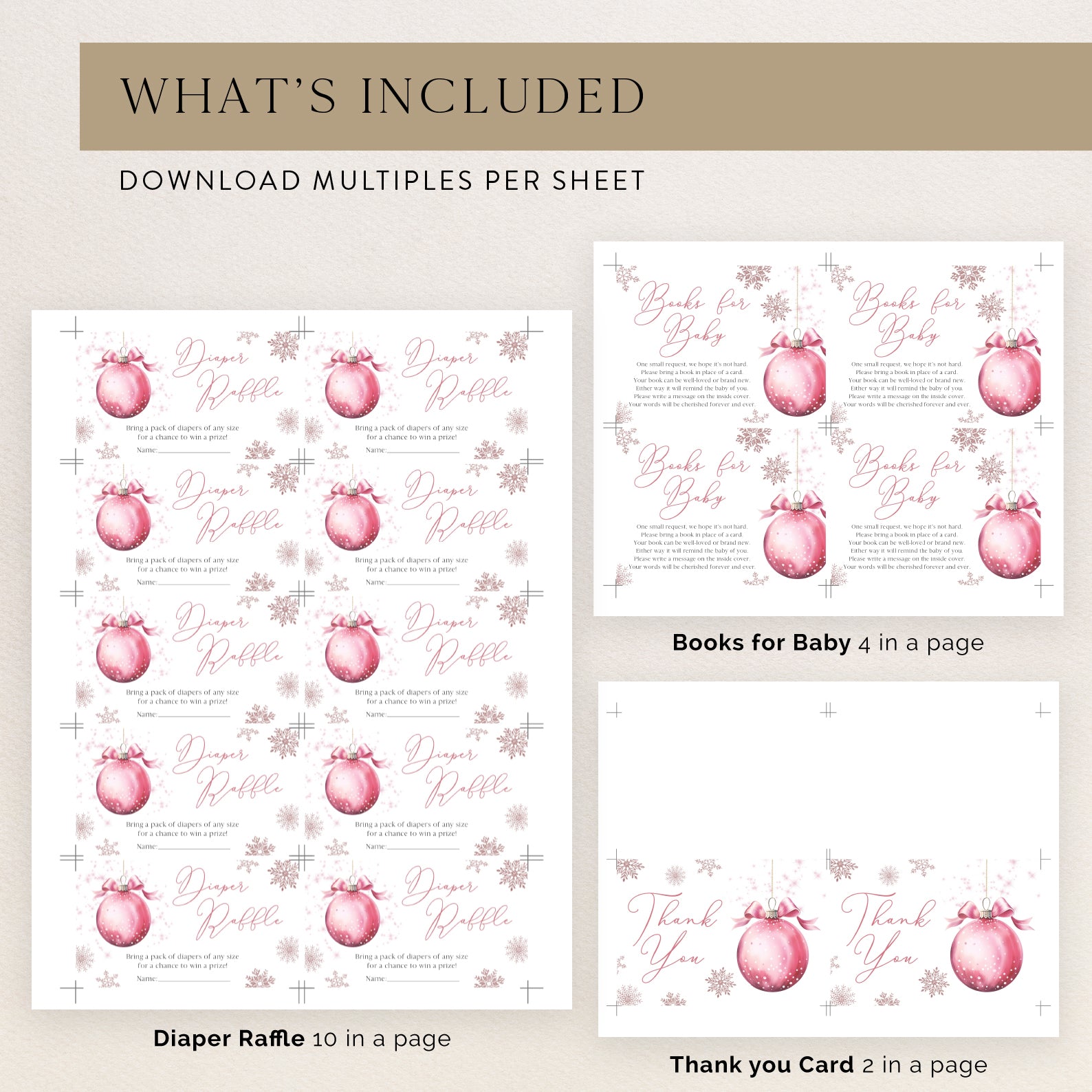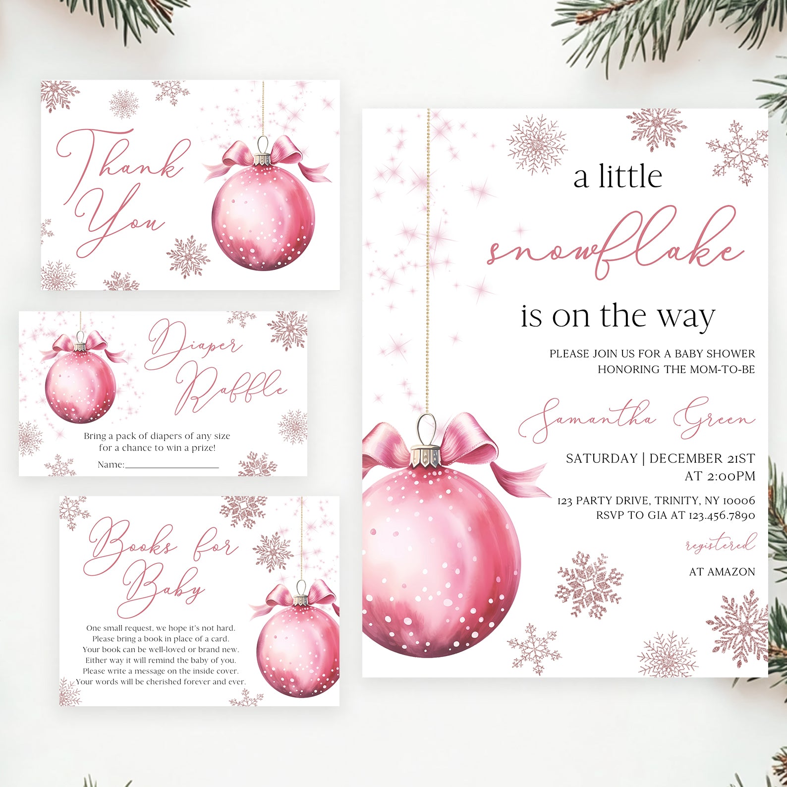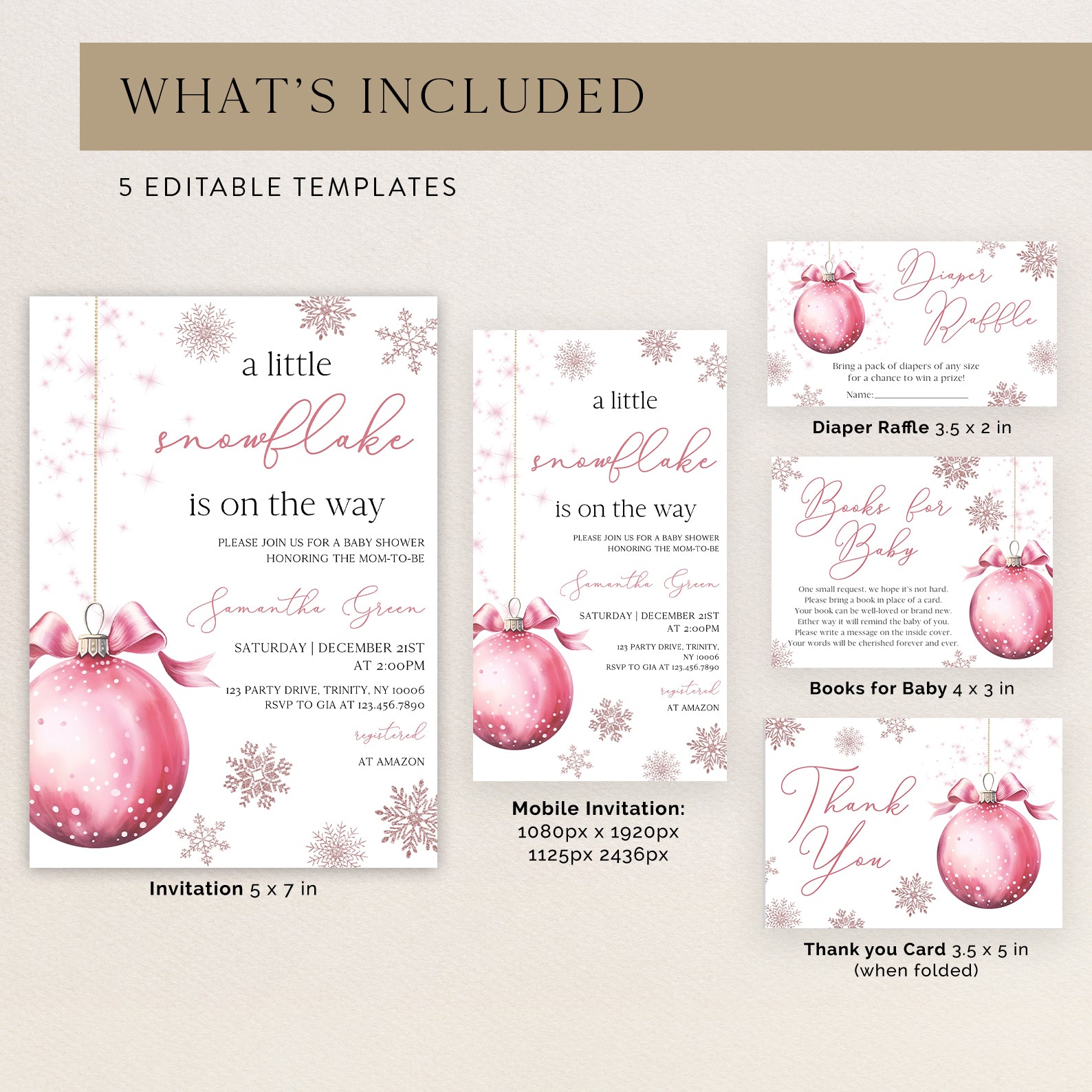 Get ready to welcome your little snowflake with our delightful winter baby shower invitation bundle! This charming set includes a beautifully designed invitation, mobile invite, diaper raffle, books for baby card, and thank you card, all adorned with a whimsical pink hanging Christmas ball and delicate snowflakes. Perfect for celebrating the season and inviting loved ones to share in your joy, this bundle is easy to customize and share, ensuring a magical experience for your special day!