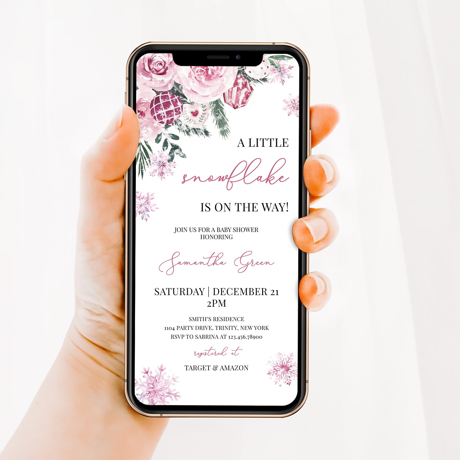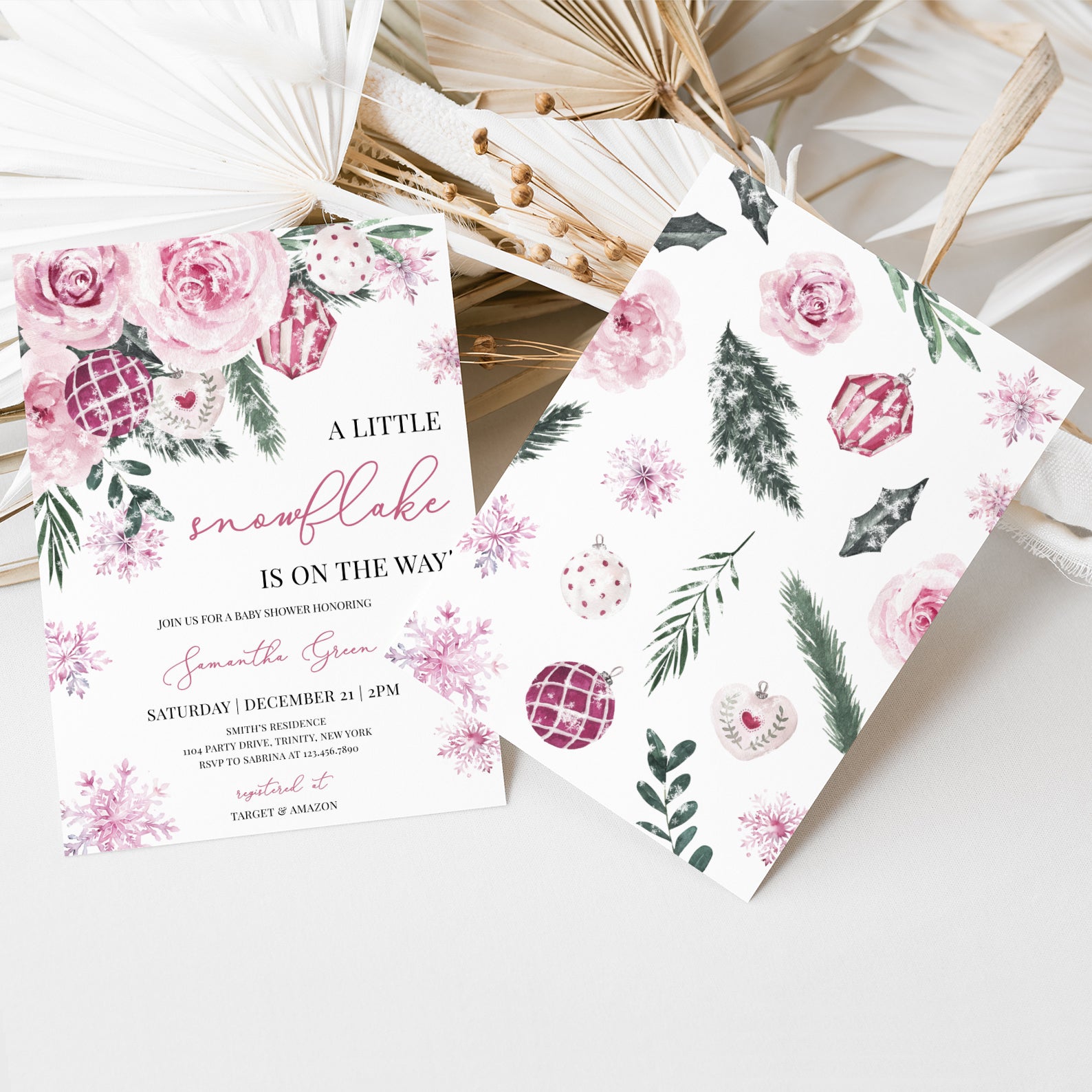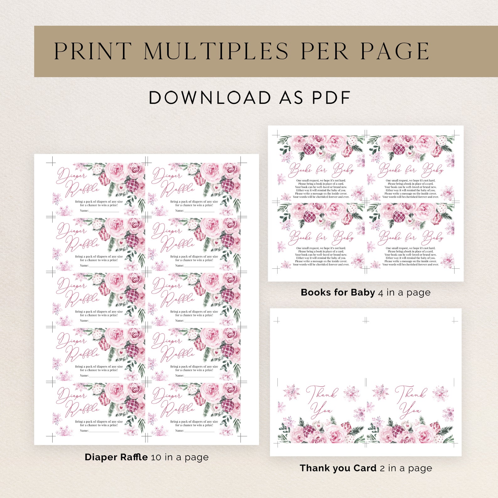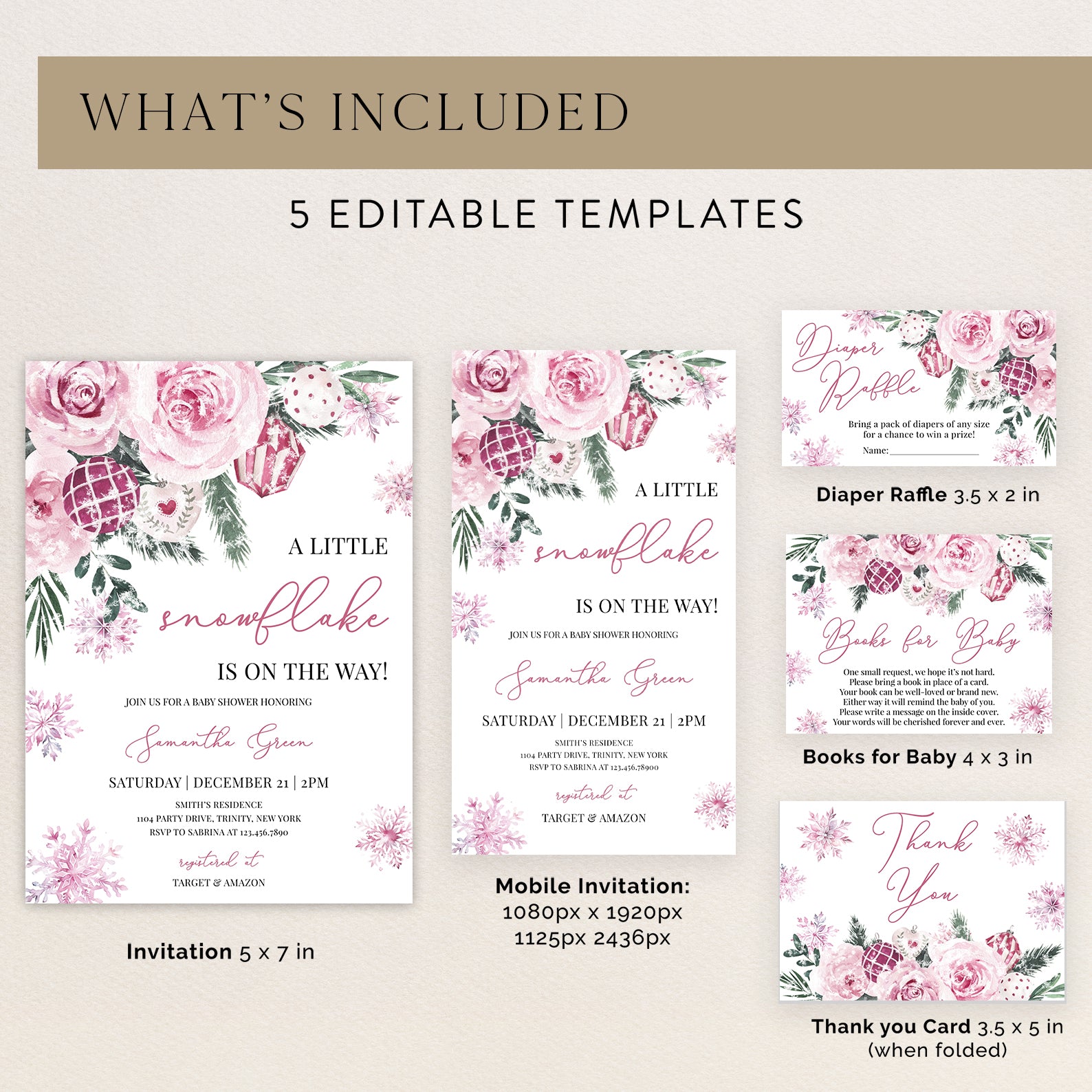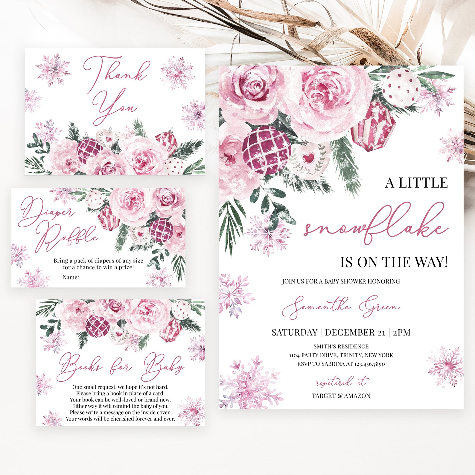 Welcome your little snowflake with our winter baby shower bundle. This set includes a digital invitation, mobile invite, diaper raffle, books for baby cards, and thank you cards, all adorned with pink roses, Christmas tree branches, and pink snowflakes for a cozy, festive touch.