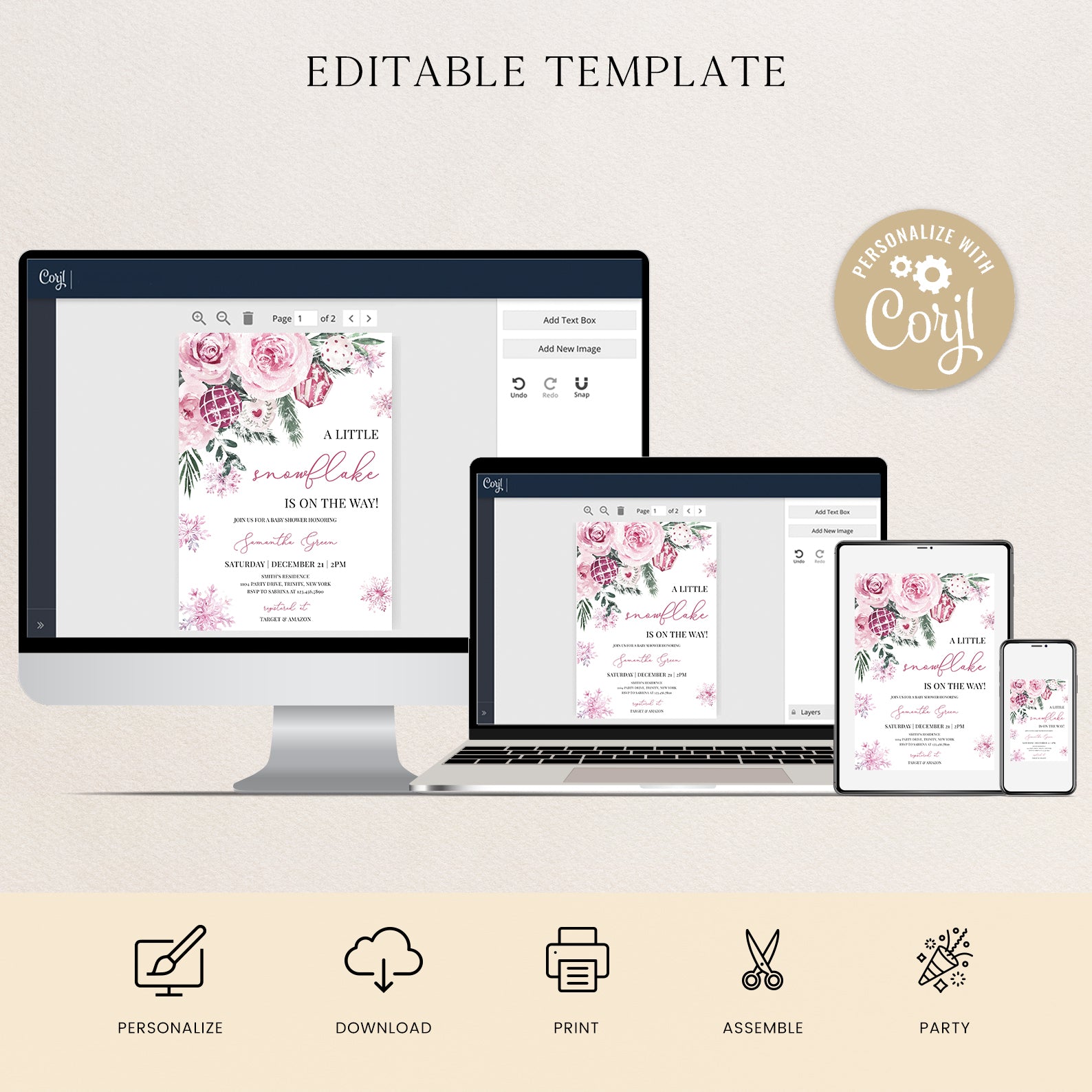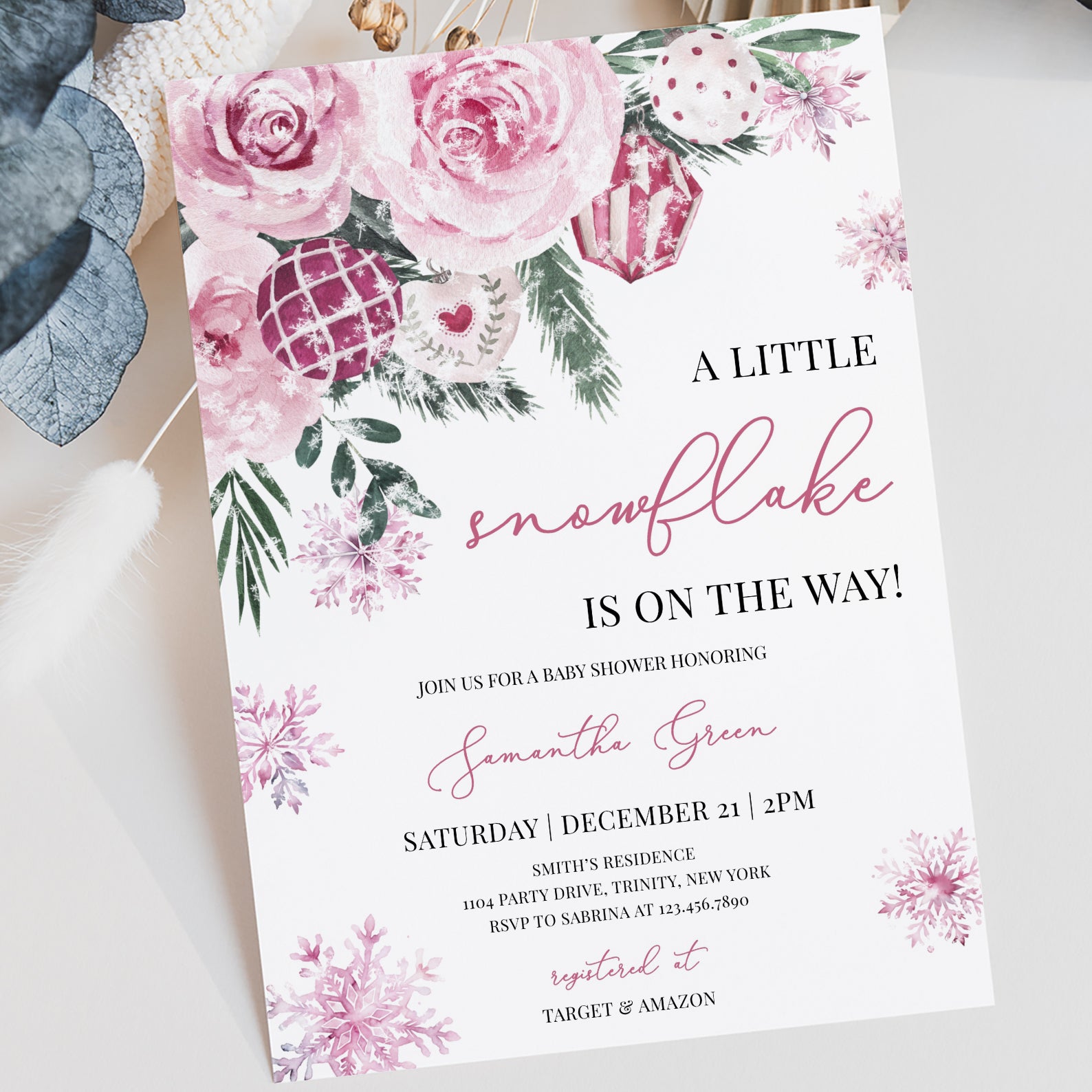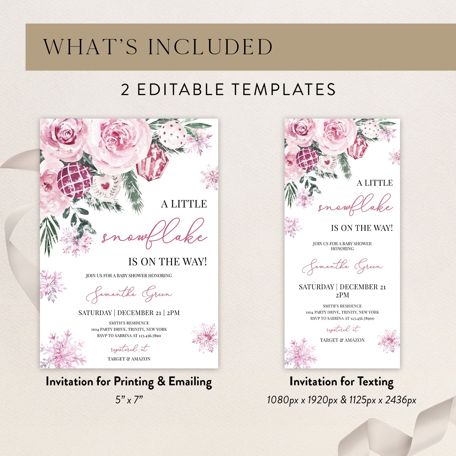 - Purchase this Pink Winter Baby Shower Invite Bundle: Snowflakes & Roses Decor template
