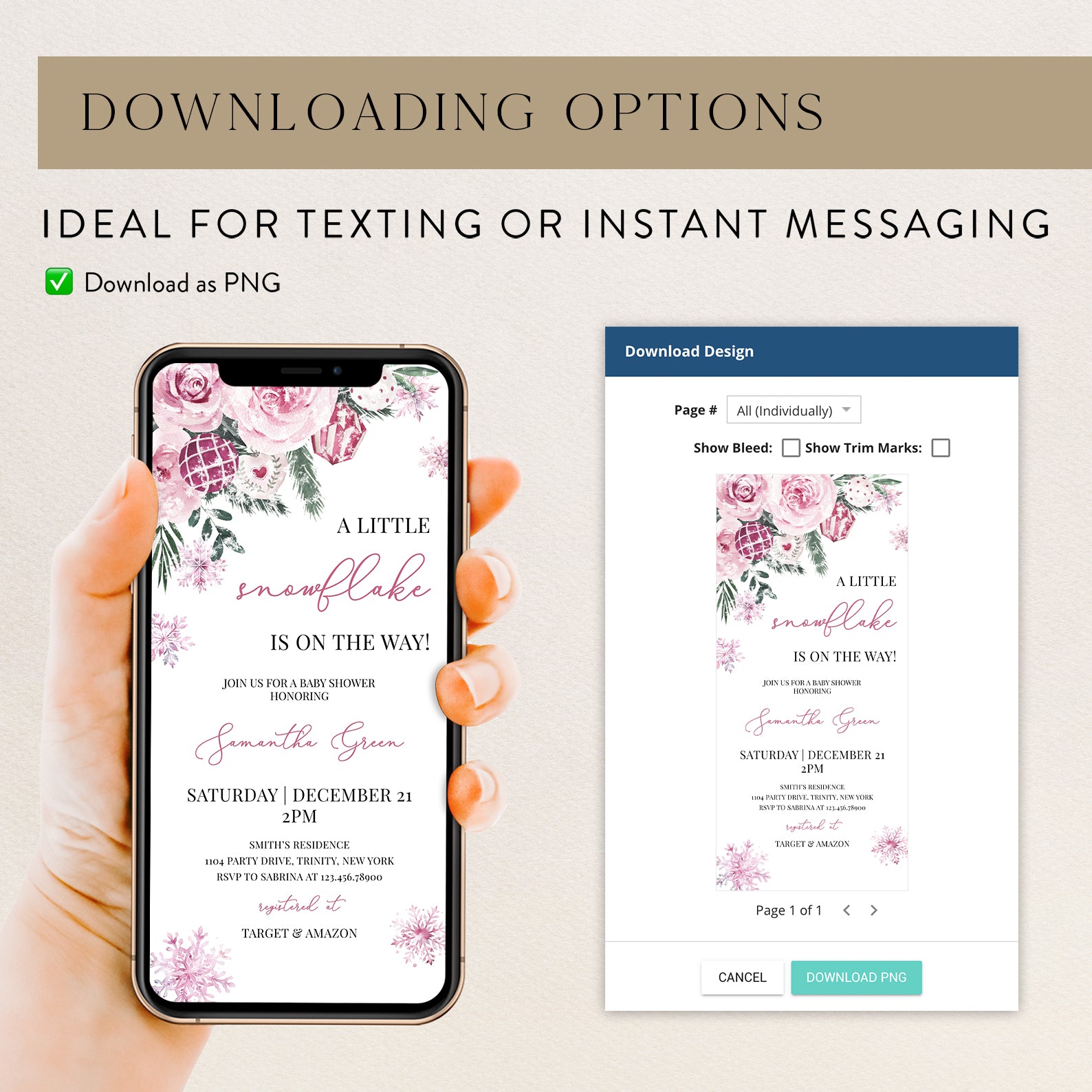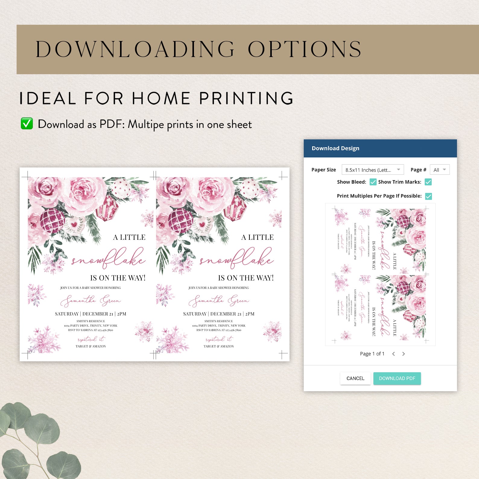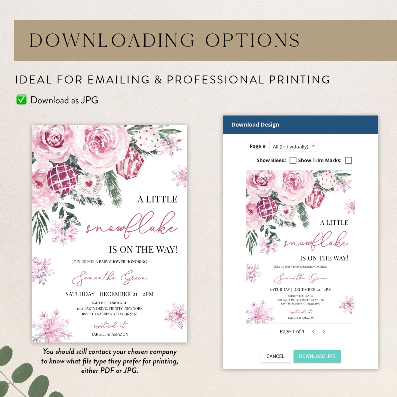 - Purchase this Pink Winter Baby Shower Invite Bundle: Snowflakes & Roses Decor template