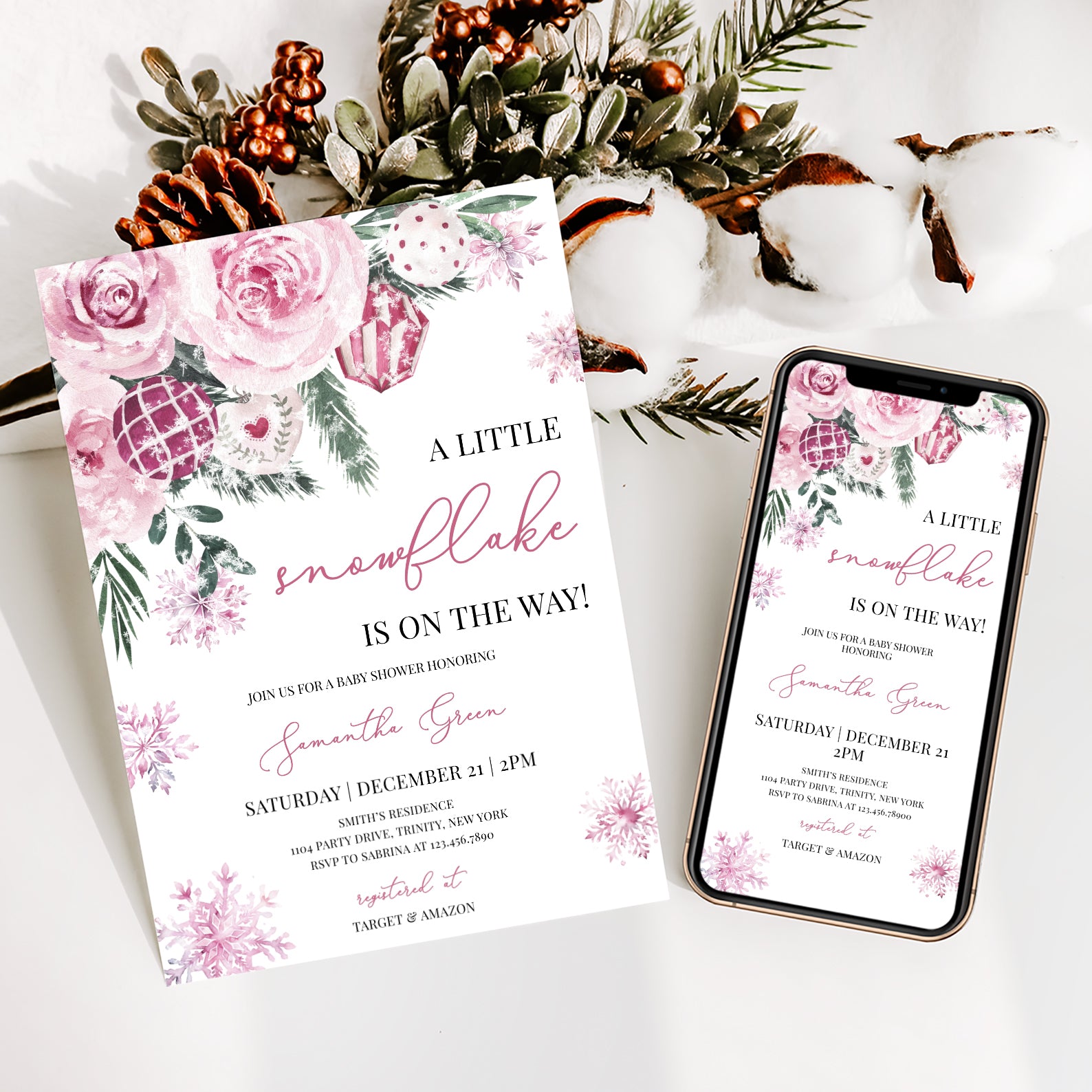 Pink Winter Baby Shower Invite Bundle: Snowflakes & Roses Decor