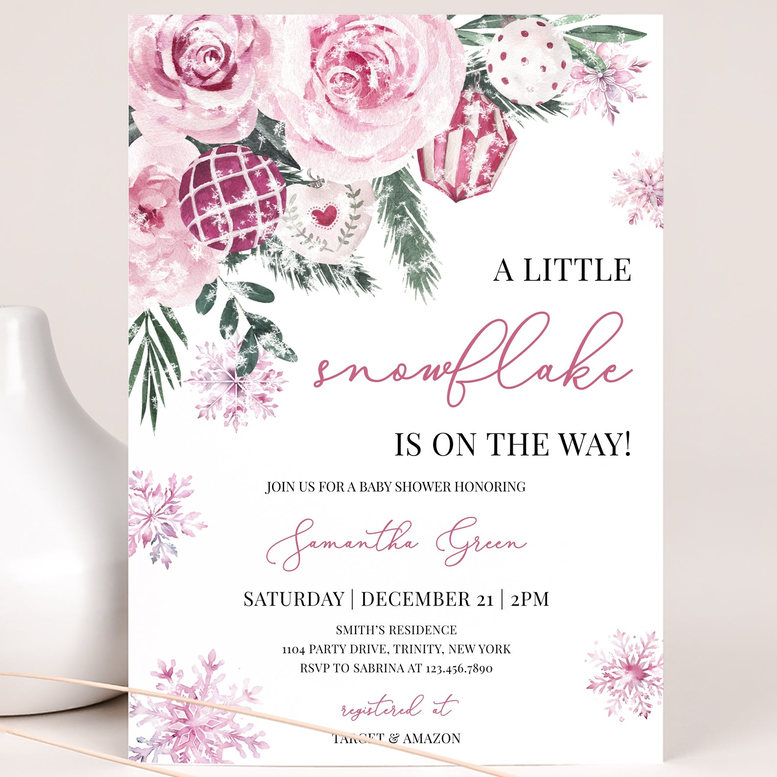 - Purchase this Pink Winter Baby Shower Invite: Snowflakes & Roses Decor template