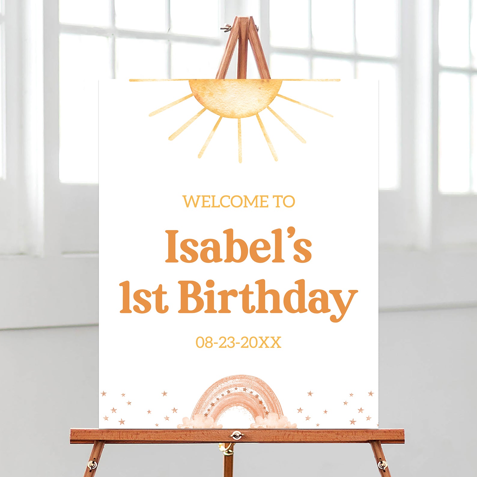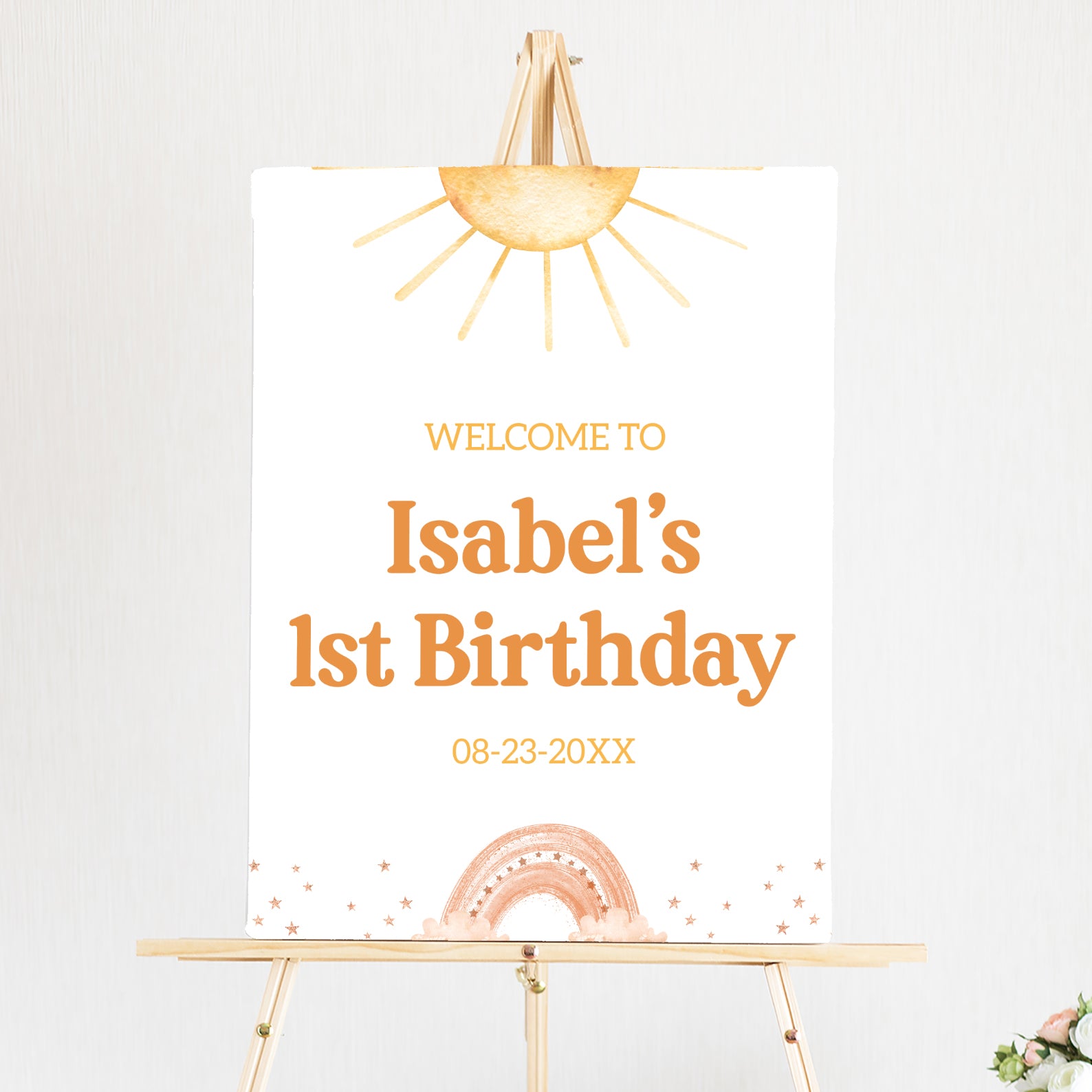 Brighten up your little one's first birthday with this adorable welcome sign! Designed in a warm summer theme, it features a cheerful upside-down half sun at the top and a charming orange rainbow with playful stars at the bottom. The vibrant colors and whimsical details create a joyful atmosphere, setting the perfect tone for a sunny and fun-filled celebration. Welcome your guests in style with this eye-catching design that adds a special touch to your child's milestone event!