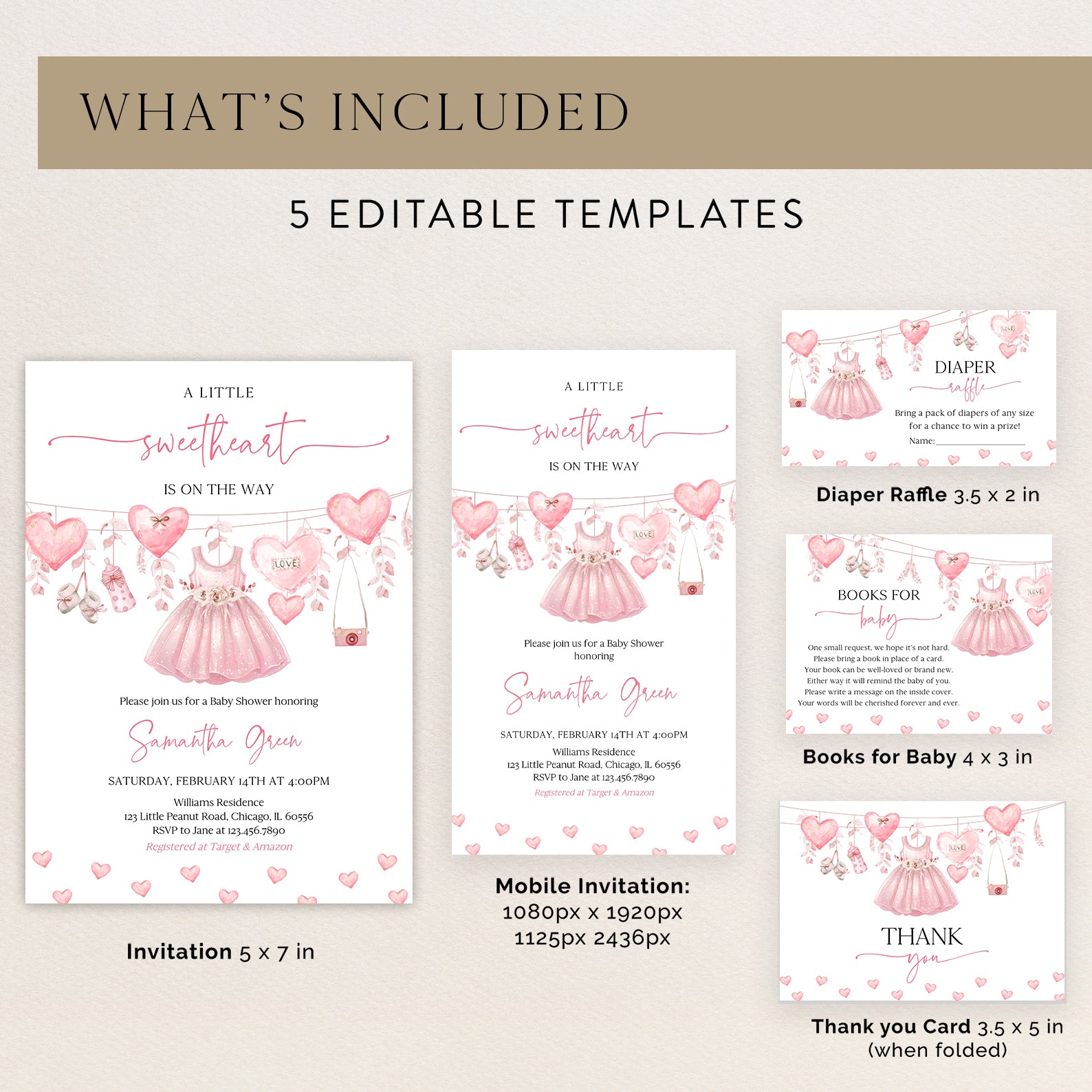 Celebrate your little sweetheart with this Valentine's baby shower bundle! Featuring hearts, baby shoes, and a pink baby dress, this charming set includes an invitation, mobile invite, diaper raffle, books for baby, and thank you card—perfect for a love-filled celebration.