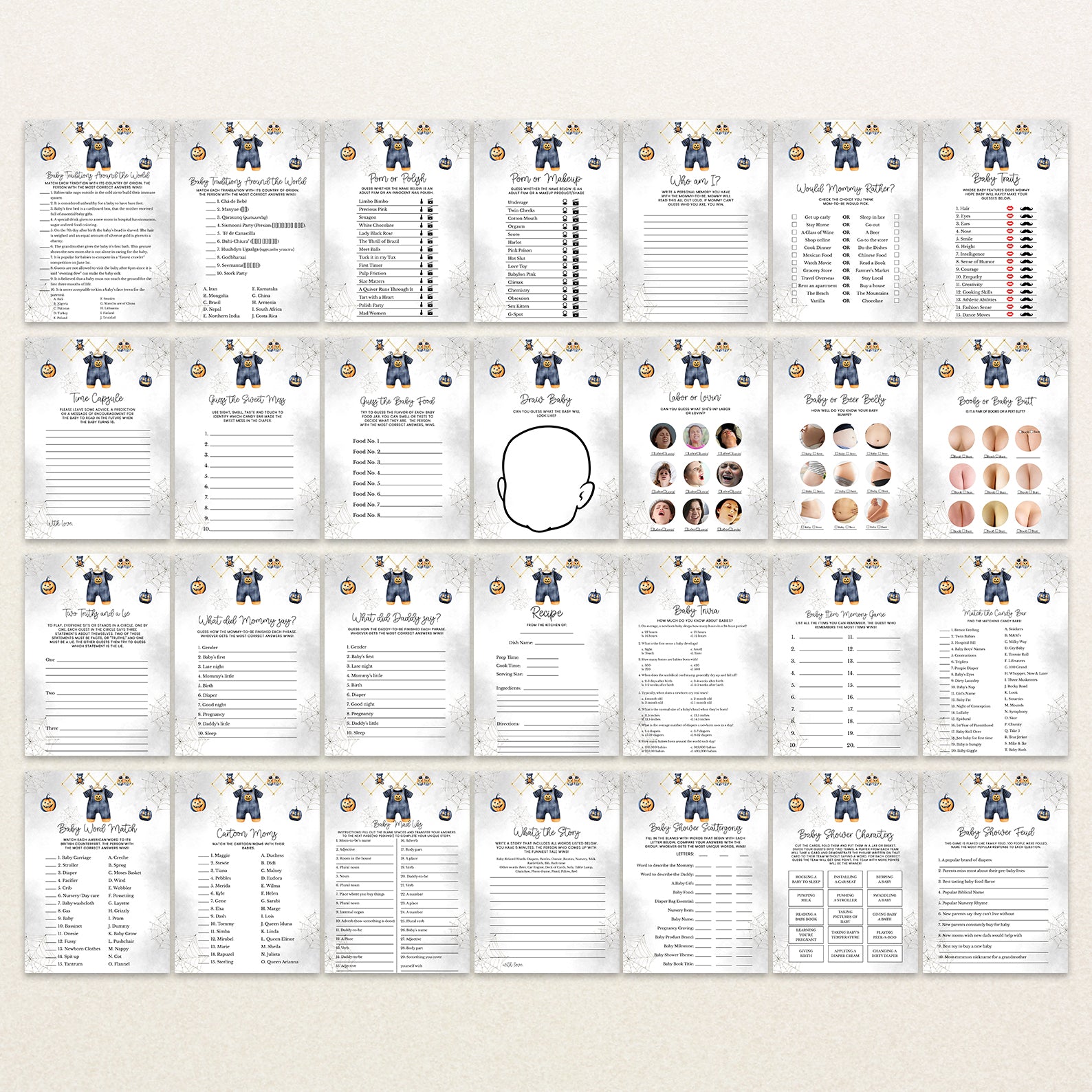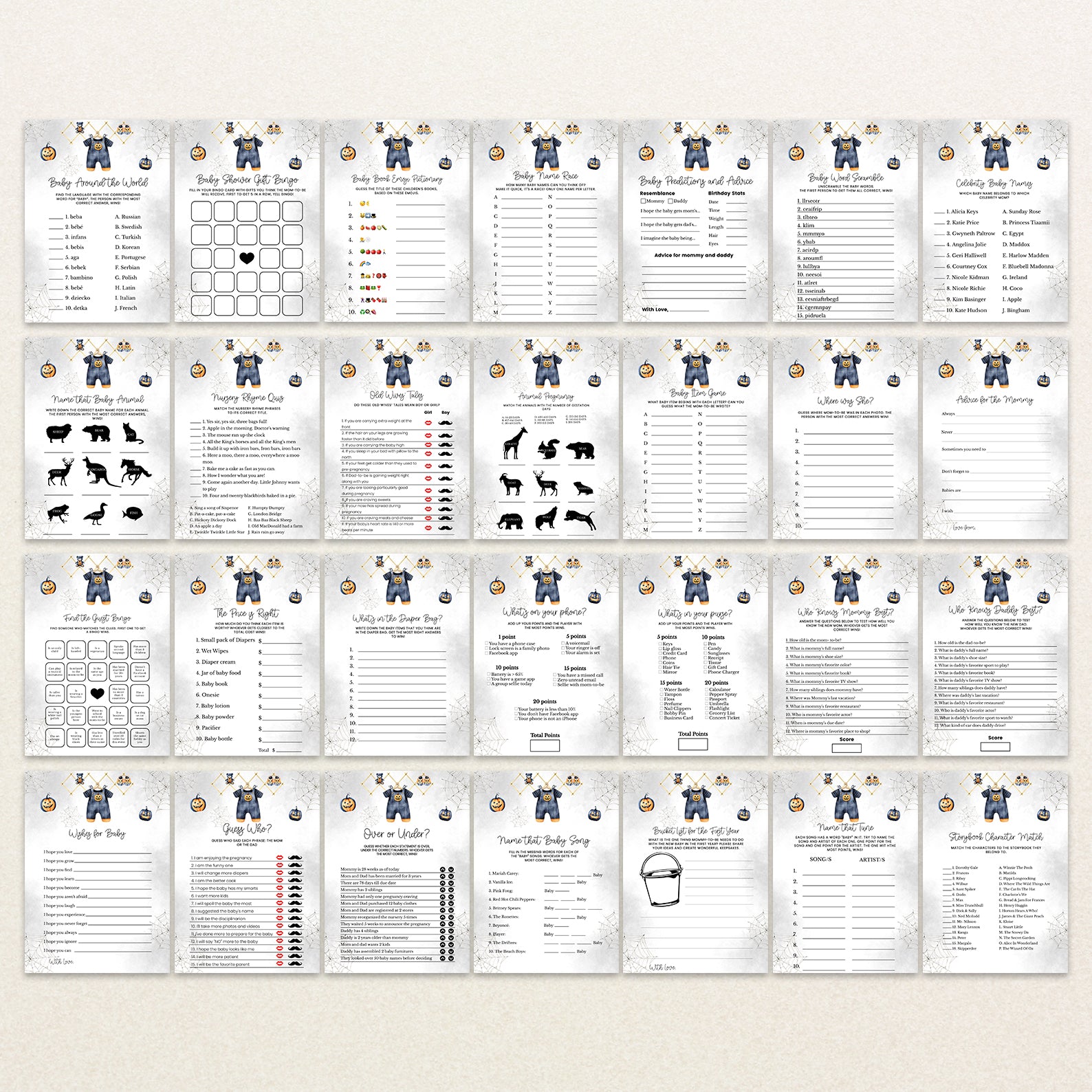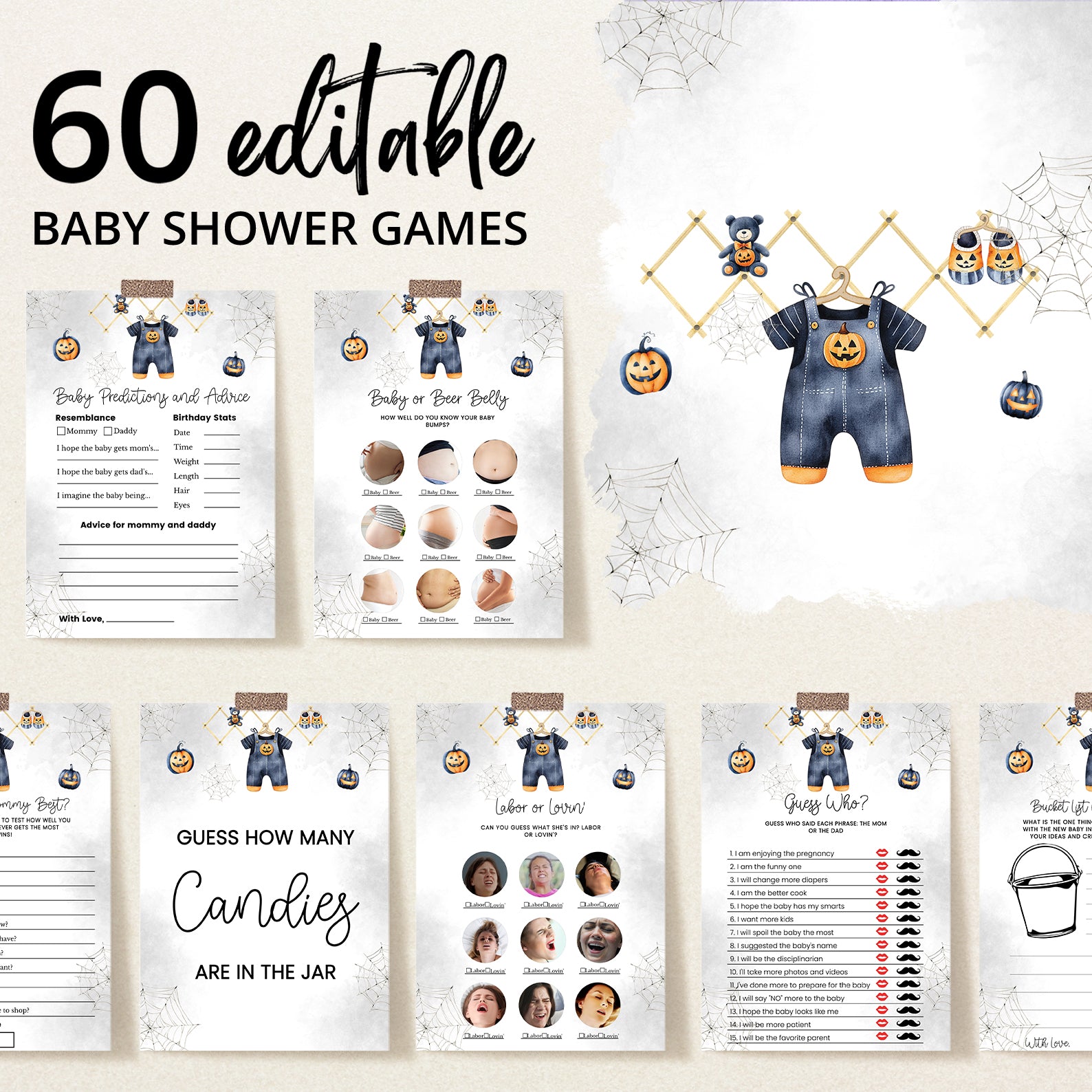 Add fun and festive entertainment to your spooky-sweet celebration with this Halloween Baby Shower Game Bundle! Featuring 60 editable games, each design matches a soft gray gradient theme with delicate spider webs, pumpkins, and cozy baby details like a teddy bear and pumpkin-print jumpsuit. From Baby Bingo to Who Knows Mommy Best, these easy-to-edit games are perfect for making your event interactive, memorable, and full of laughter.