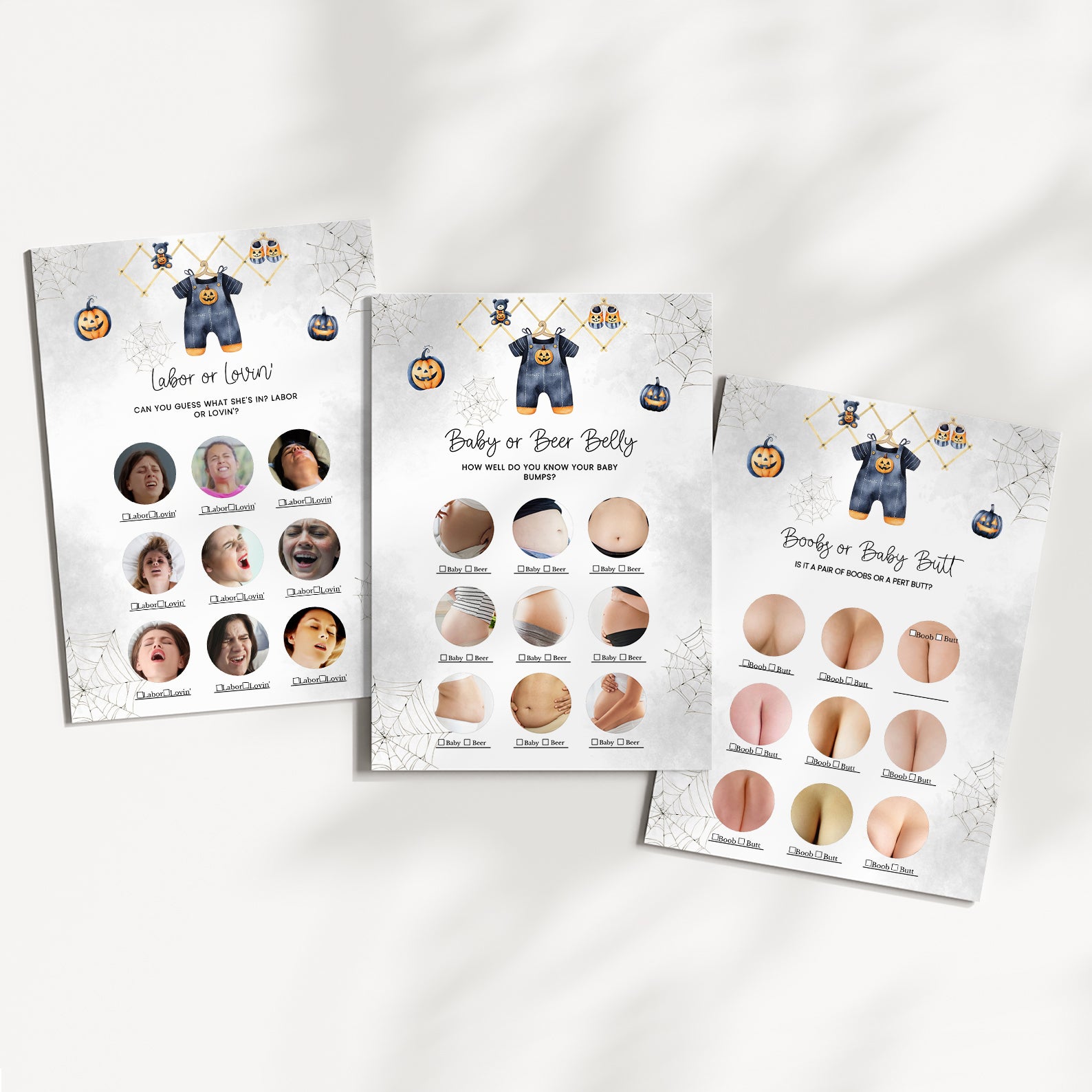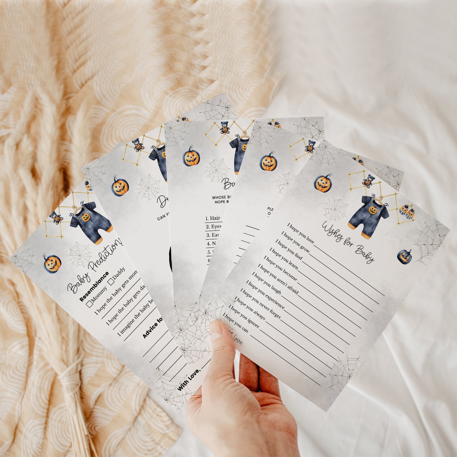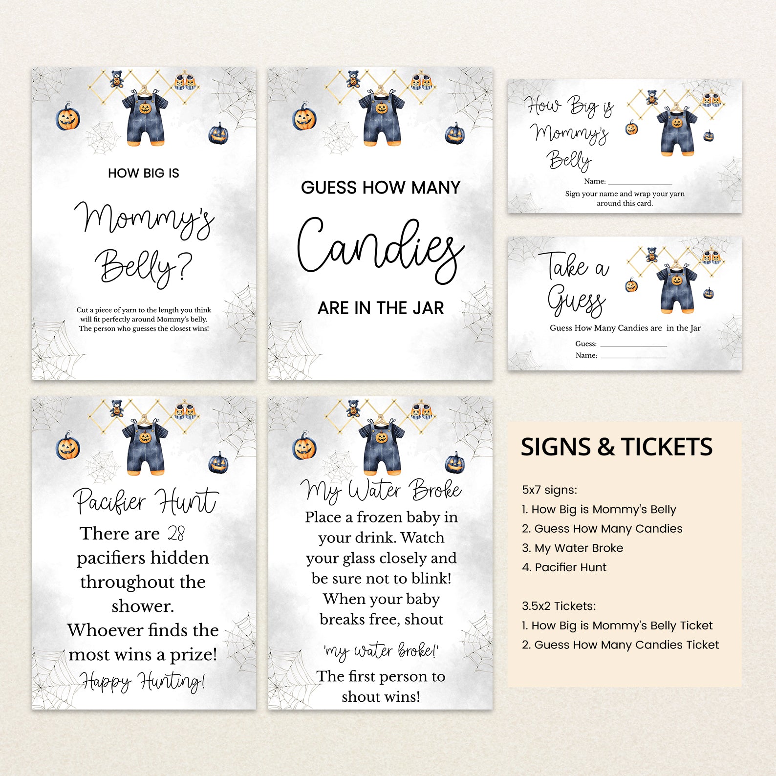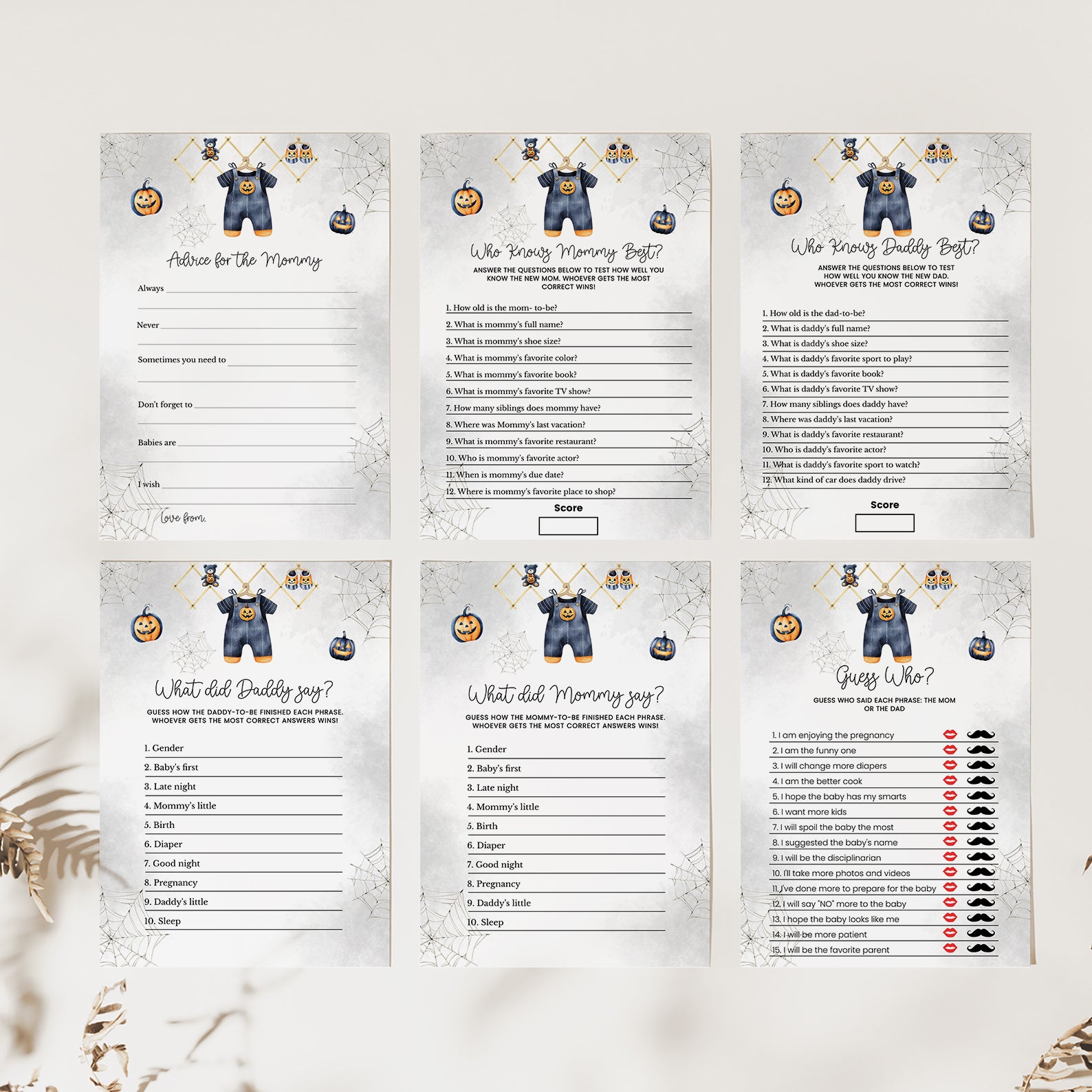 Add fun and festive entertainment to your spooky-sweet celebration with this Halloween Baby Shower Game Bundle! Featuring 60 editable games, each design matches a soft gray gradient theme with delicate spider webs, pumpkins, and cozy baby details like a teddy bear and pumpkin-print jumpsuit. From Baby Bingo to Who Knows Mommy Best, these easy-to-edit games are perfect for making your event interactive, memorable, and full of laughter.