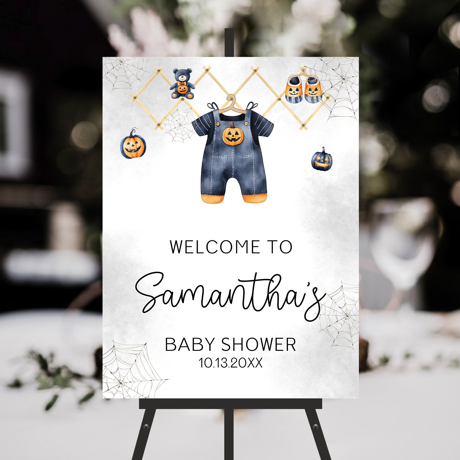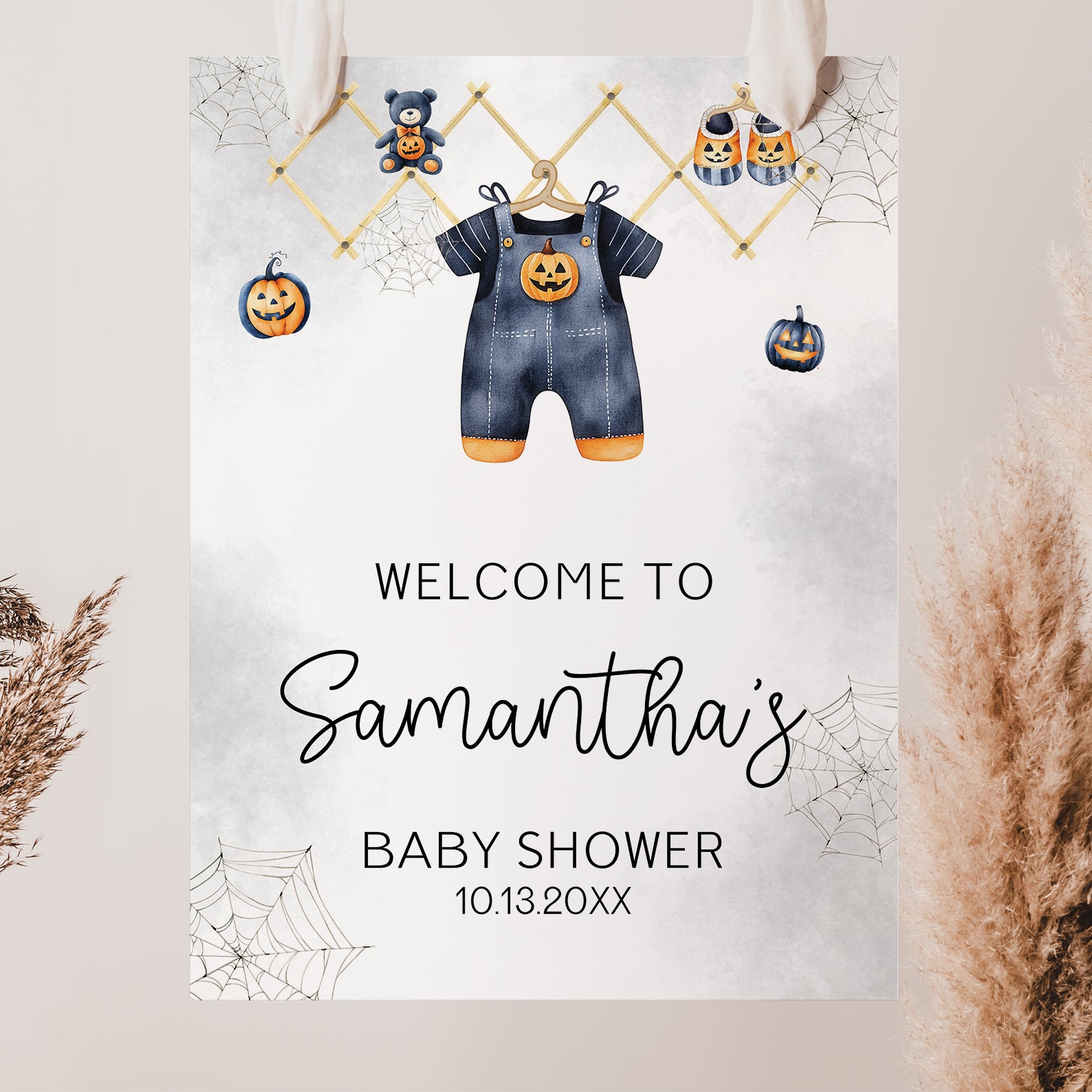 Welcome your guests in spook-tacular style with this Halloween baby shower welcome sign! Set on a soft gray gradient background, it features a wooden accordion wall hanger decorated with a plush teddy bear, pumpkin-pocket baby outfit, and tiny pumpkin-faced shoes. Accented with spider webs and Halloween pumpkins, this charming design blends cozy baby details with seasonal flair perfect for greeting friends and family as they gather to celebrate your little pumpkin on the way!