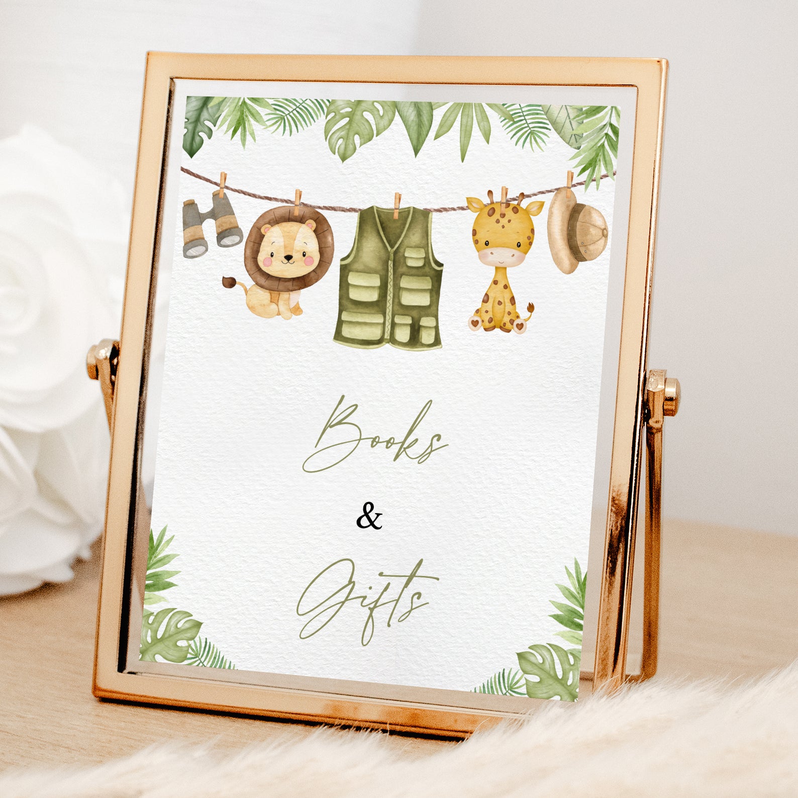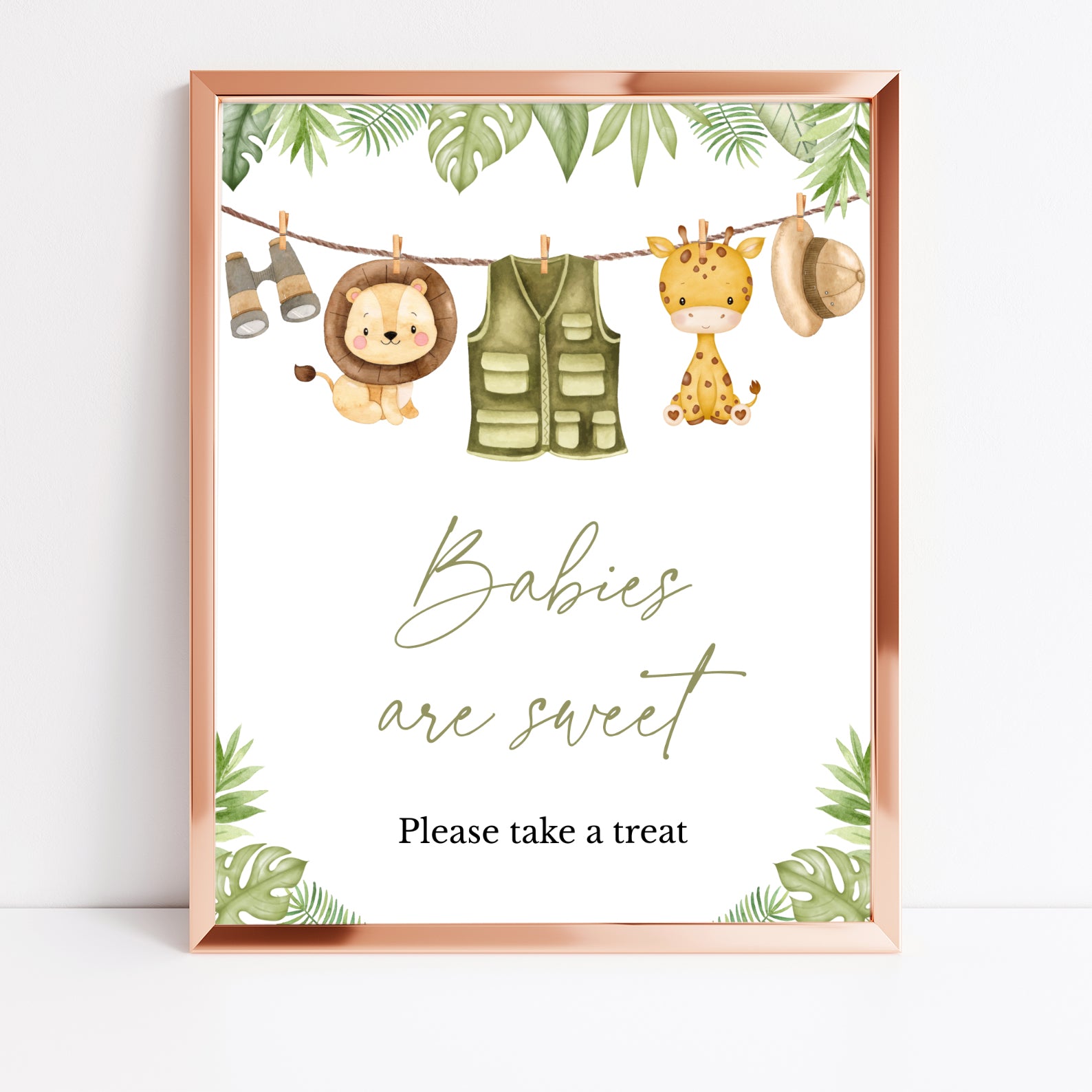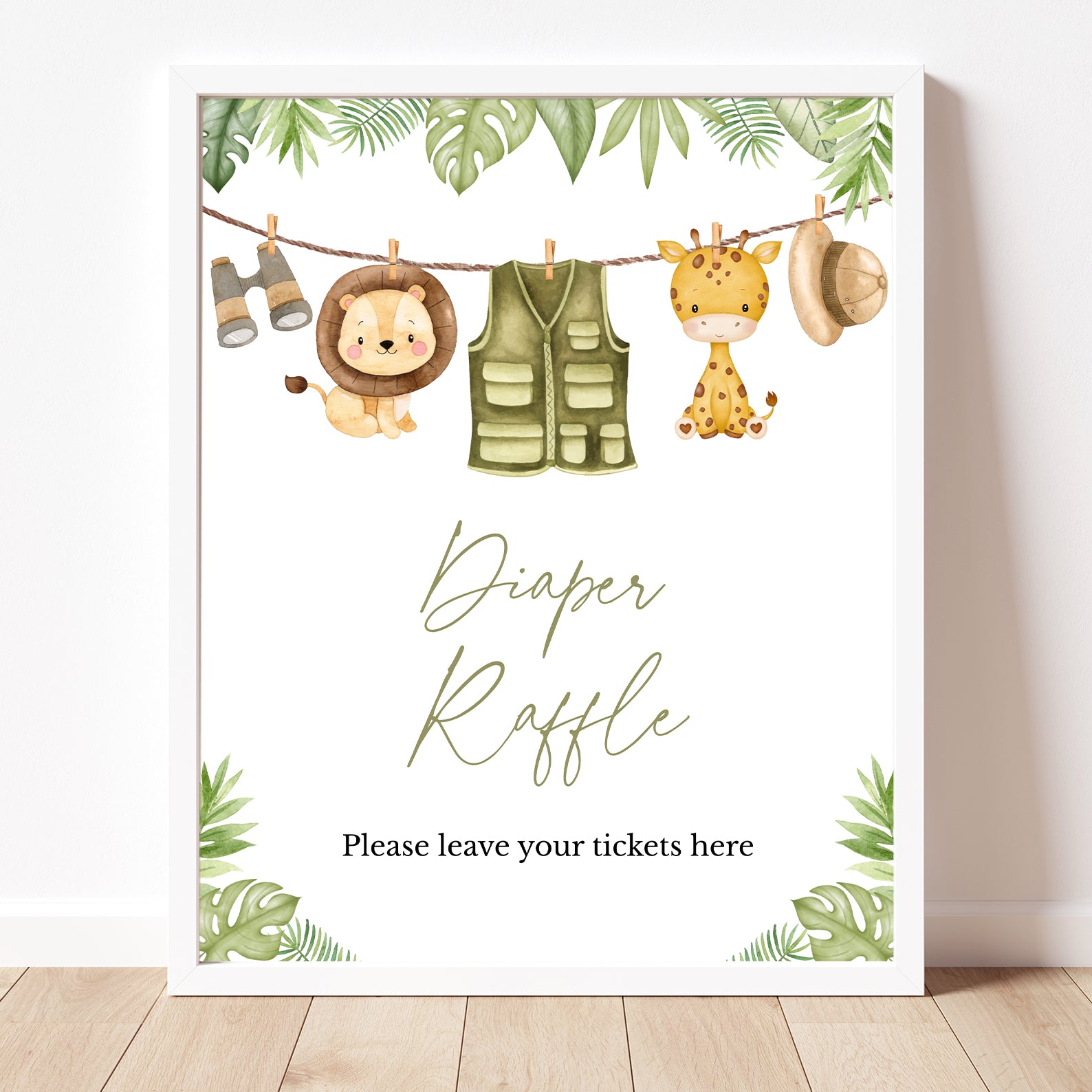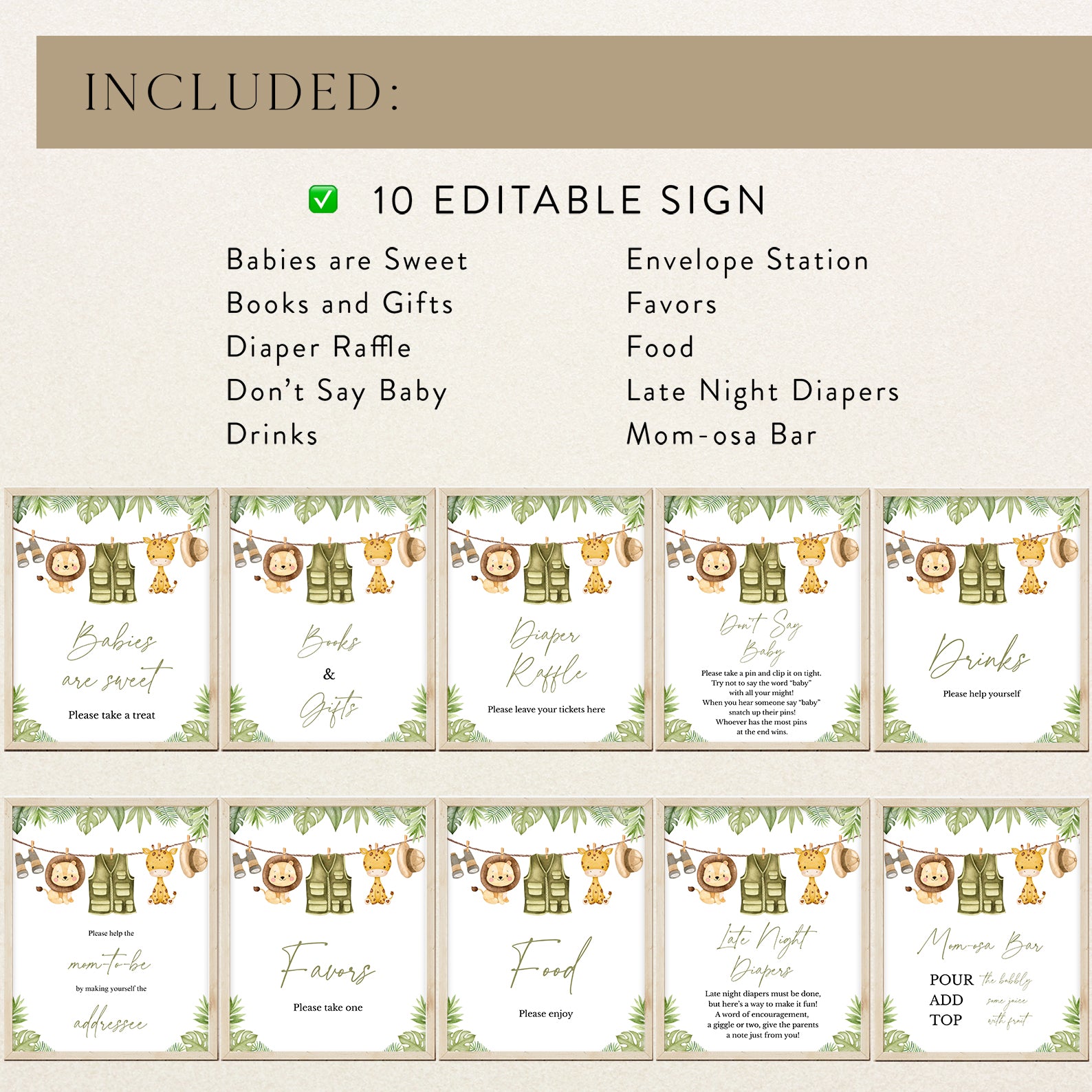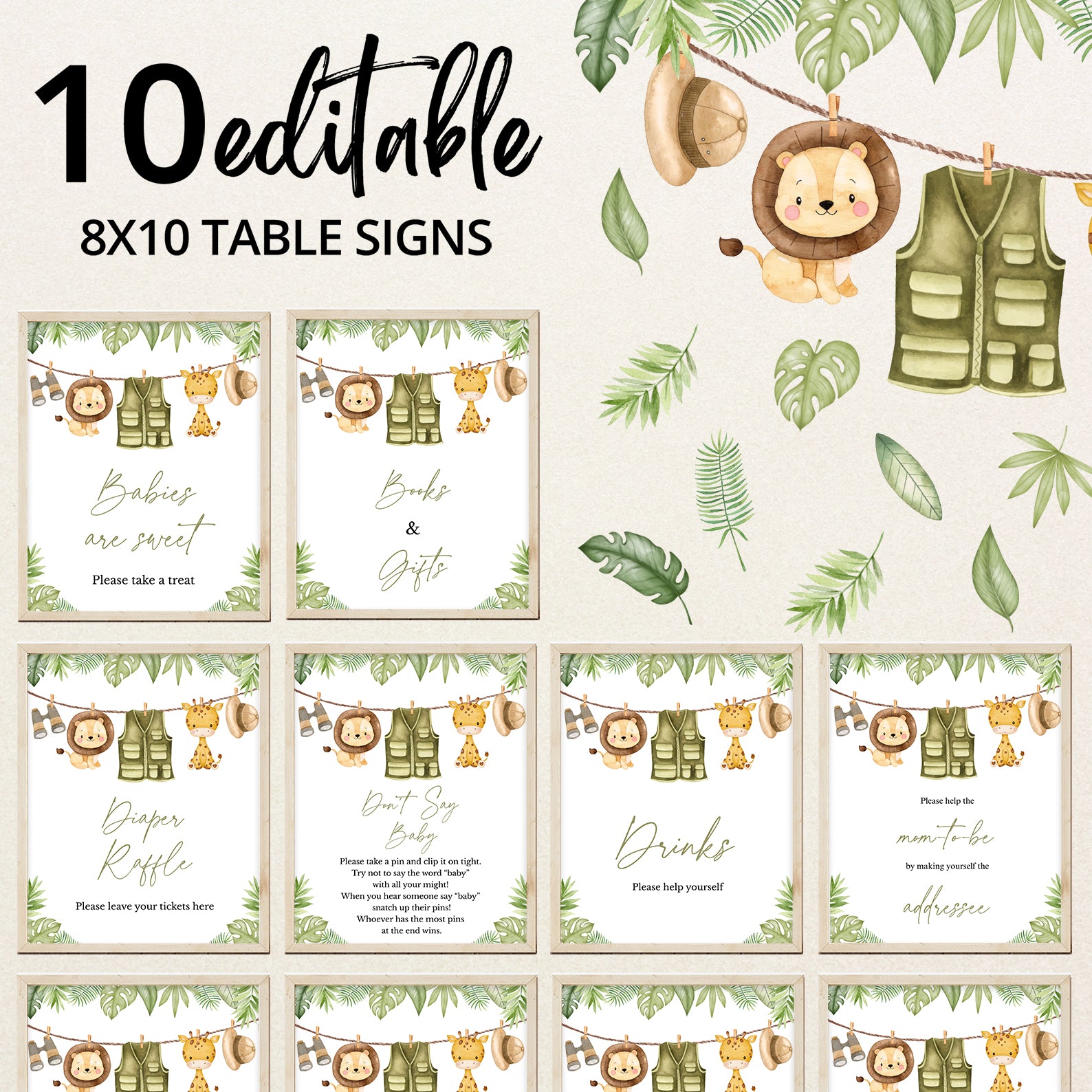 Bring a touch of adventure to your baby shower with this set of ten editable table signs, inspired by a charming jungle safari theme. Featuring lush green leaves, playful illustrations of a telescope, a friendly lion, a tall giraffe, and stylish safari accessories, these signs add a whimsical and adventurous touch to your celebration. The set includes Babies Are Sweet, Books and Gifts, Diaper Raffle, Don't Say Baby, Drinks, Envelope Station, Favors, Food, Late Night Diapers, and Mom-osa Bar, making it a perfect addition to your wild little one's special day!