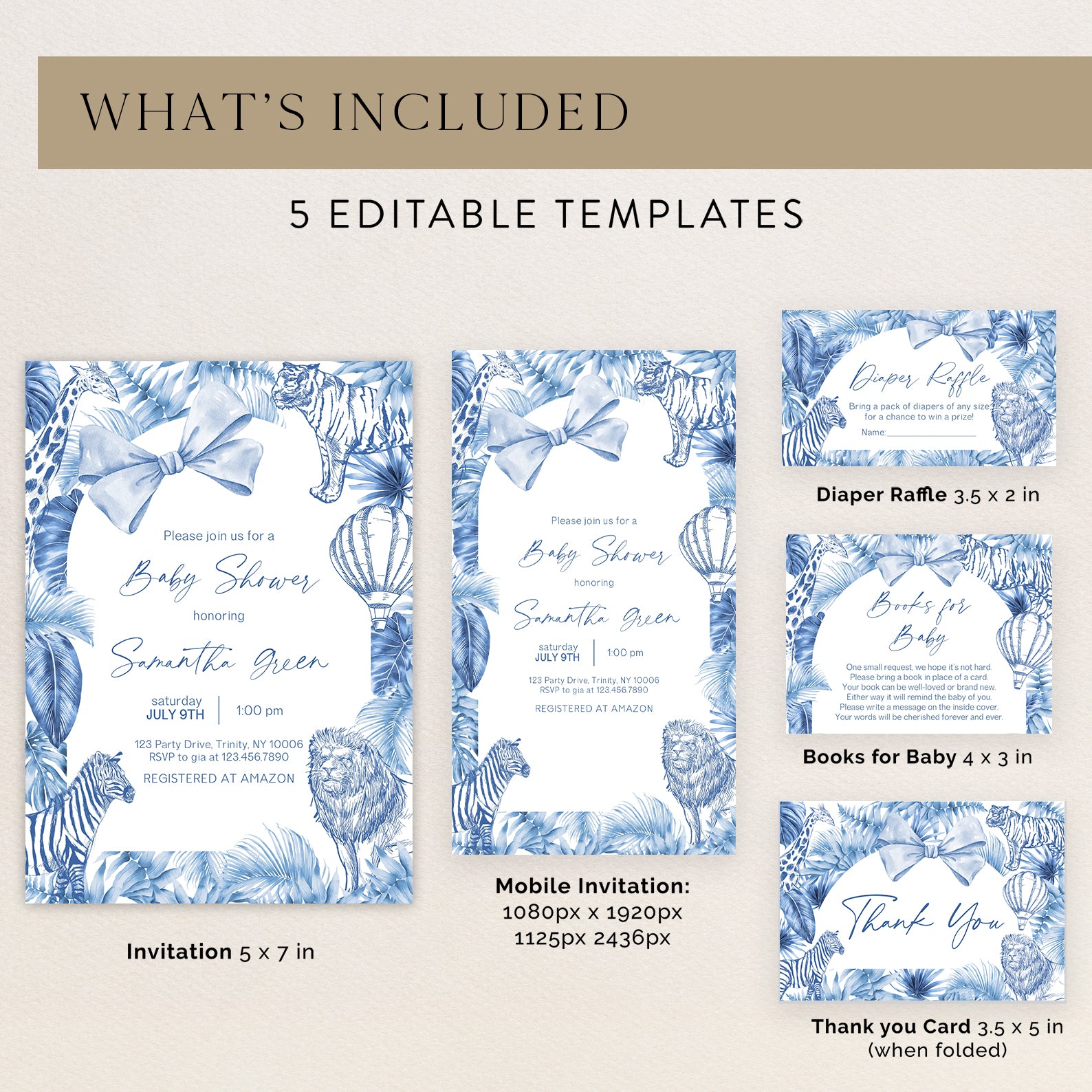 Celebrate your baby boy with this elegant safari-themed invitation bundle! Featuring a toile de jouy border with zebra, lion, tiger, and giraffe among jungle leaves, a soft blue arch frames your details with a sweet ribbon topper and whimsical hot air balloon. Includes a main invite, mobile version, diaper raffle, books for baby, and thank you card—perfect for a stylish and cohesive baby shower.