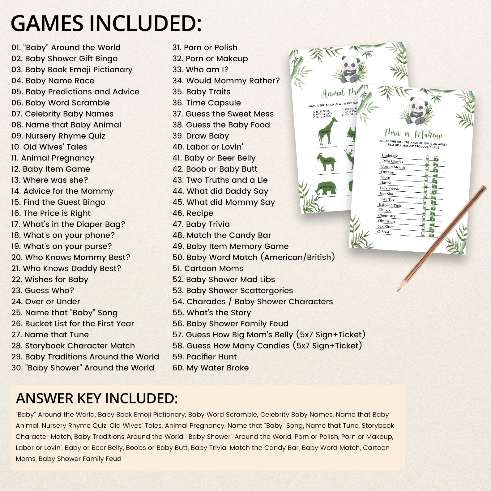 Celebrate your little one's upcoming arrival with our charming baby shower game bundle, featuring a sweet panda theme! Elegant green bamboo leaves frame the top and bottom, while an adorable baby panda sits at the center, adorned with shimmering gold accents. This beautifully coordinated bundle includes 60 fun and engaging baby shower games, perfect for entertaining guests and creating lasting memories. Whether you're planning a cozy gathering or a lively celebration, this playful and elegant design sets the perfect tone for your special day.