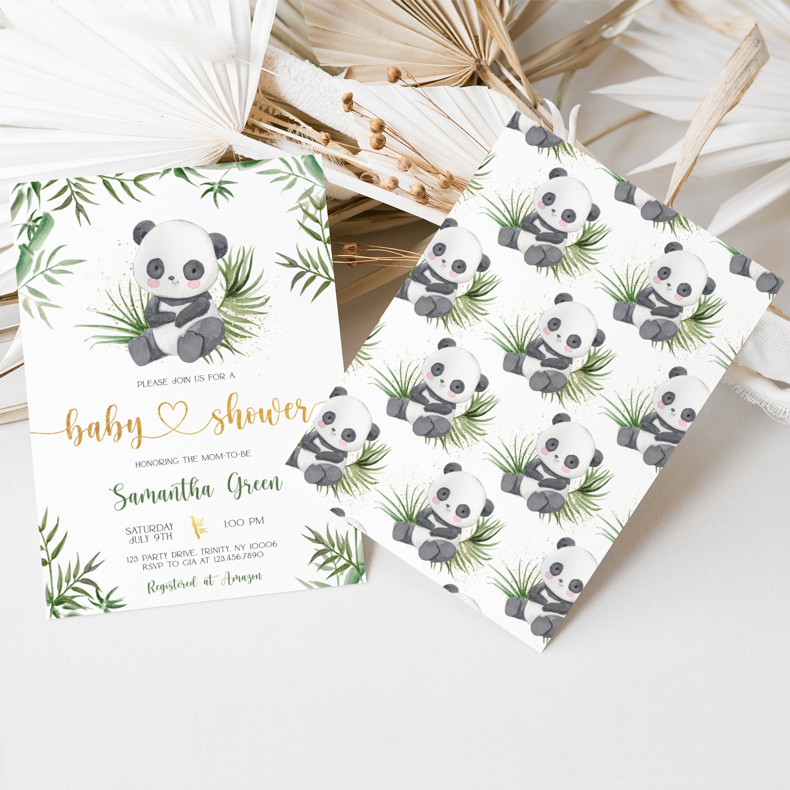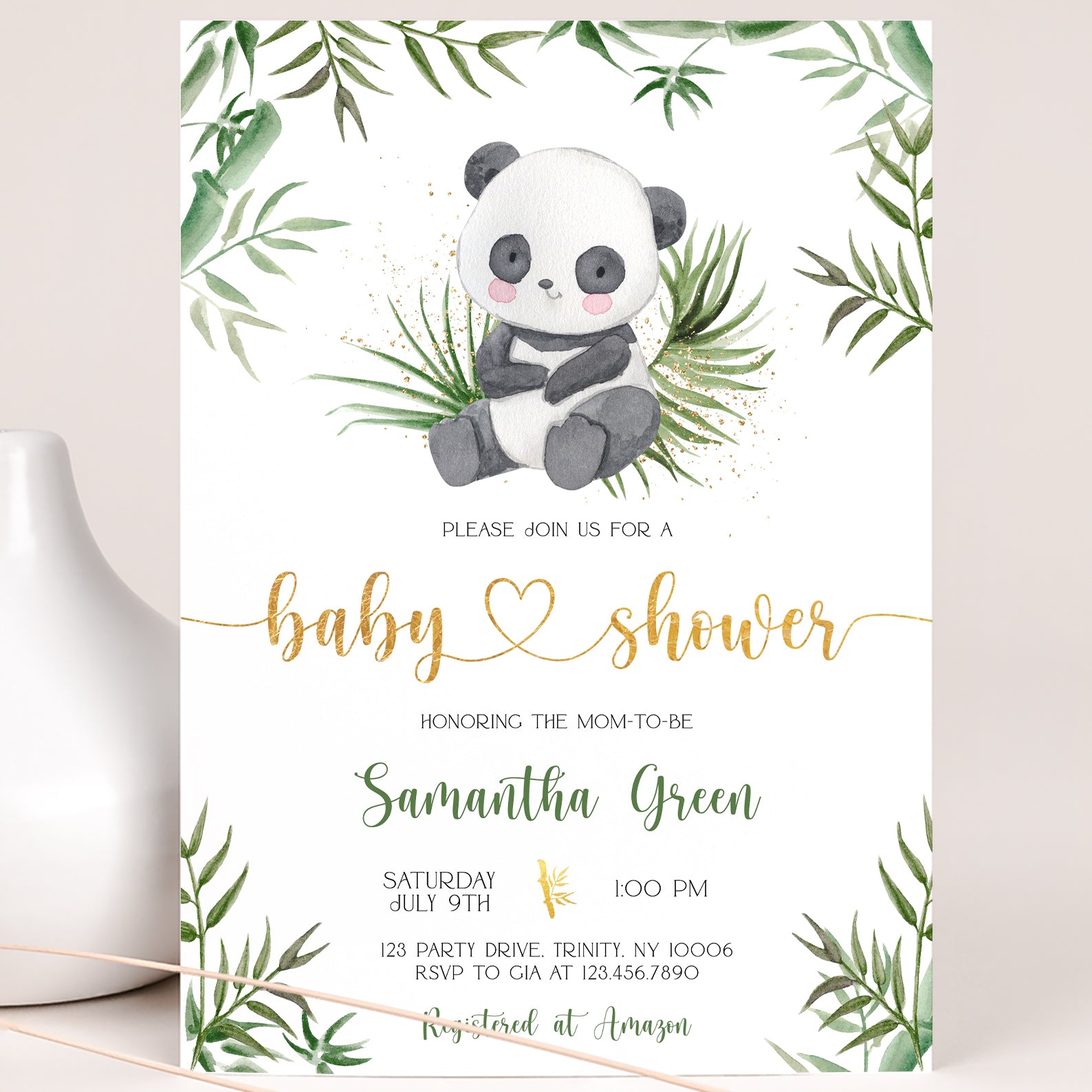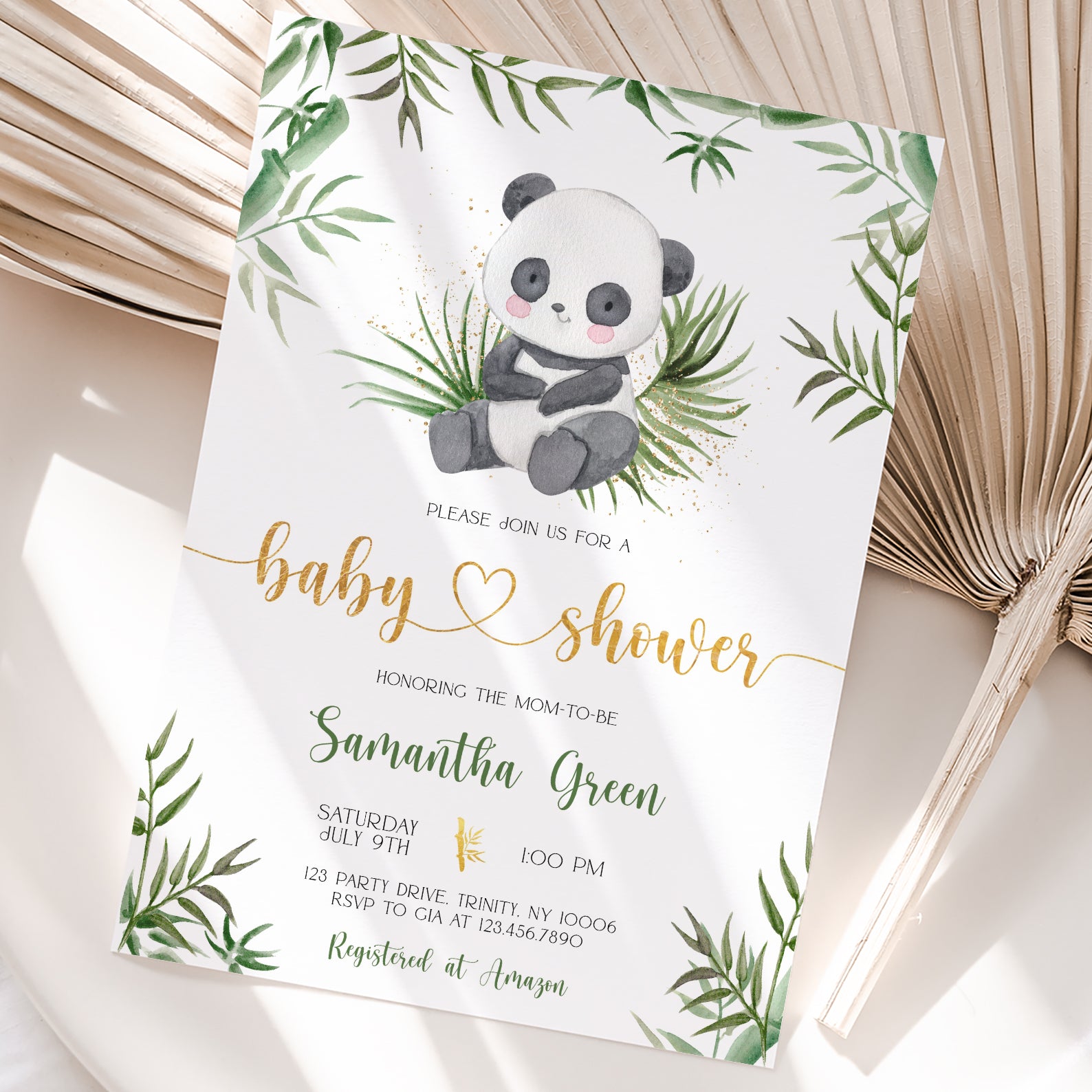 - Purchase this Cute Panda Baby Shower Digital Invite: Bamboo & Gold Accents template
