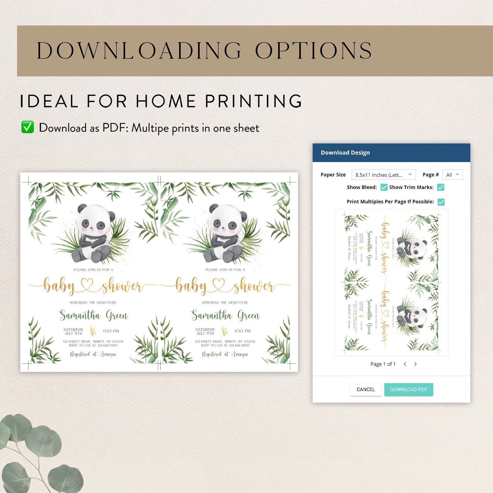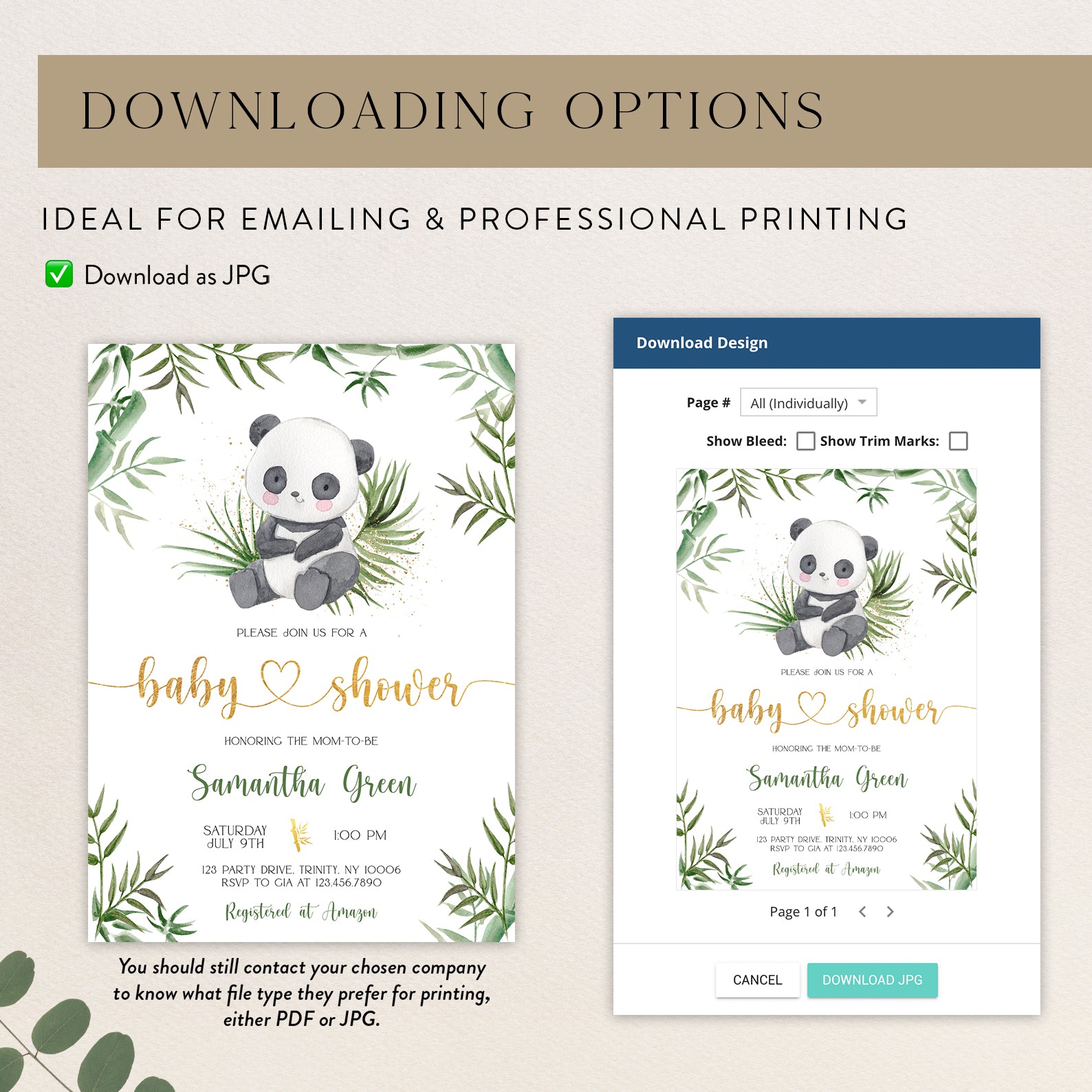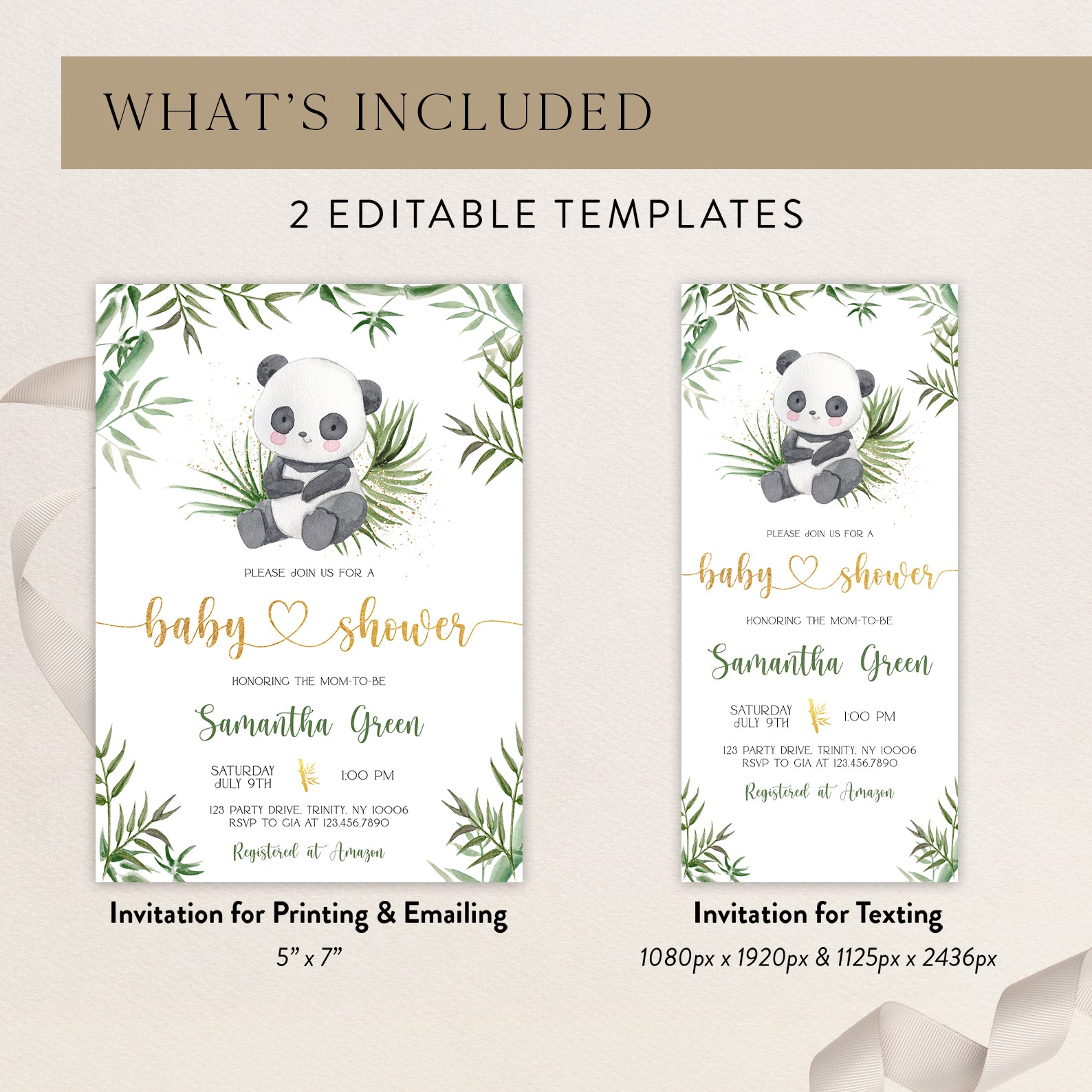- Purchase this Cute Panda Baby Shower Digital Invite: Bamboo & Gold Accents template