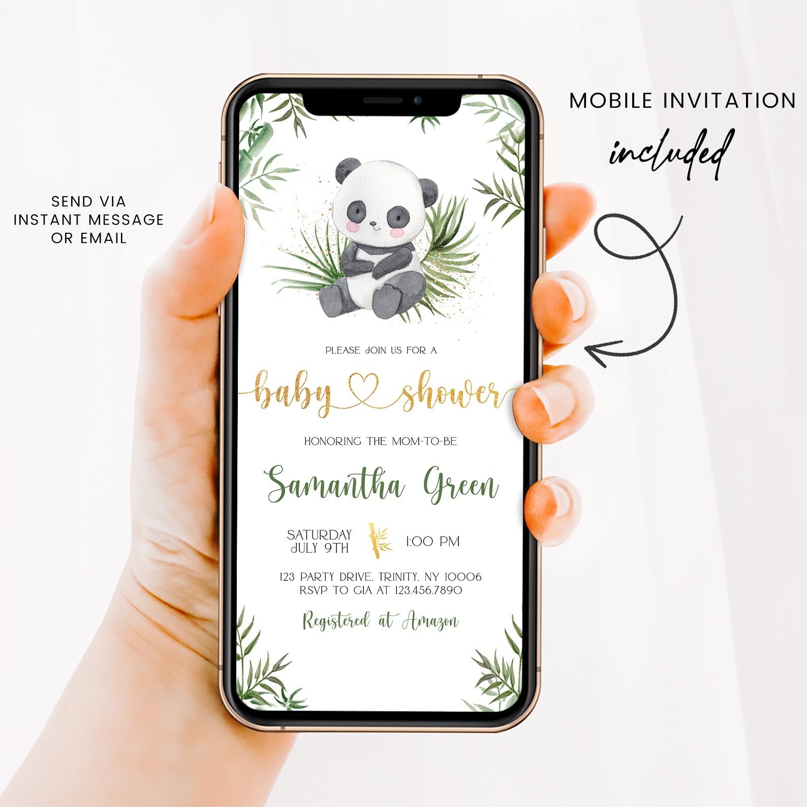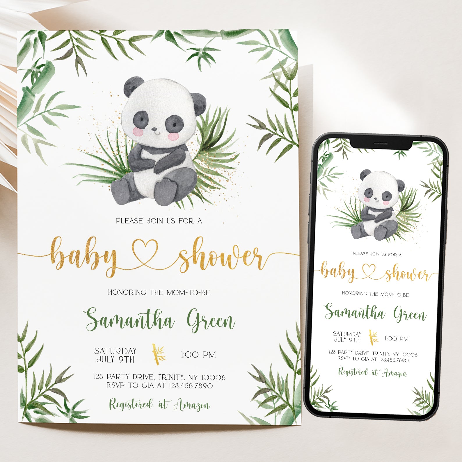 Cute Panda Baby Shower Digital Invite: Bamboo & Gold Accents