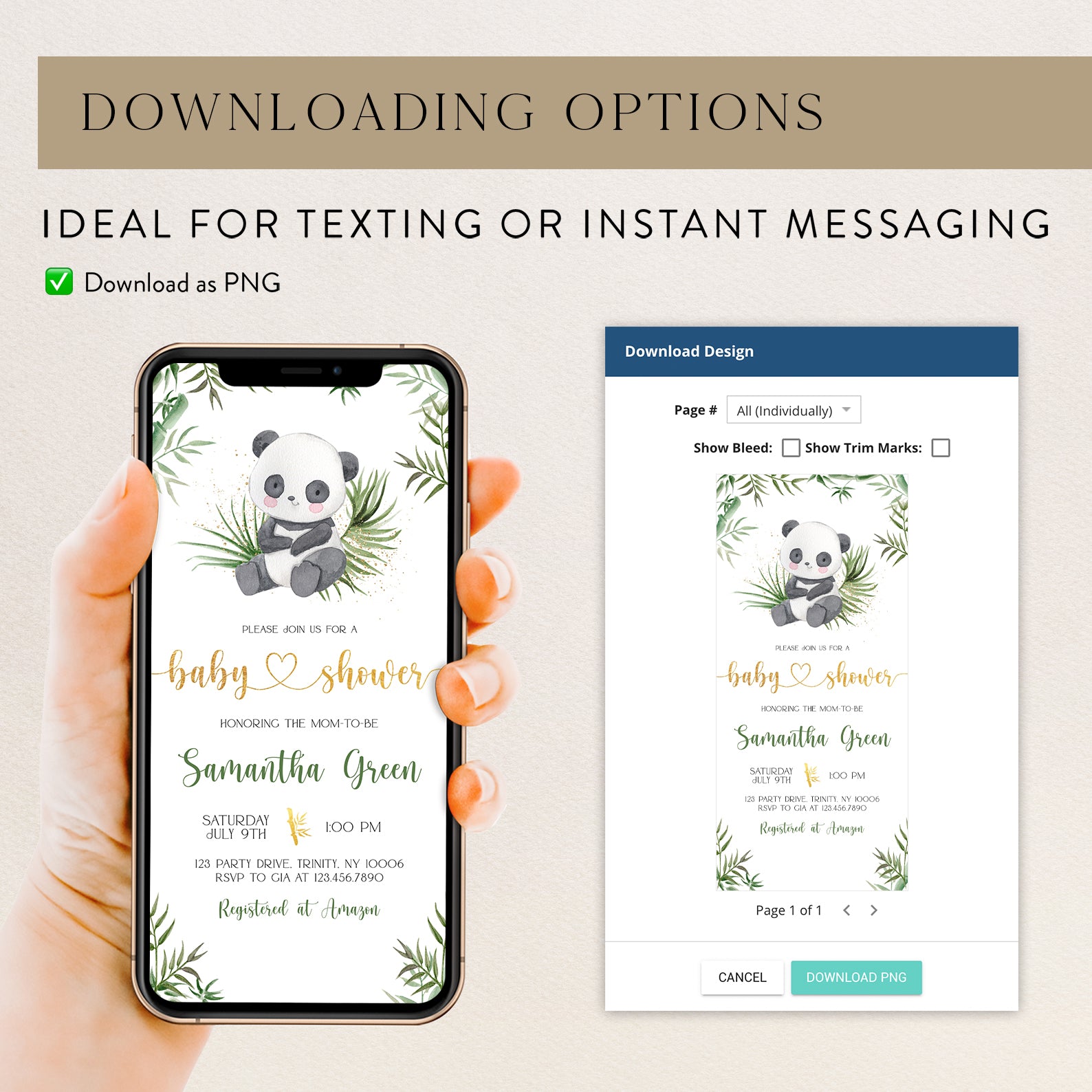 Celebrate your little one's upcoming arrival with our charming baby shower digital invitation! Featuring elegant green bamboo leaves framing the top and bottom, this delightful design showcases an adorable baby panda at the center, beautifully adorned with bamboo leaves and shimmering gold accents. Perfect for setting a joyful tone for your celebration, this invitation is not only visually stunning but also easy to share with friends and family, making your baby shower planning a breeze.