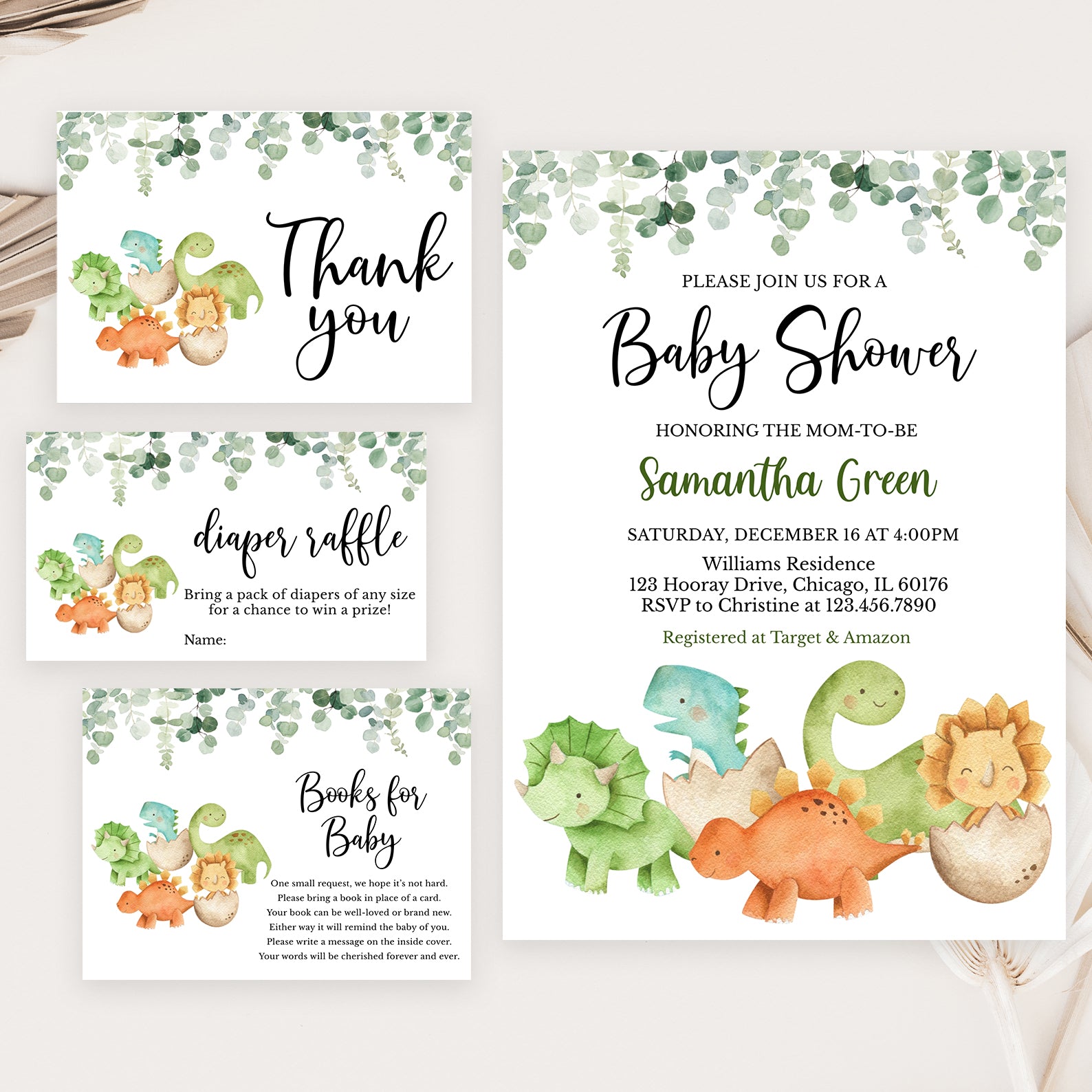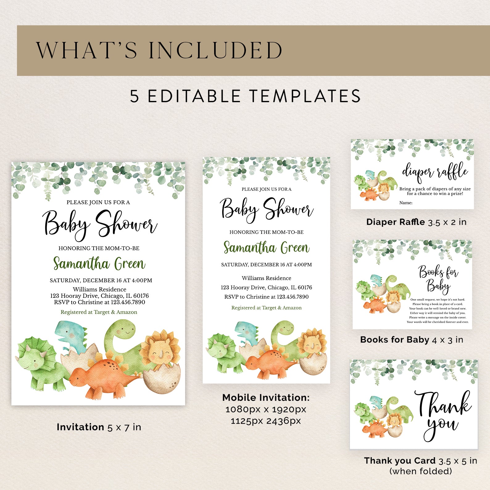 - Purchase this Dinosaur Baby Shower Invitation Bundle with Greenery & Cute Dinos template