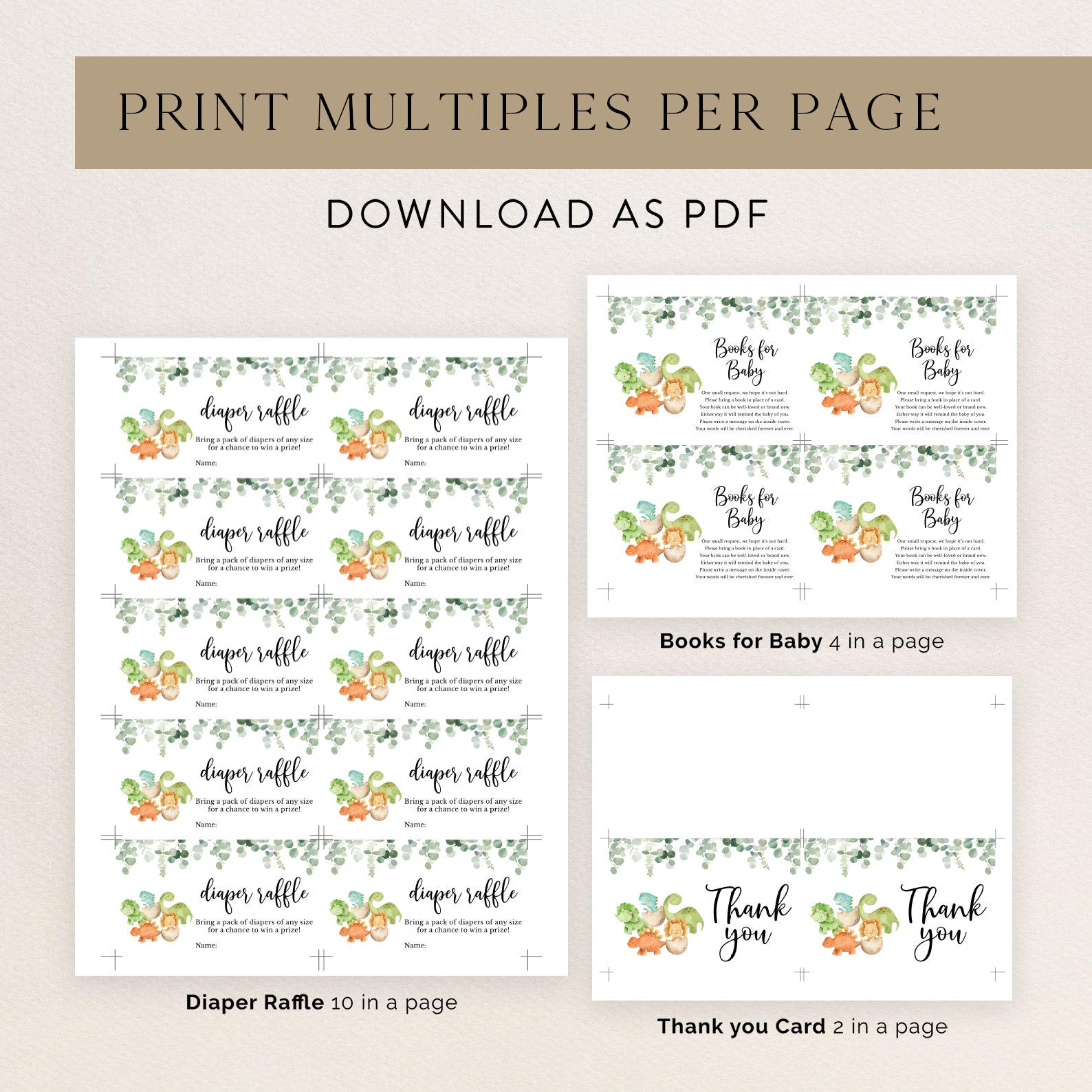 Bring your dino party to life with our Dinosaur Baby Shower Invitation Bundle! Featuring lush green leaves at the top and playful baby dinosaurs hatching from eggs below, this bundle includes an editable invitation, mobile invite, diaper raffle card, books for baby card, and thank you card. Perfect for parents-to-be who love a whimsical dinosaur theme, this bundle makes celebrating your little one both fun and stylish.