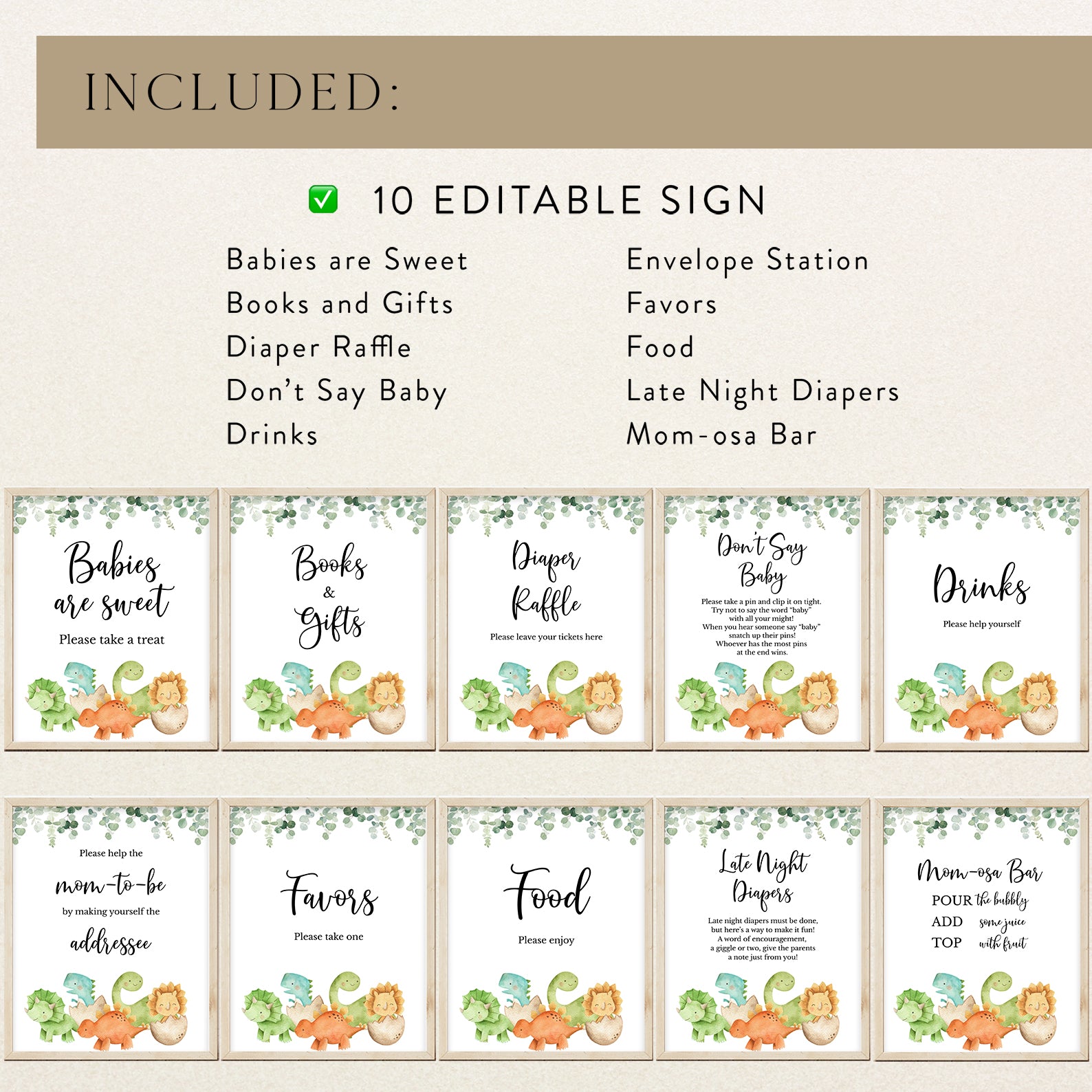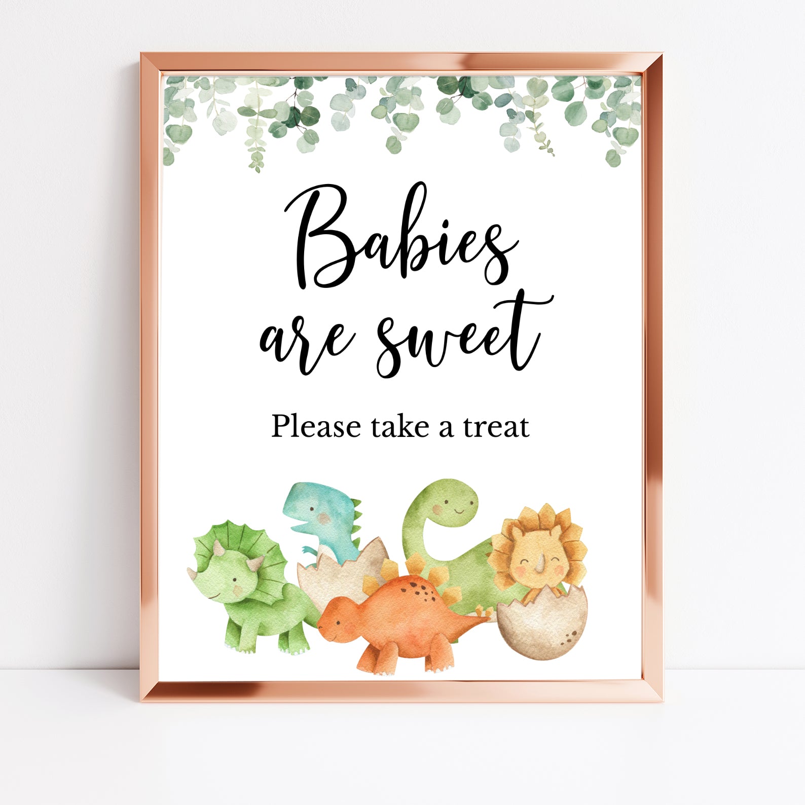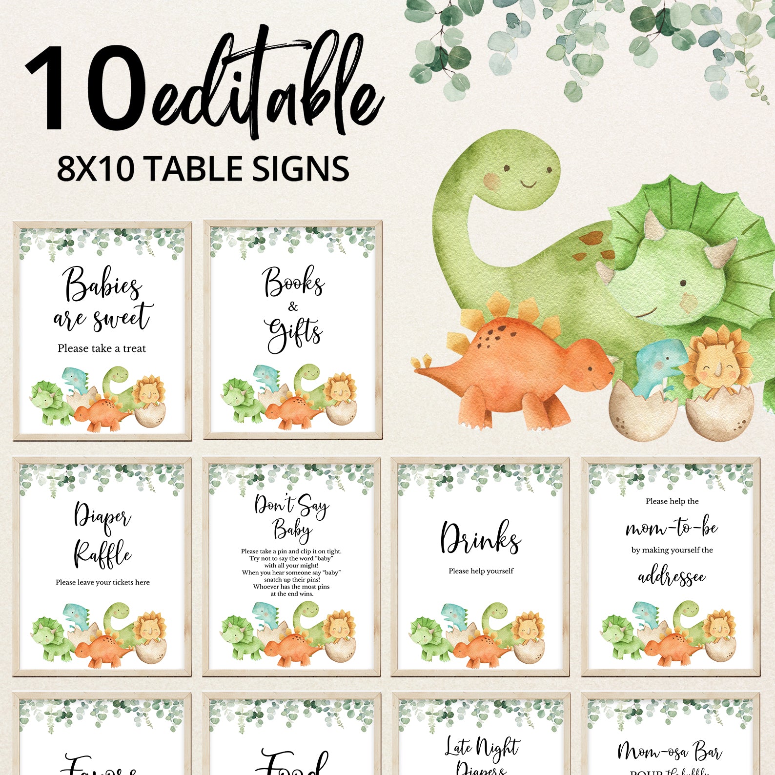 - Purchase this Dinosaur Baby Shower Table Sign with Greenery & Cute Dinos template