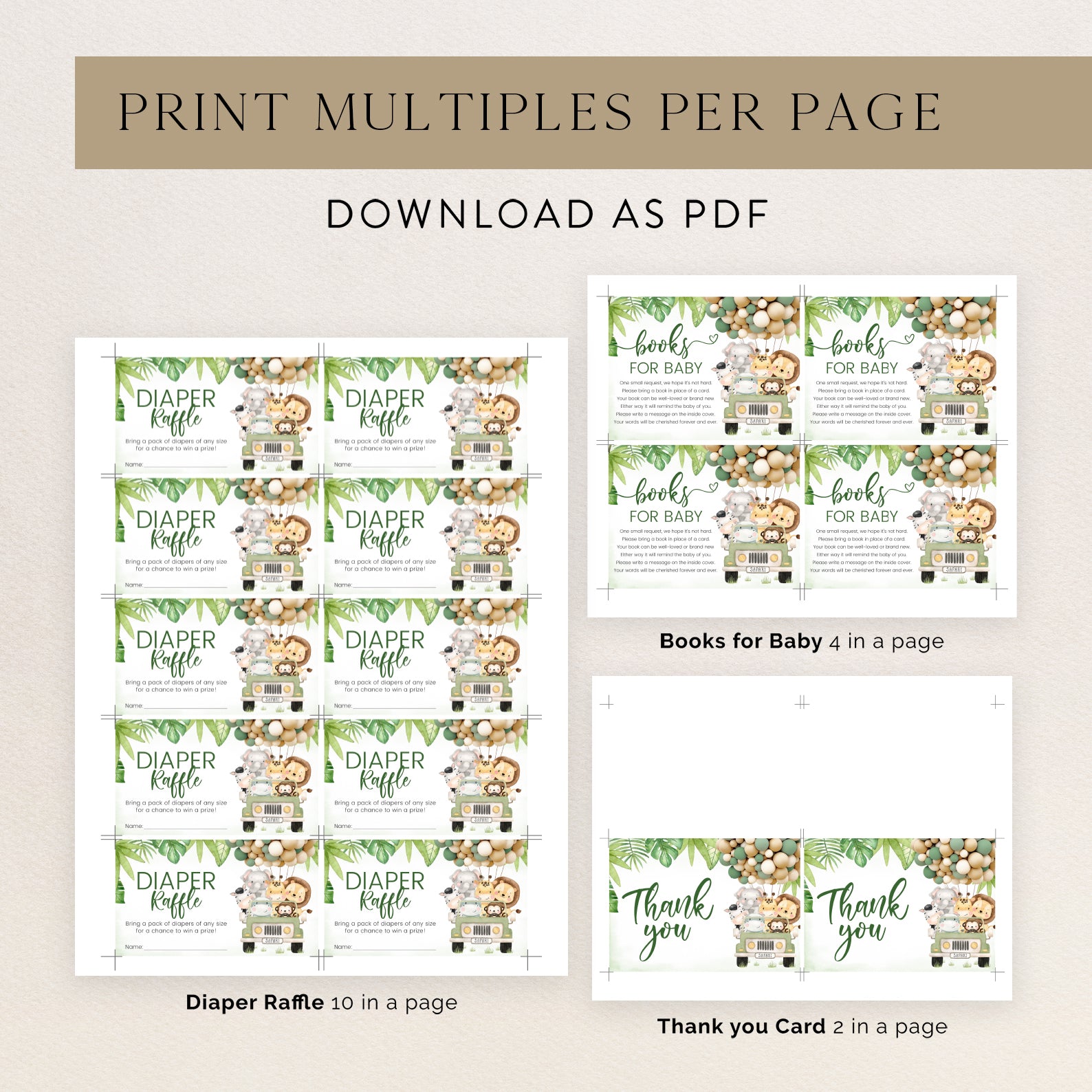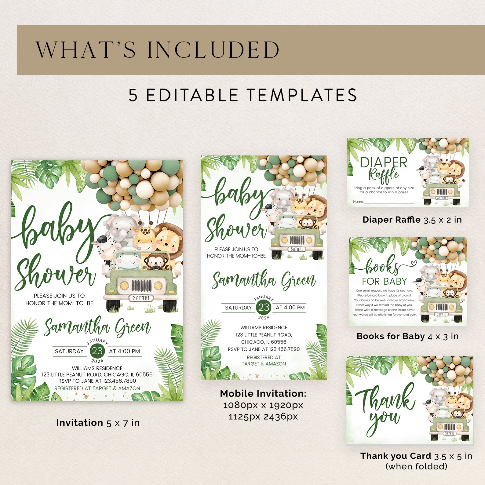 - Purchase this Green Jungle Safari Baby Shower Invite Bundle with Jeep & Animals template