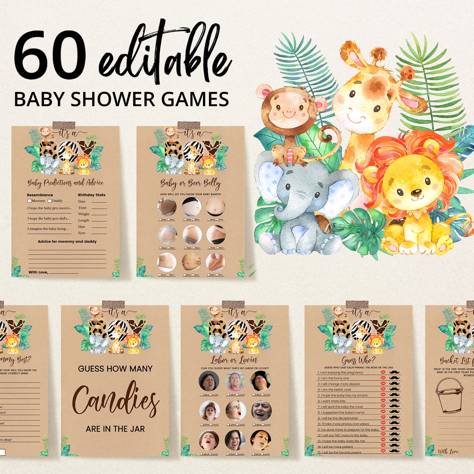 Keep your guests entertained with our Jungle Safari Baby Shower Game Bundle! Featuring a kraft background, greenery, and sweet baby animals, this collection includes 60 editable baby shower games to suit every guest and mood. From word searches to trivia, each game is designed to match your safari theme perfectly. Easy to personalize and print, this bundle makes your celebration interactive, fun, and unforgettable.