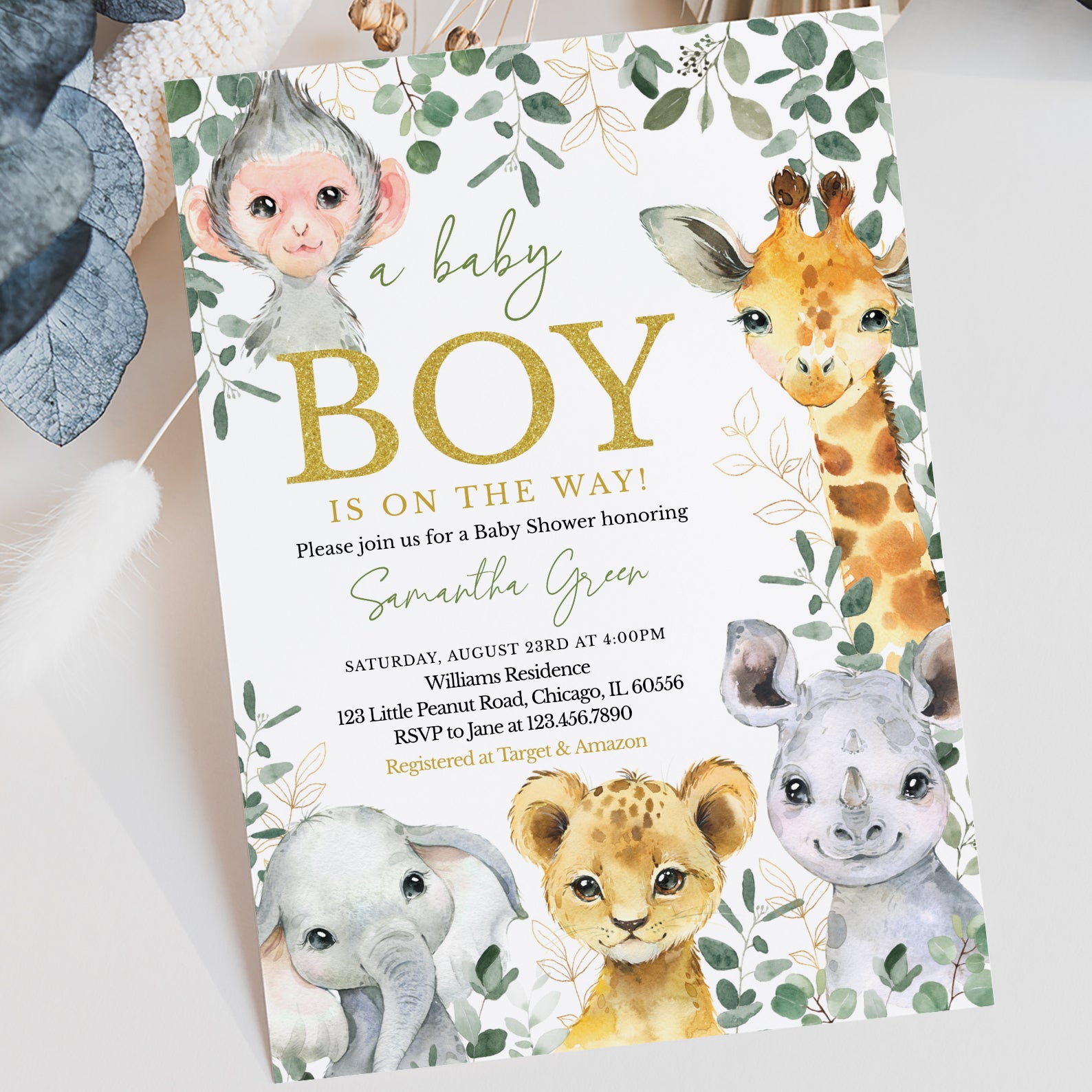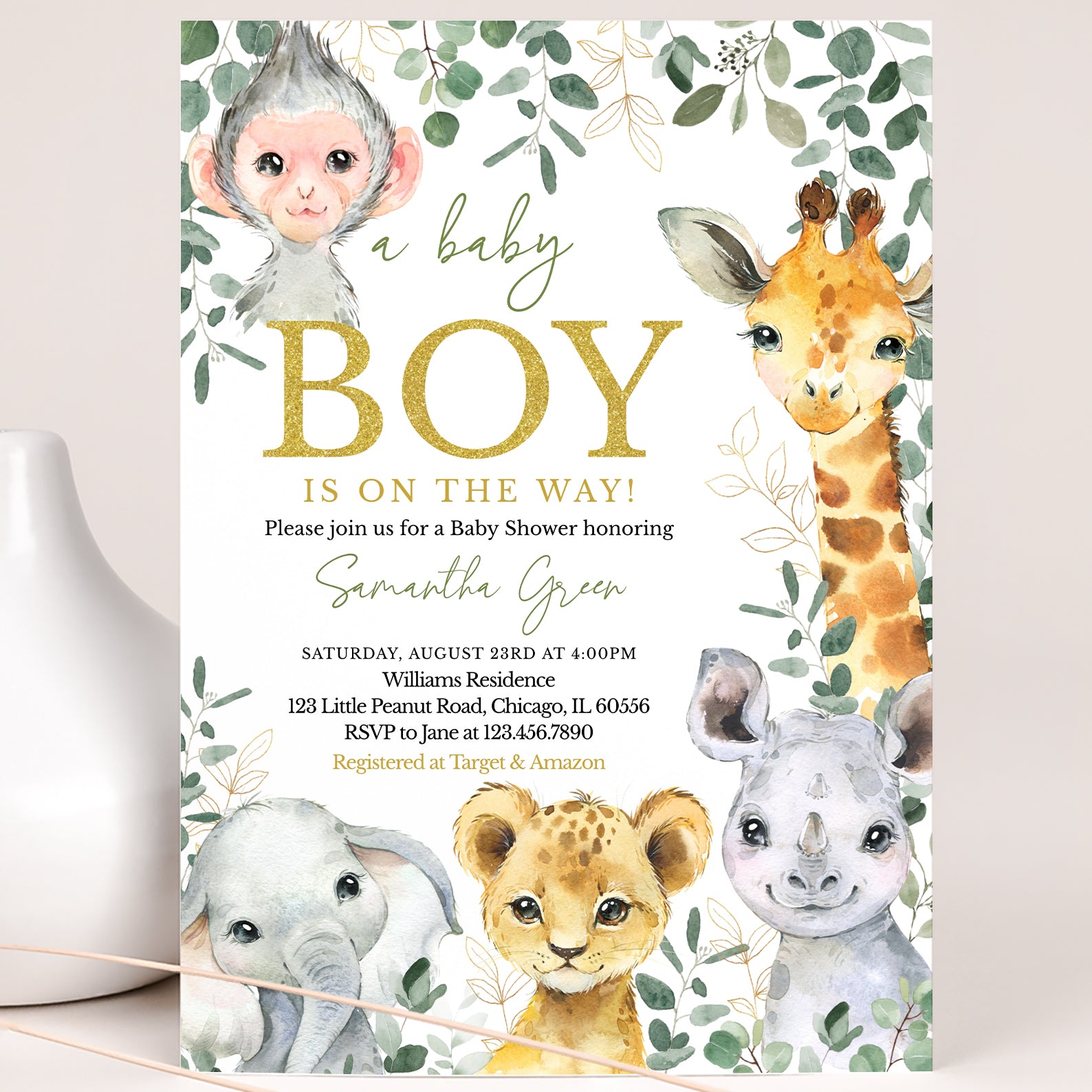 Jungle Safari Baby Shower Invite, Boy Theme in Green & Gold