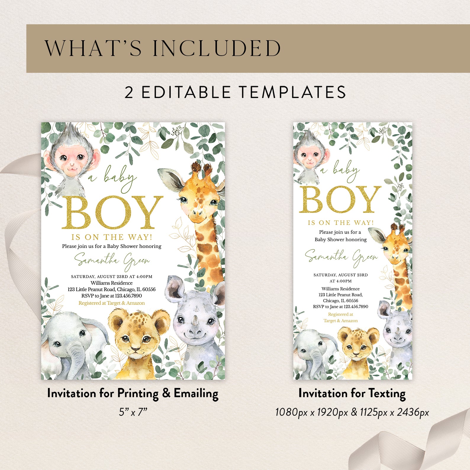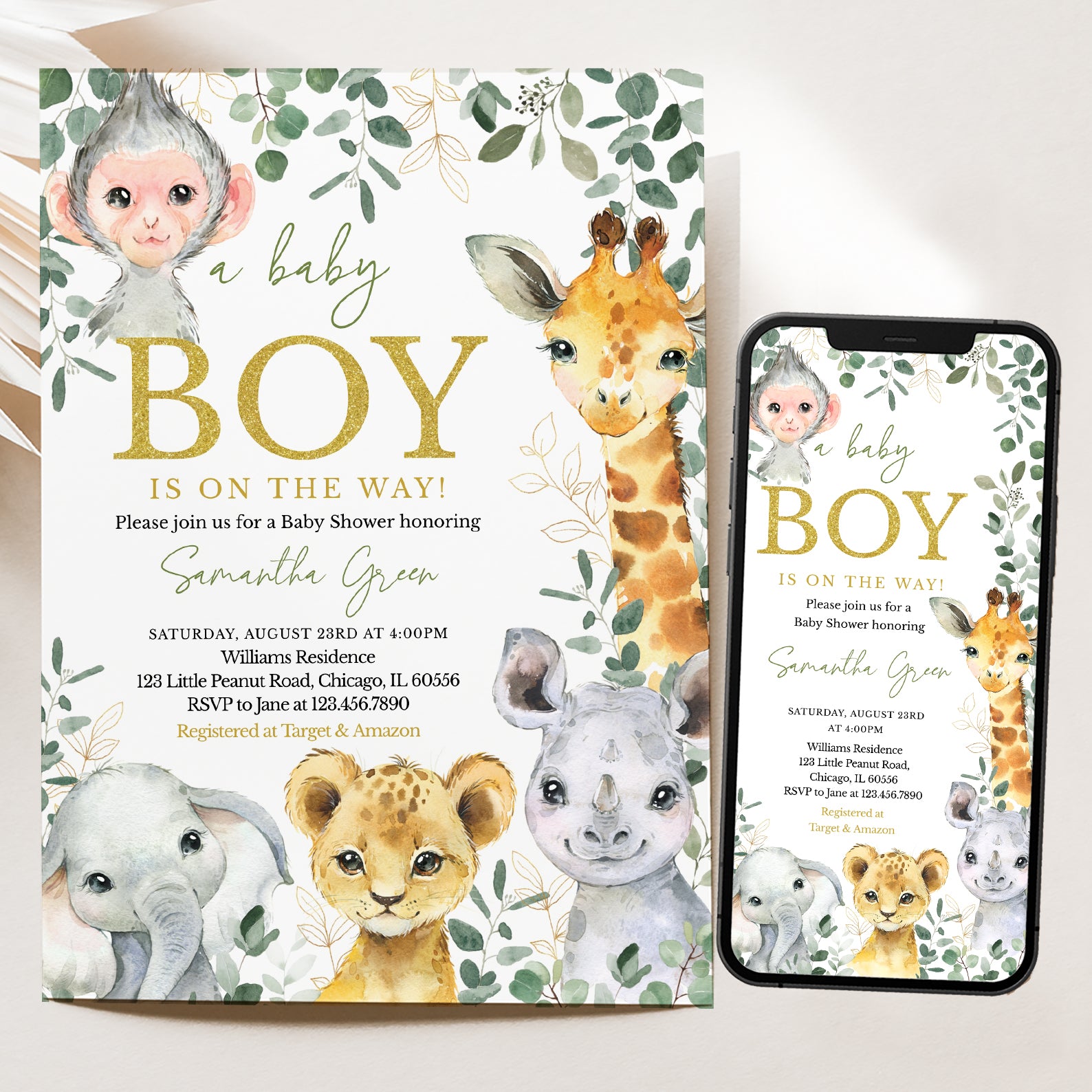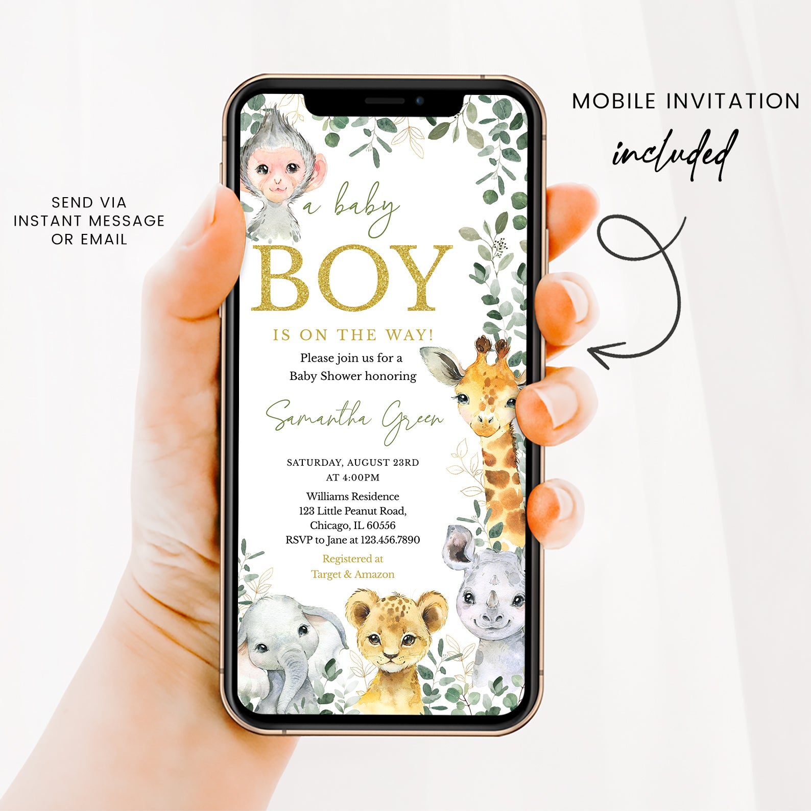 Celebrate the arrival of your little one with our charming baby shower digital invitation, perfect for a baby boy on the way! Featuring an enchanting safari jungle theme, this invitation showcases adorable baby animals like a playful monkey, gentle giraffe, sweet elephant, cuddly lion cub, and a friendly rhino, all beautifully framed by lush green leaves in elegant gold accents. Easy to customize and send, this delightful design sets the tone for a fun and memorable celebration, making it a must-have for your special day!