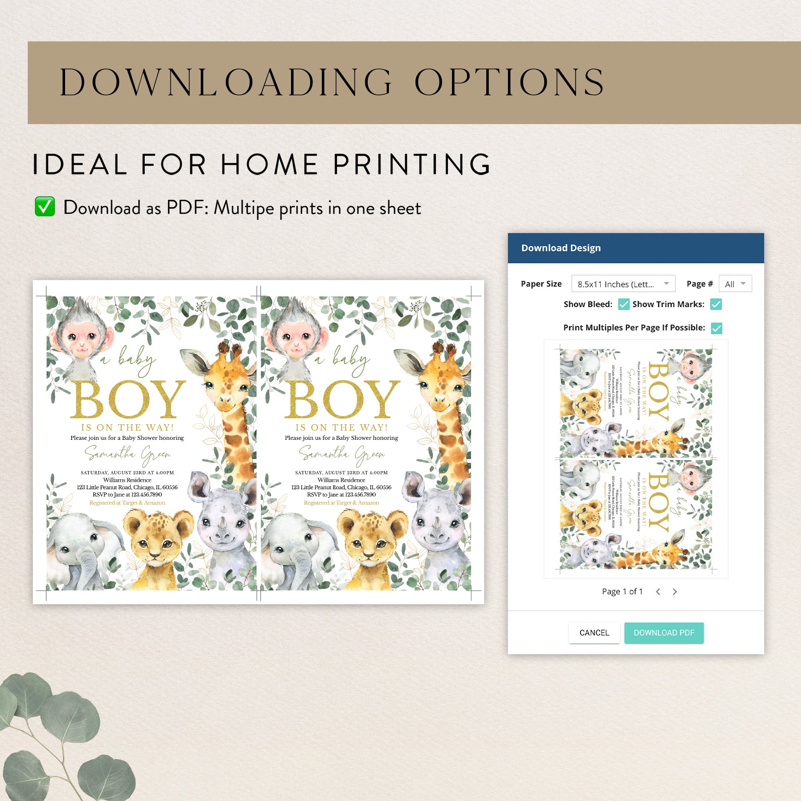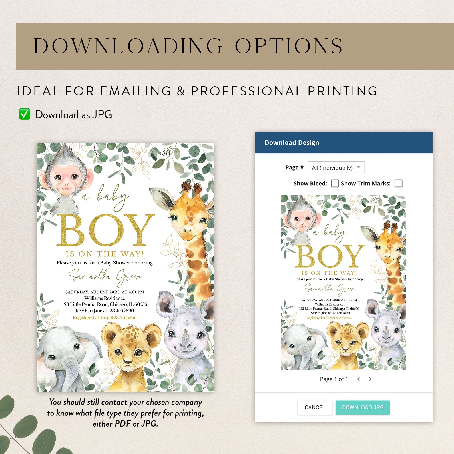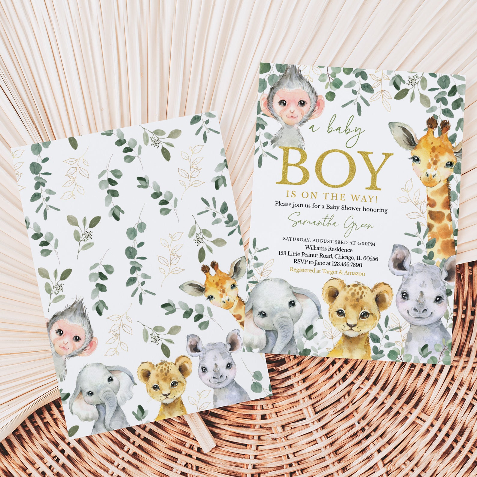 Celebrate the arrival of your little one with our charming baby shower digital invitation, perfect for a baby boy on the way! Featuring an enchanting safari jungle theme, this invitation showcases adorable baby animals like a playful monkey, gentle giraffe, sweet elephant, cuddly lion cub, and a friendly rhino, all beautifully framed by lush green leaves in elegant gold accents. Easy to customize and send, this delightful design sets the tone for a fun and memorable celebration, making it a must-have for your special day!