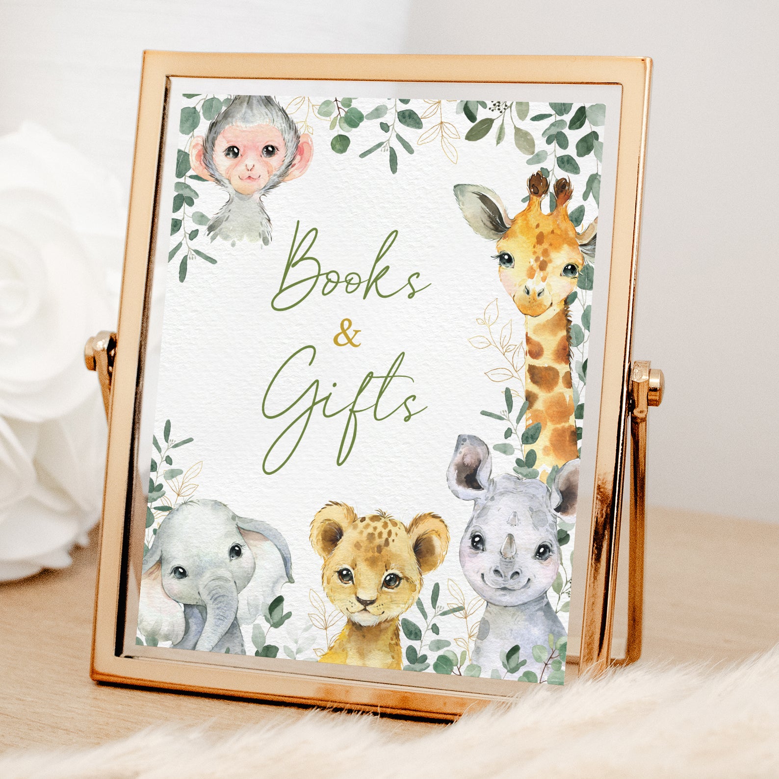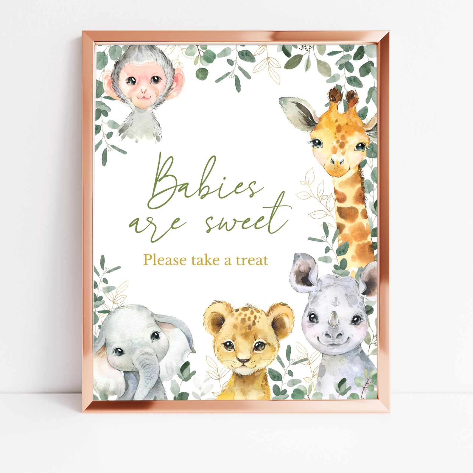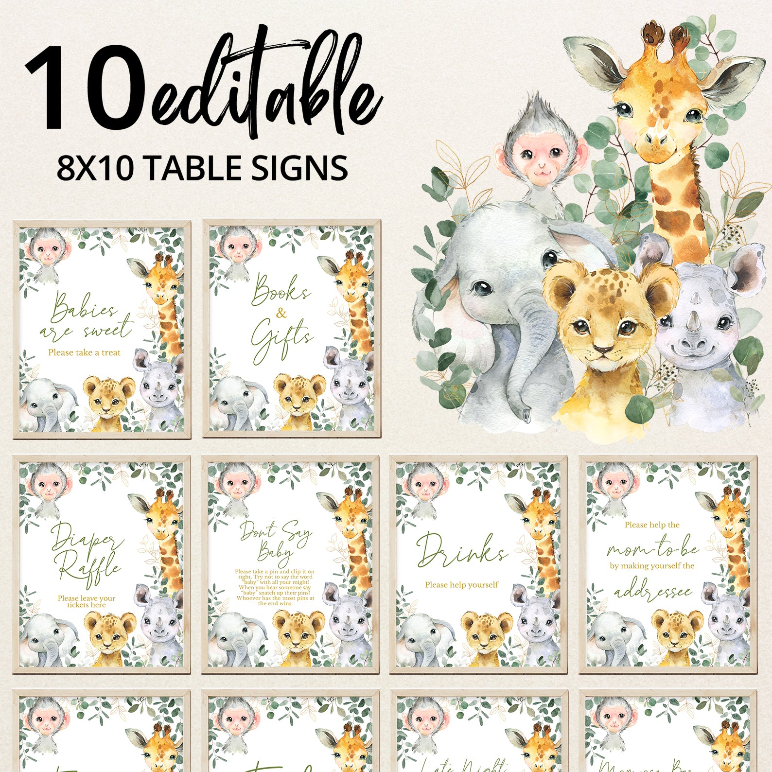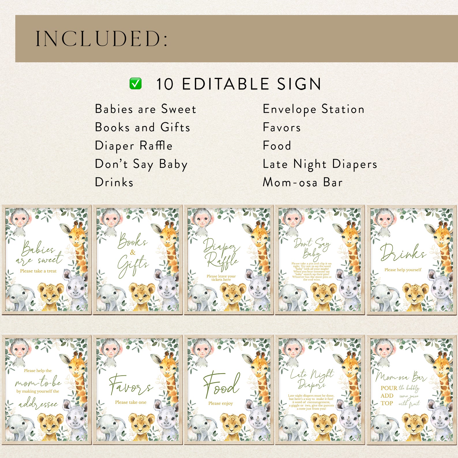 Complete your safari-themed baby shower with this charming set of ten editable table signs! Featuring adorable baby animals like a playful monkey, gentle giraffe, sweet elephant, cuddly lion cub, and friendly rhino, each sign is framed by lush green leaves and elegant gold accents. This set includes: Babies Are Sweet, Books and Gifts, Diaper Raffle, Don't Say Baby, Drinks, Envelope Station, Favors, Food, Late Night Diapers, and Mom-osa Bar signs—perfect for adding a fun and cohesive touch to your celebration!