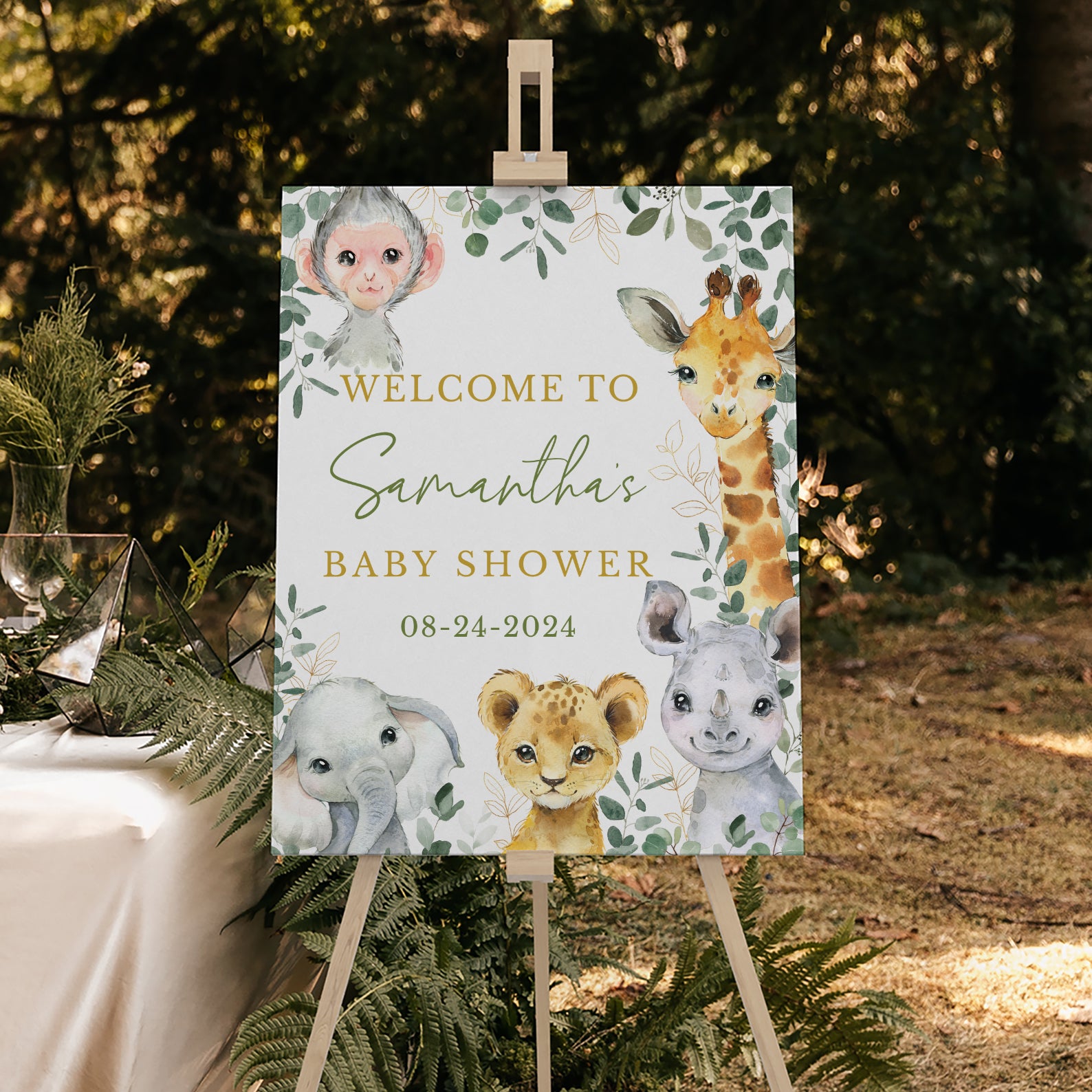 Welcome guests to your baby shower with this adorable Jungle Safari-themed sign! Designed with sweet baby animals, lush green leaves, and elegant gold accents, it’s the perfect way to greet friends and family as they celebrate your little boy on the way.