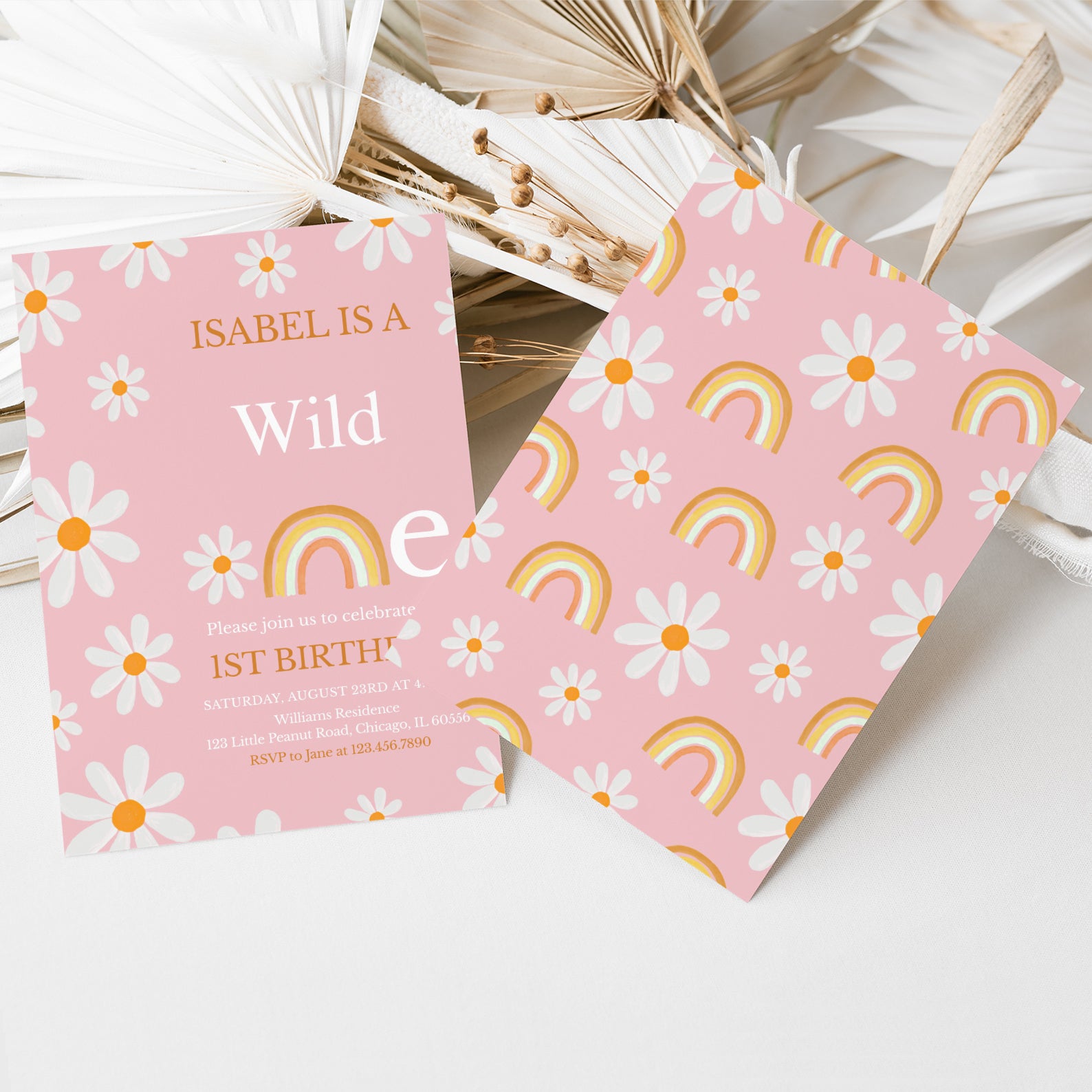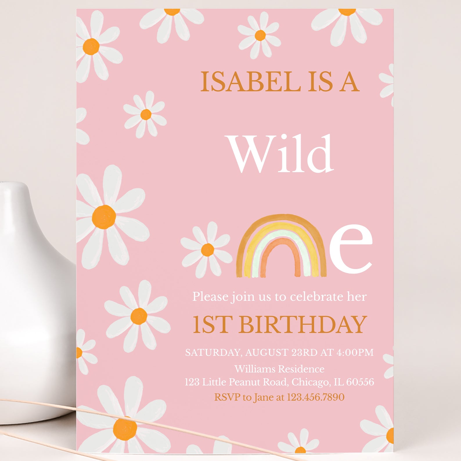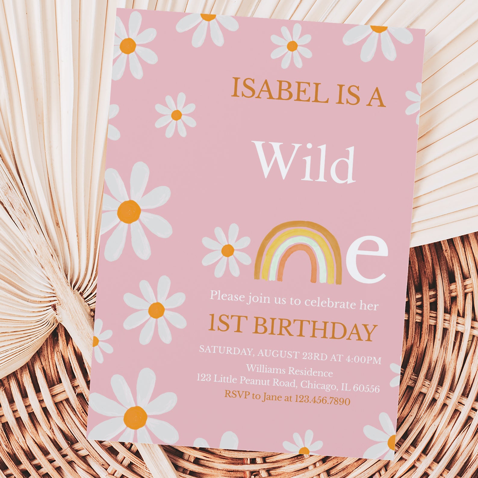 - Purchase this Wild One Digital Birthday Invite with Rainbow & Daisies on Pink template