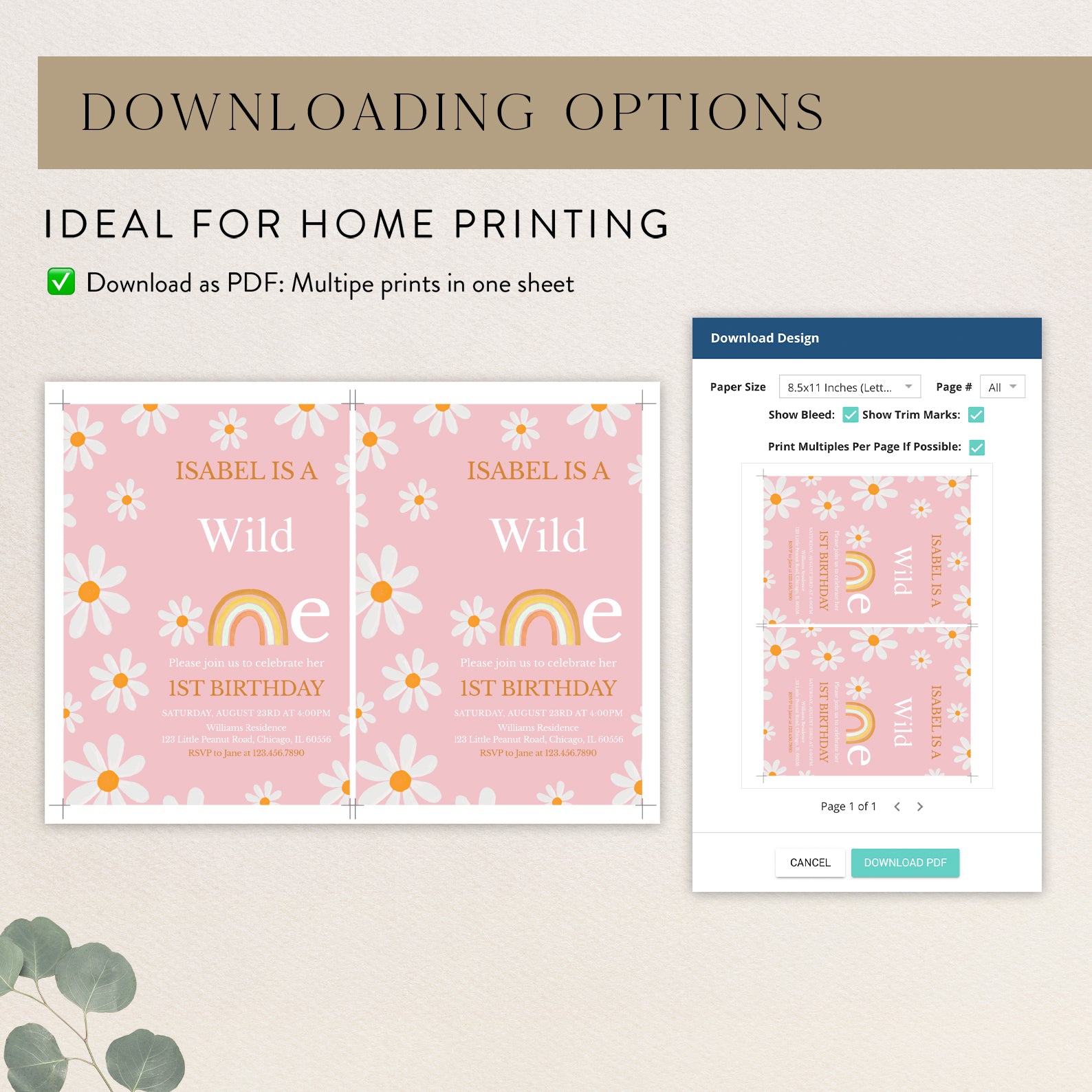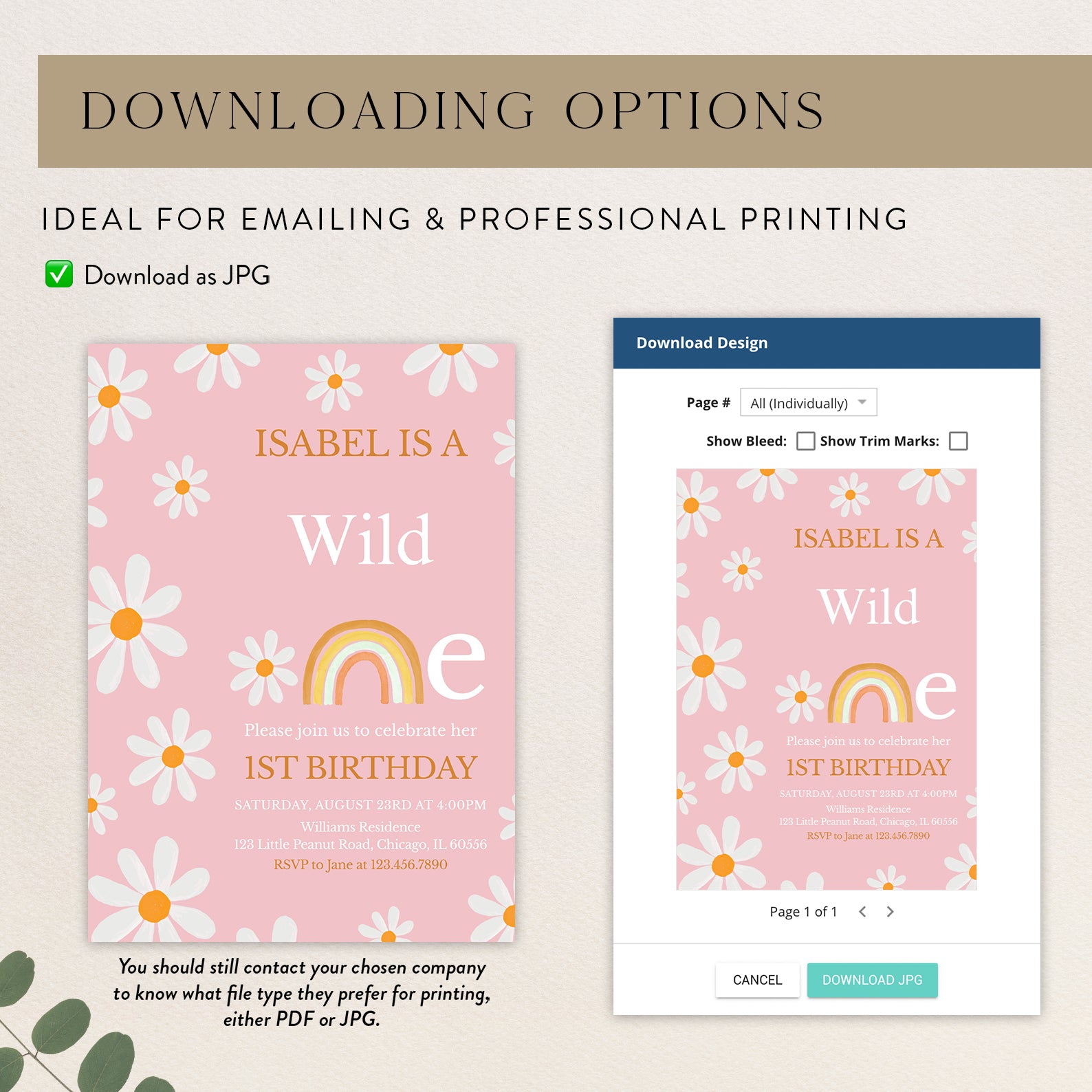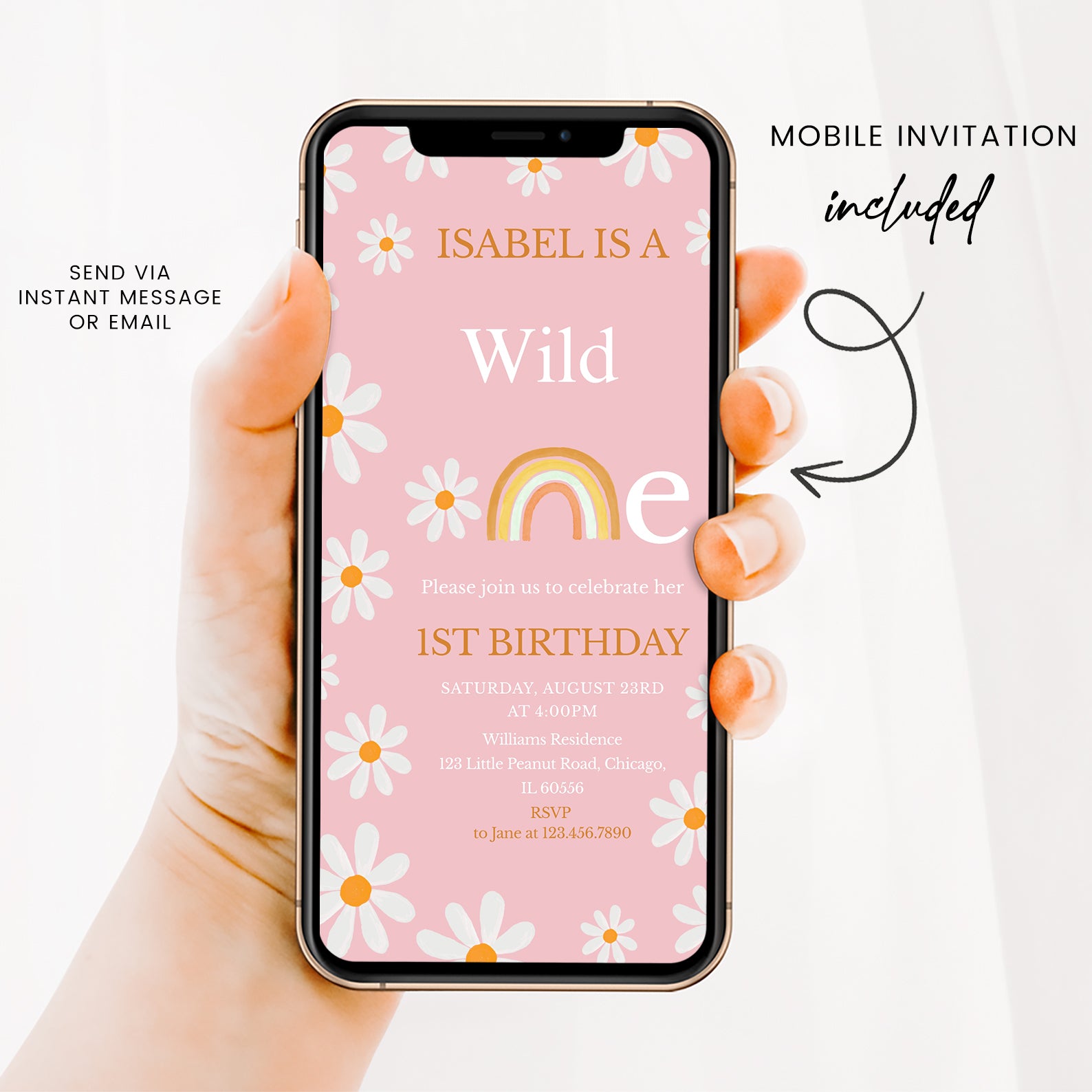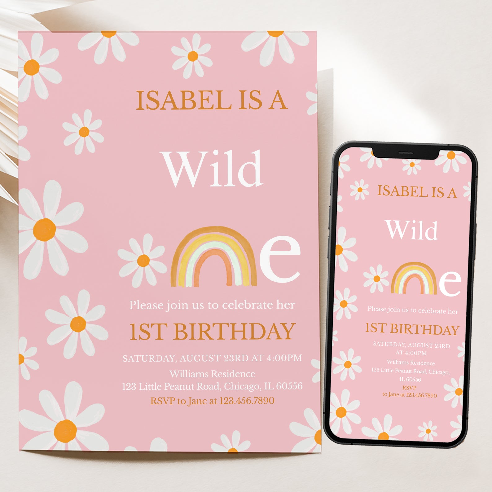 - Purchase this Wild One Digital Birthday Invite with Rainbow & Daisies on Pink template