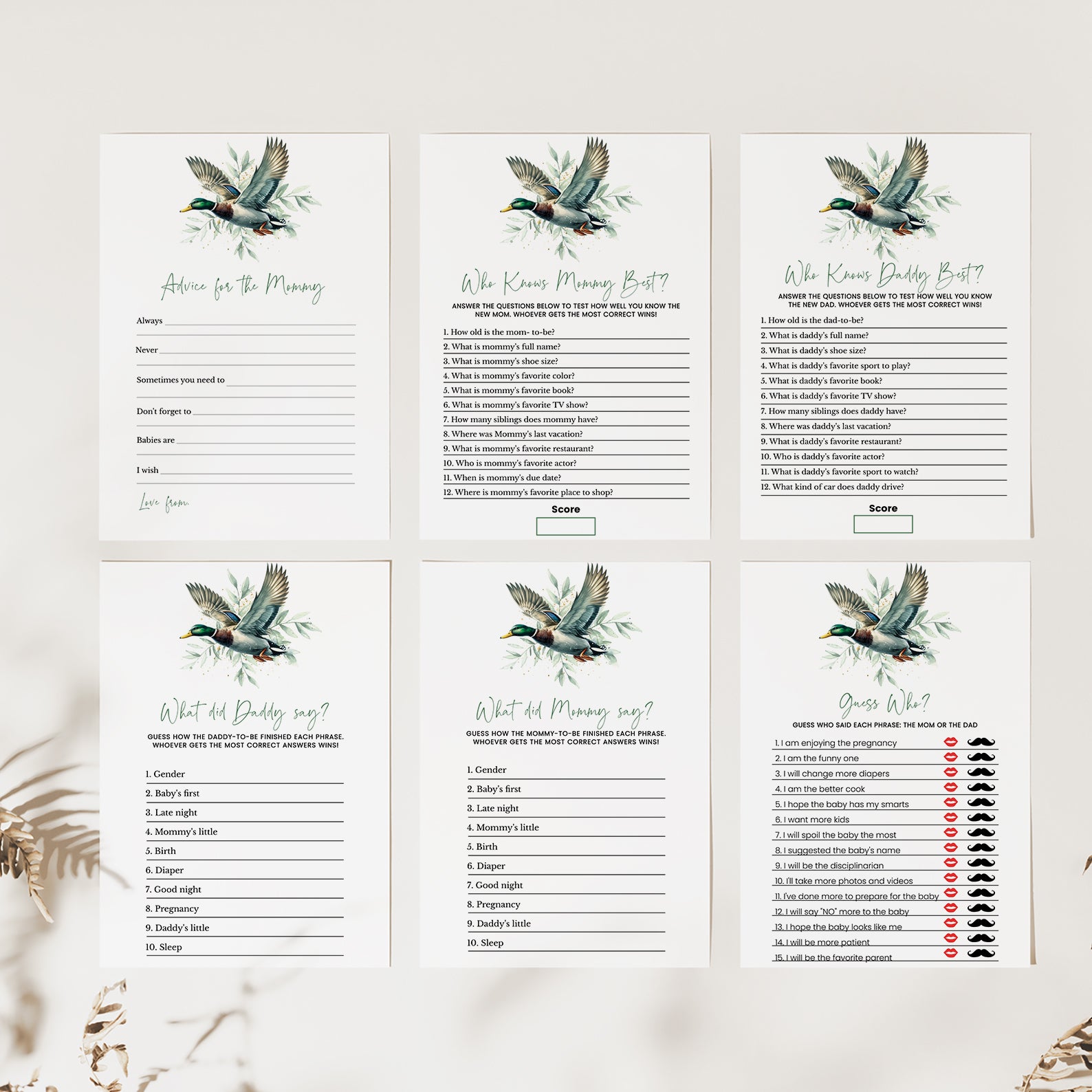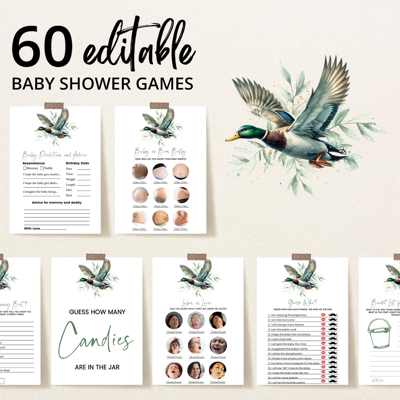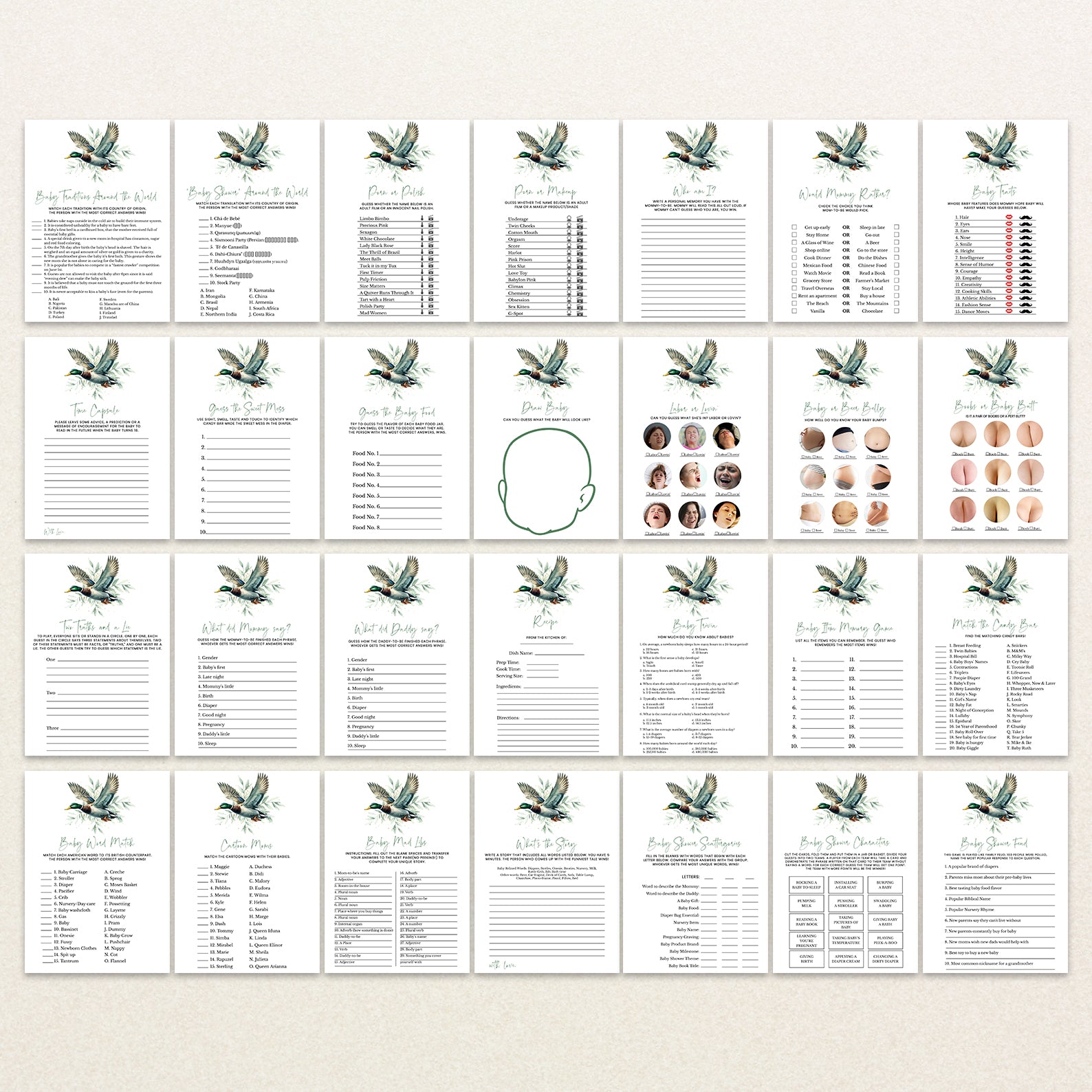 Add a touch of nature and charm to your celebration with this delightful bundle of 60 editable baby shower games, designed to complement a minimalist mallard duck and green leaves theme. With a serene and elegant design, this collection brings the beauty of the outdoors to your event. Fully customizable, each game can be tailored to fit your shower's unique style. Whether you're hosting a peaceful garden gathering or an outdoor celebration, this bundle fills your special day with fun, laughter, and the excitement of new beginnings.