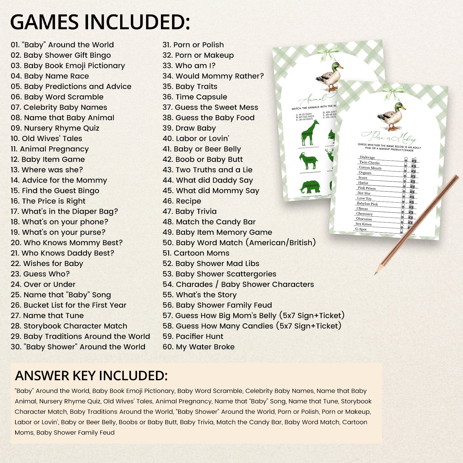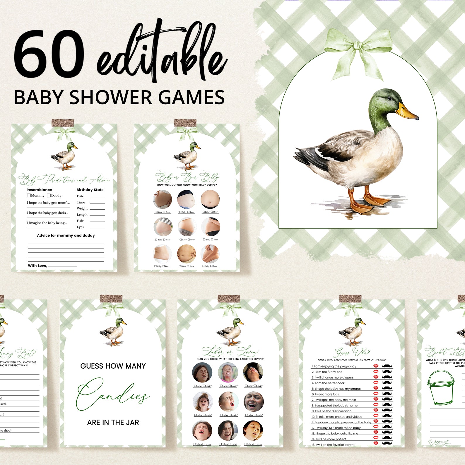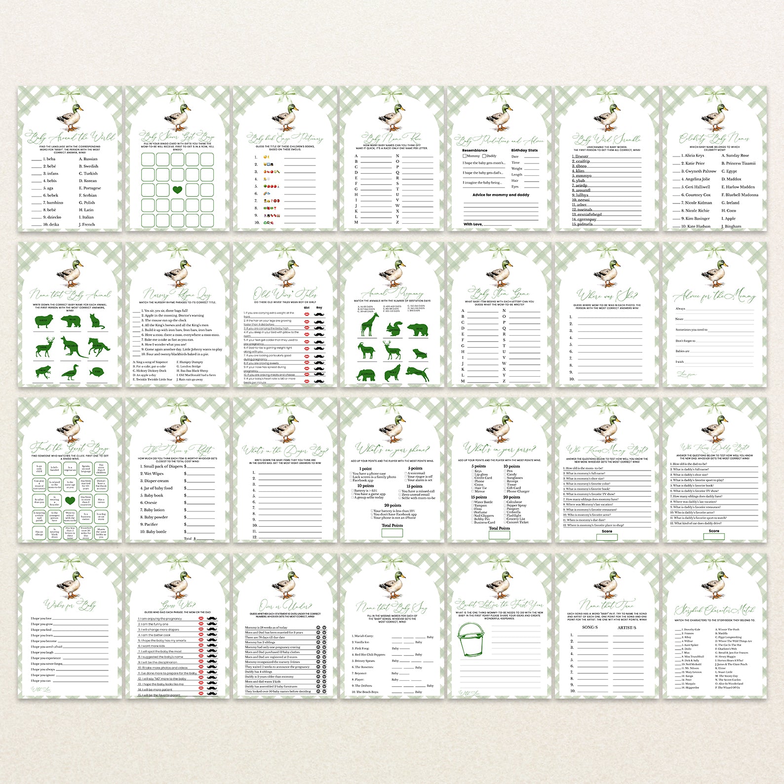 Make your baby shower a quacking good time with this fun bundle of 60 editable baby shower games, designed to complement a delightful green plaid and mallard duck theme. Featuring playful designs, elegant green accents, and a whimsical touch, this collection brings joy and excitement to your celebration. Each game is fully customizable, allowing you to personalize it to fit the unique style of your event. Whether you're hosting a rustic outdoor gathering or a cozy indoor shower, this bundle adds plenty of fun and laughter to your special day!