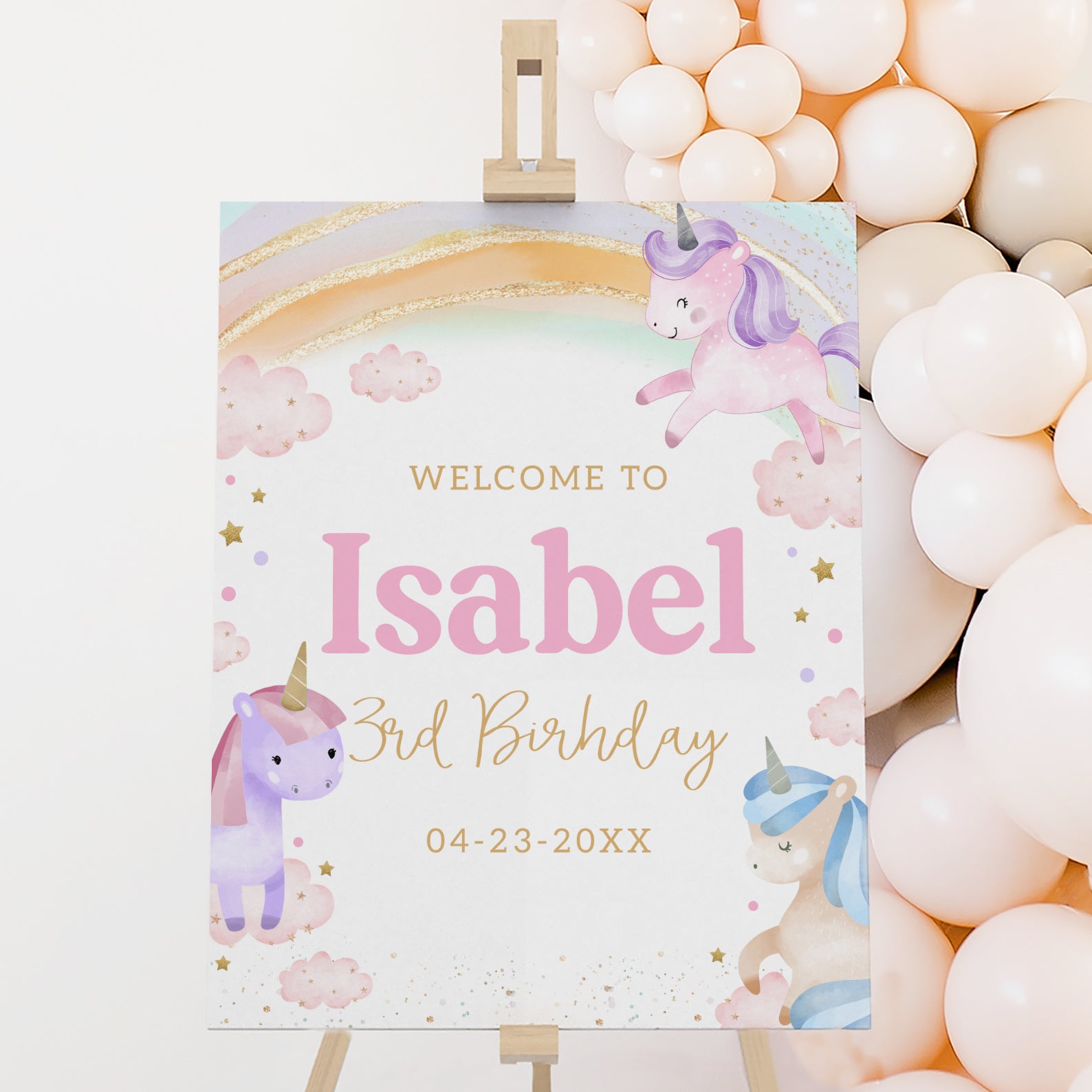 Add a touch of magic to your child’s 3rd birthday with this whimsical welcome sign! Designed with playful unicorns dancing among soft clouds, colorful rainbows, sparkling stars, and elegant gold accents, this sign creates an enchanting entrance for your little one’s special celebration. Whether displayed at the party entrance or dessert table, it sets the perfect tone for a dreamy, unicorn-themed birthday full of wonder and joy. A beautiful way to greet guests and make your child's magical day feel truly unforgettable!