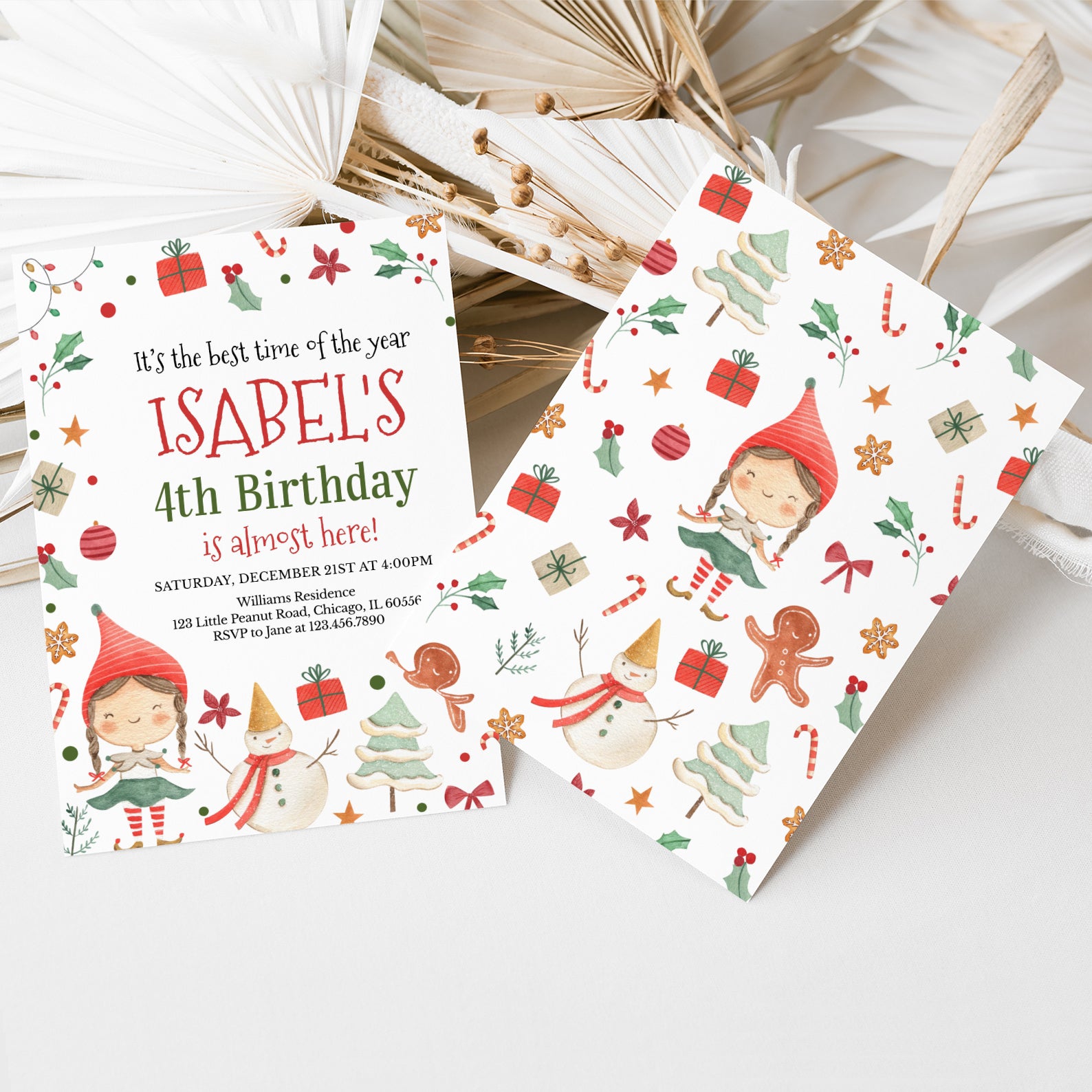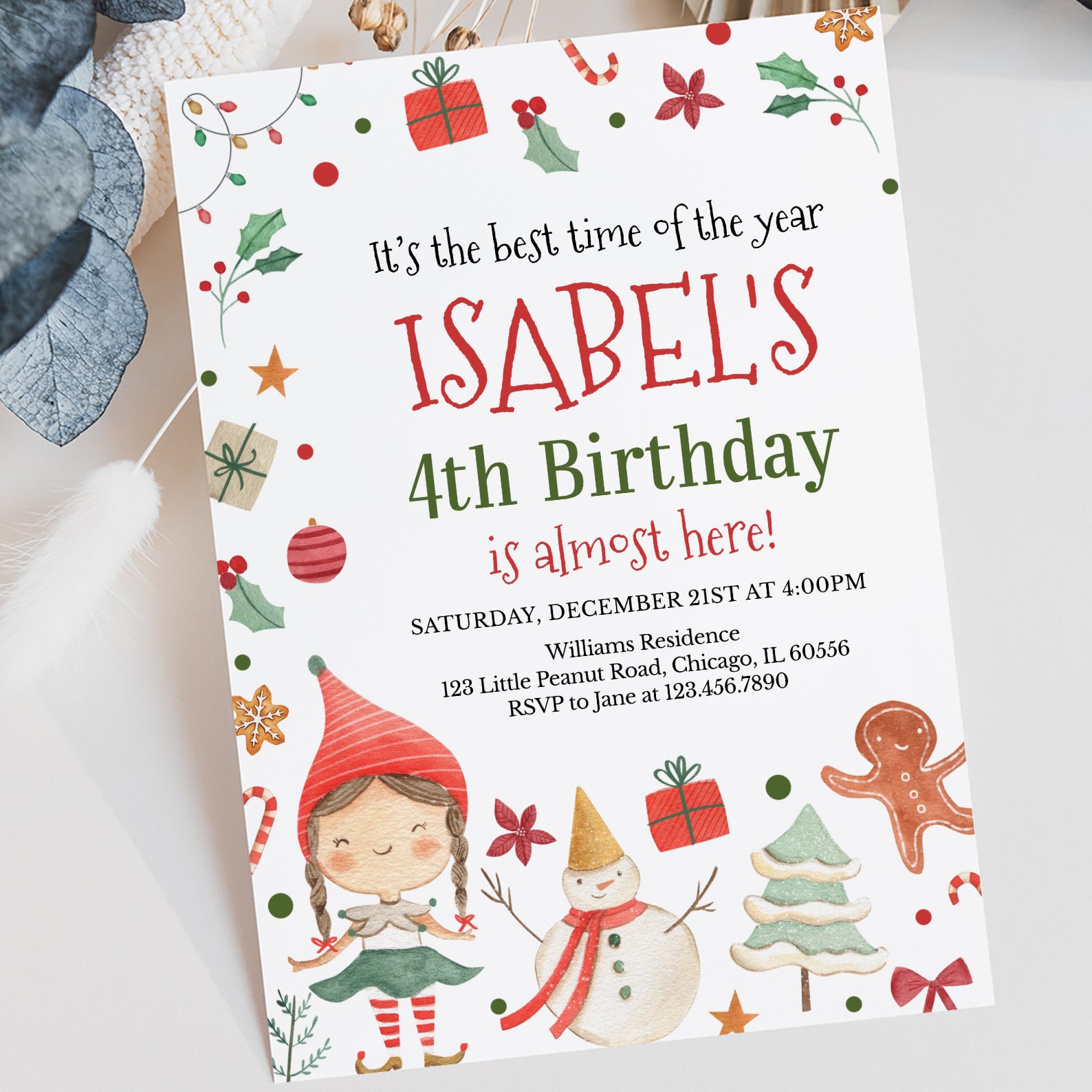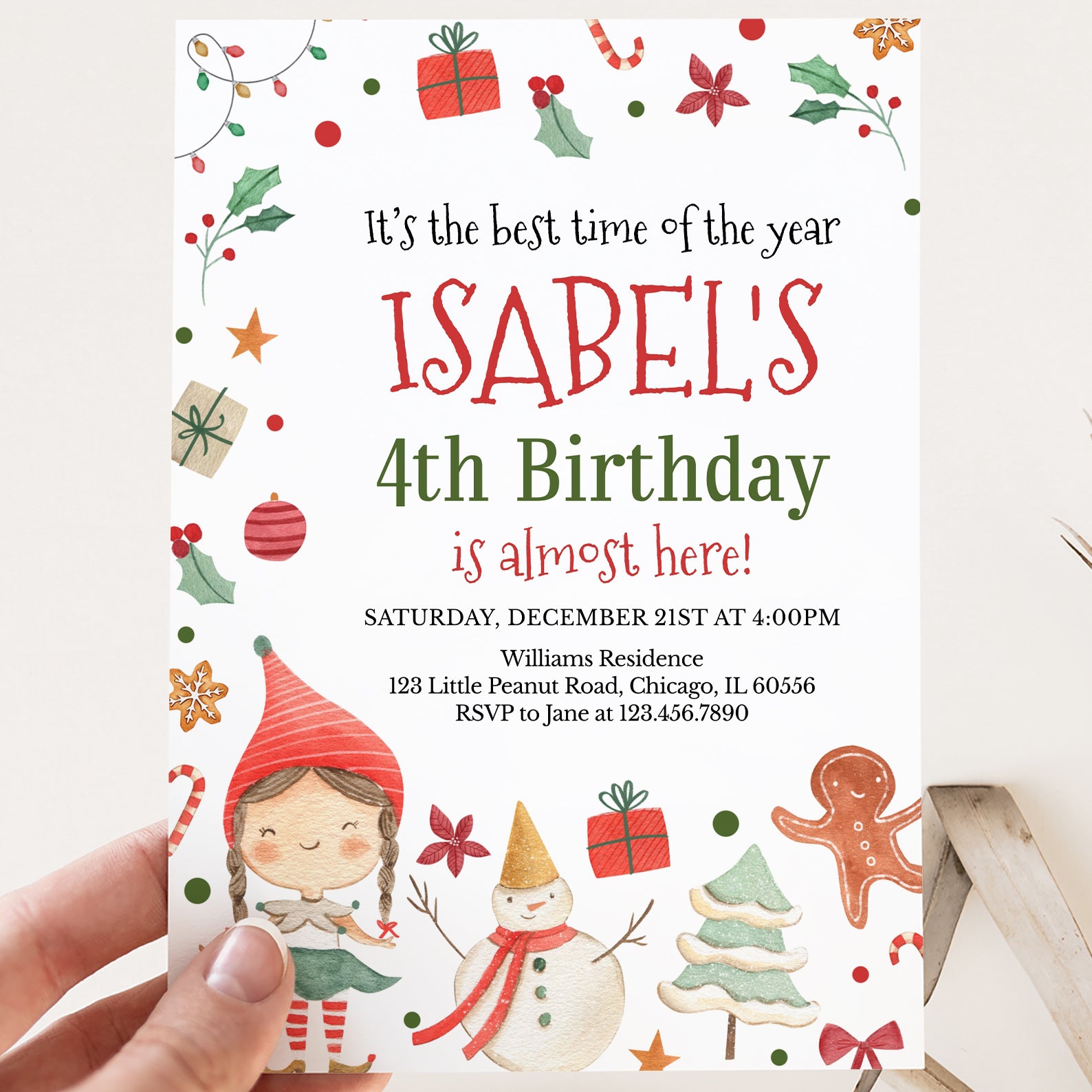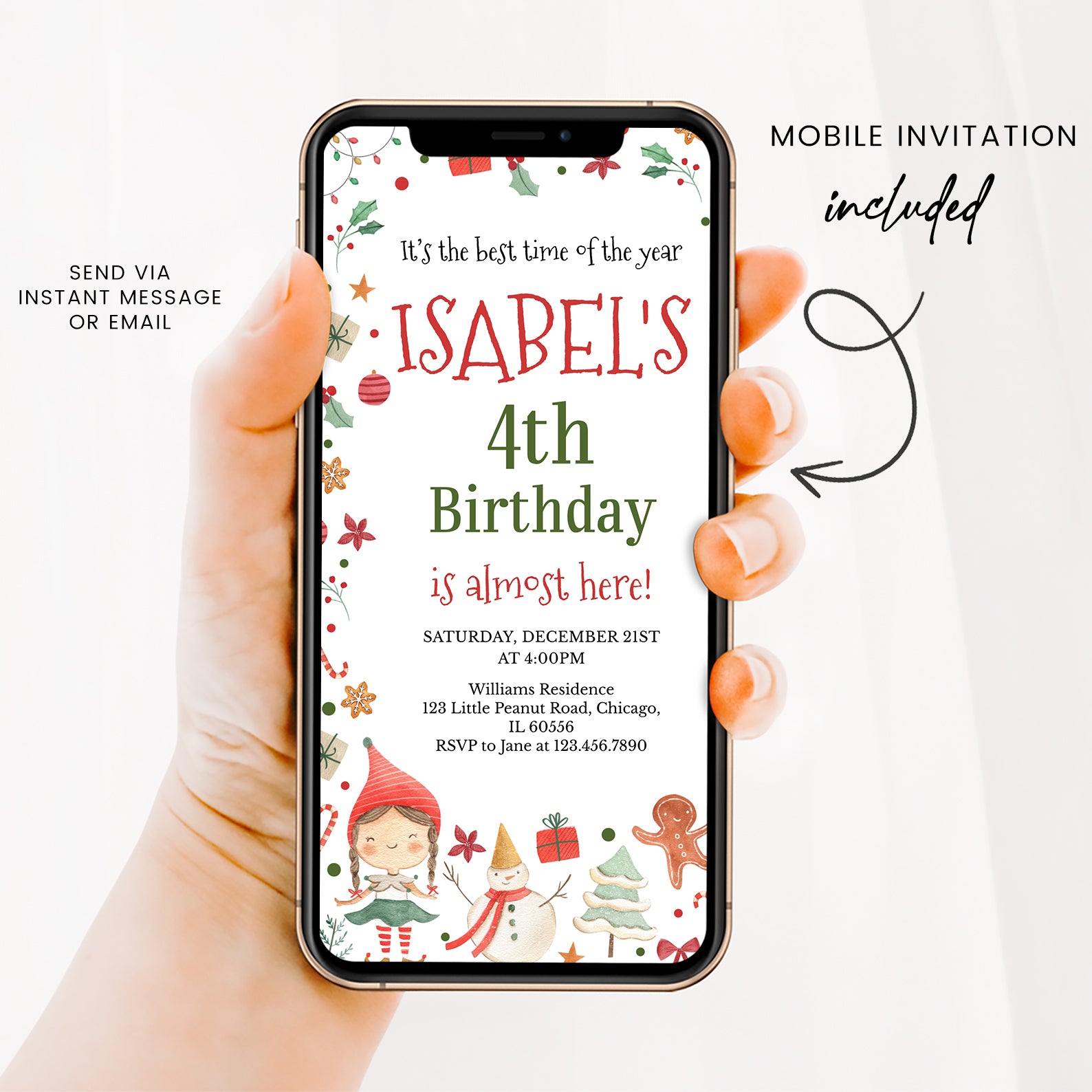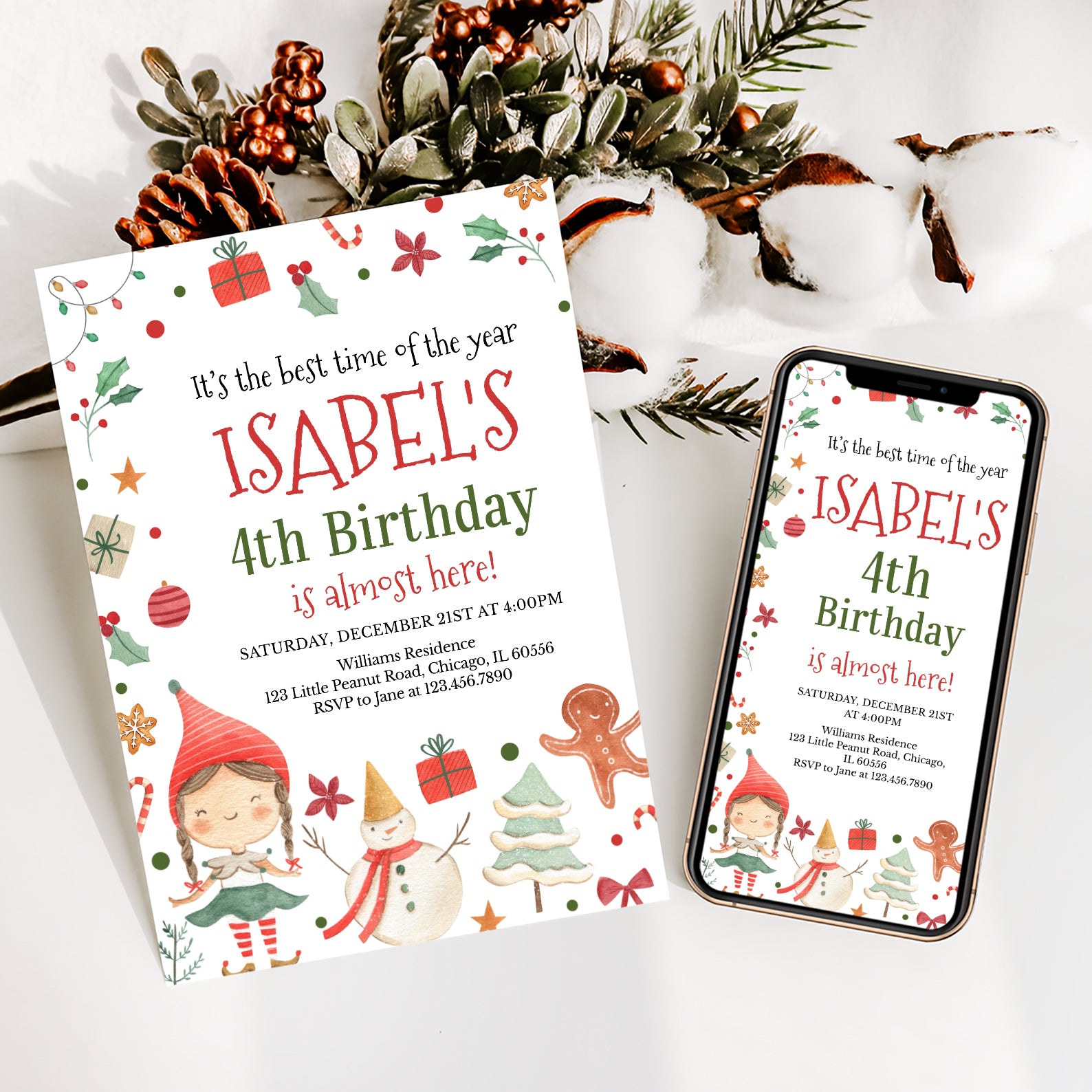 Celebrate your little one's 4th birthday in style with our enchanting winter birthday digital invitation! Adorned with festive Christmas leaves, twinkling lights, candy canes, and delightful gifts, this invitation sets the perfect tone for a magical celebration. Featuring a charming girl elf, a cheerful snowman in a party hat, and a whimsical gingerbread man, it captures the joy of the season while inviting friends and family to join in the fun. Make your child's special day unforgettable with this beautifully designed invitation that brings holiday cheer to every guest!