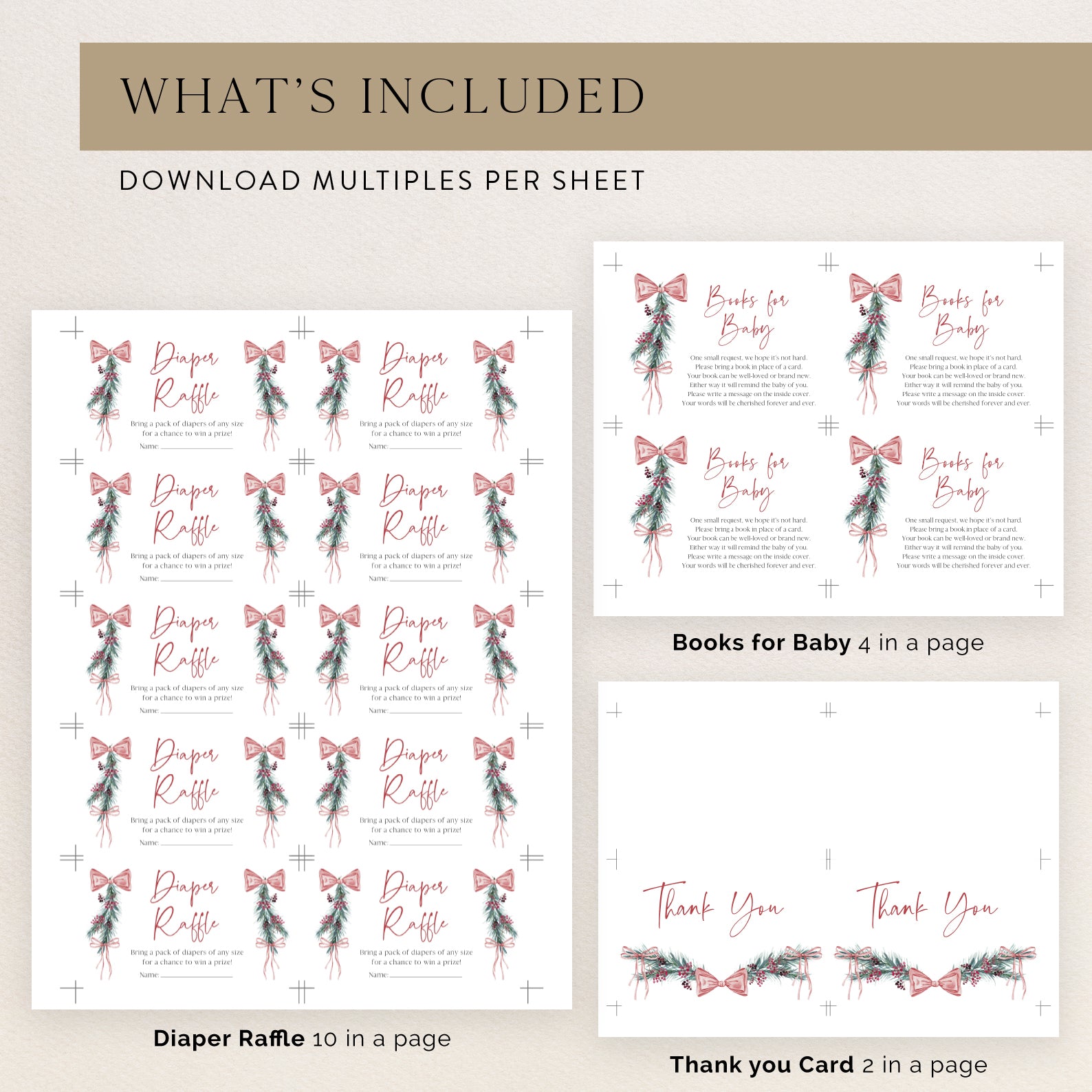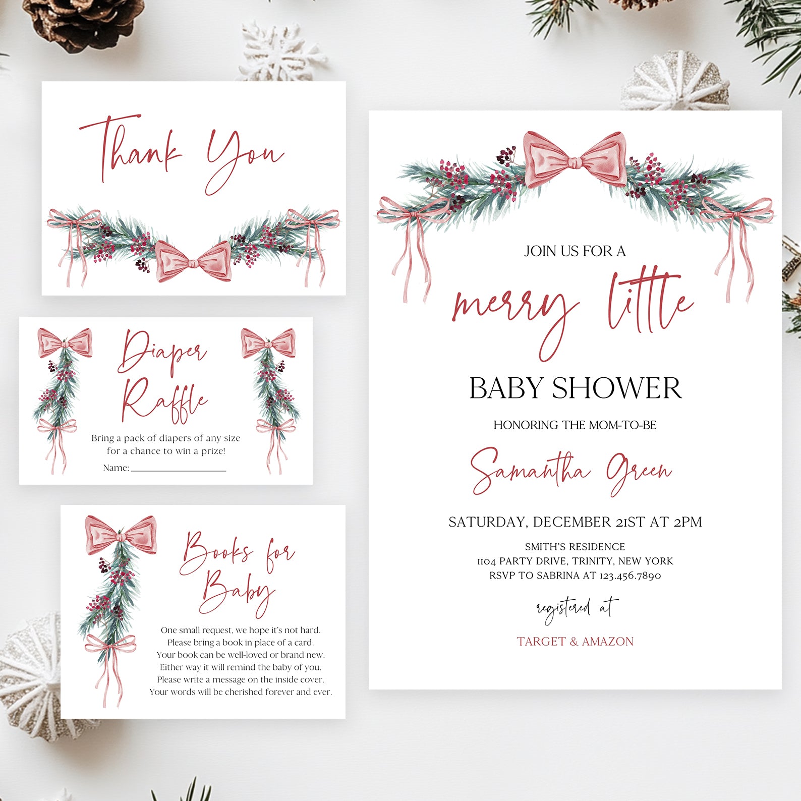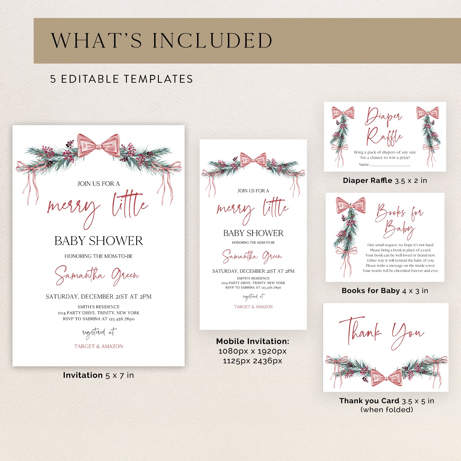 Welcome the joy of new beginnings with our Merry Little Winter Baby Shower invitation bundle! This delightful set includes an invitation, mobile invite, diaper raffle, books for baby cards, and thank you cards, all featuring a minimalist design with a charming Christmas garland and soft pink ribbons. Easy to customize and share, this bundle adds a festive touch to your celebration while inviting loved ones to join in the warmth and excitement of welcoming your little one!